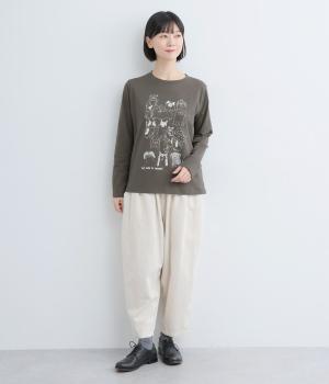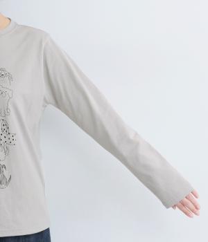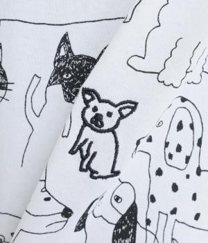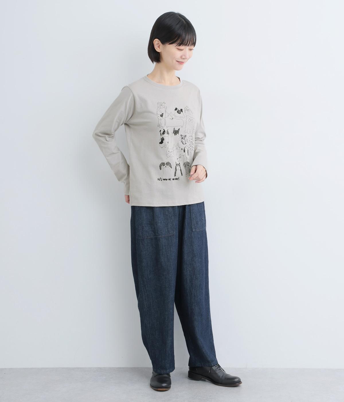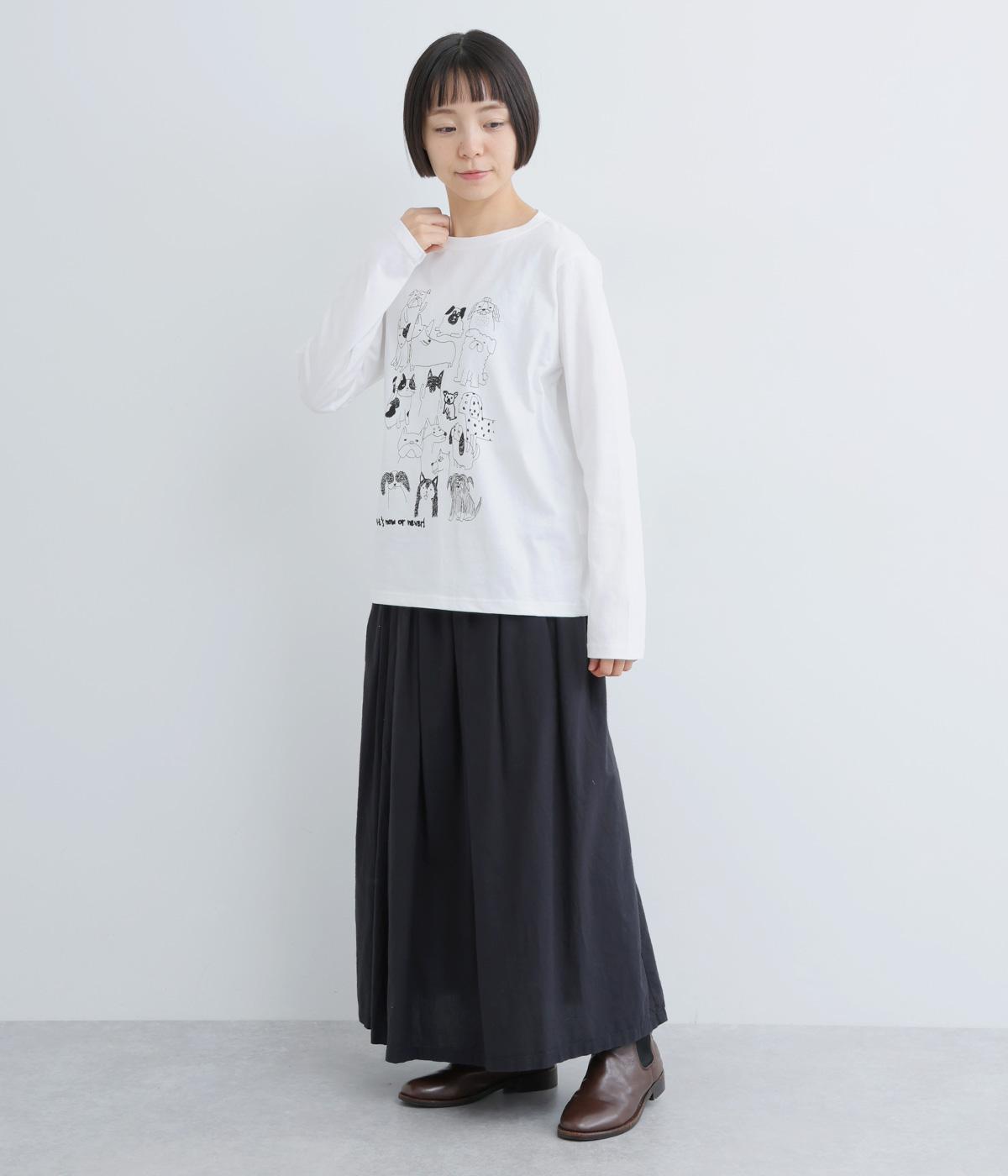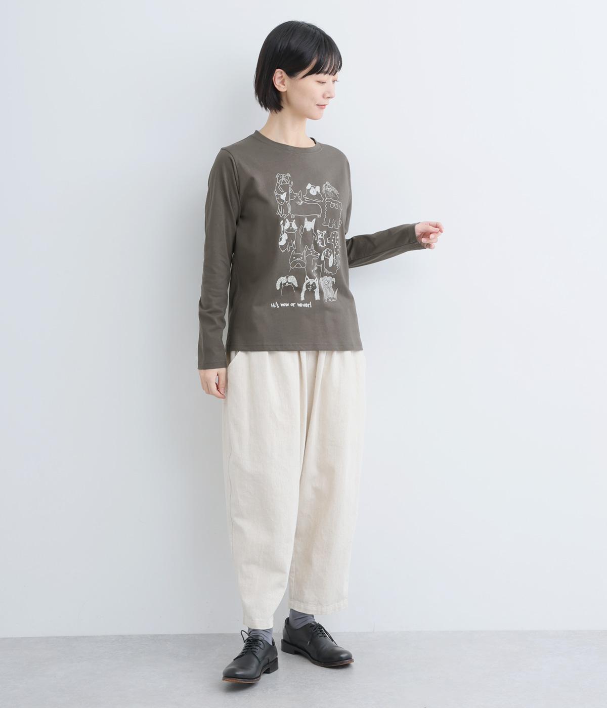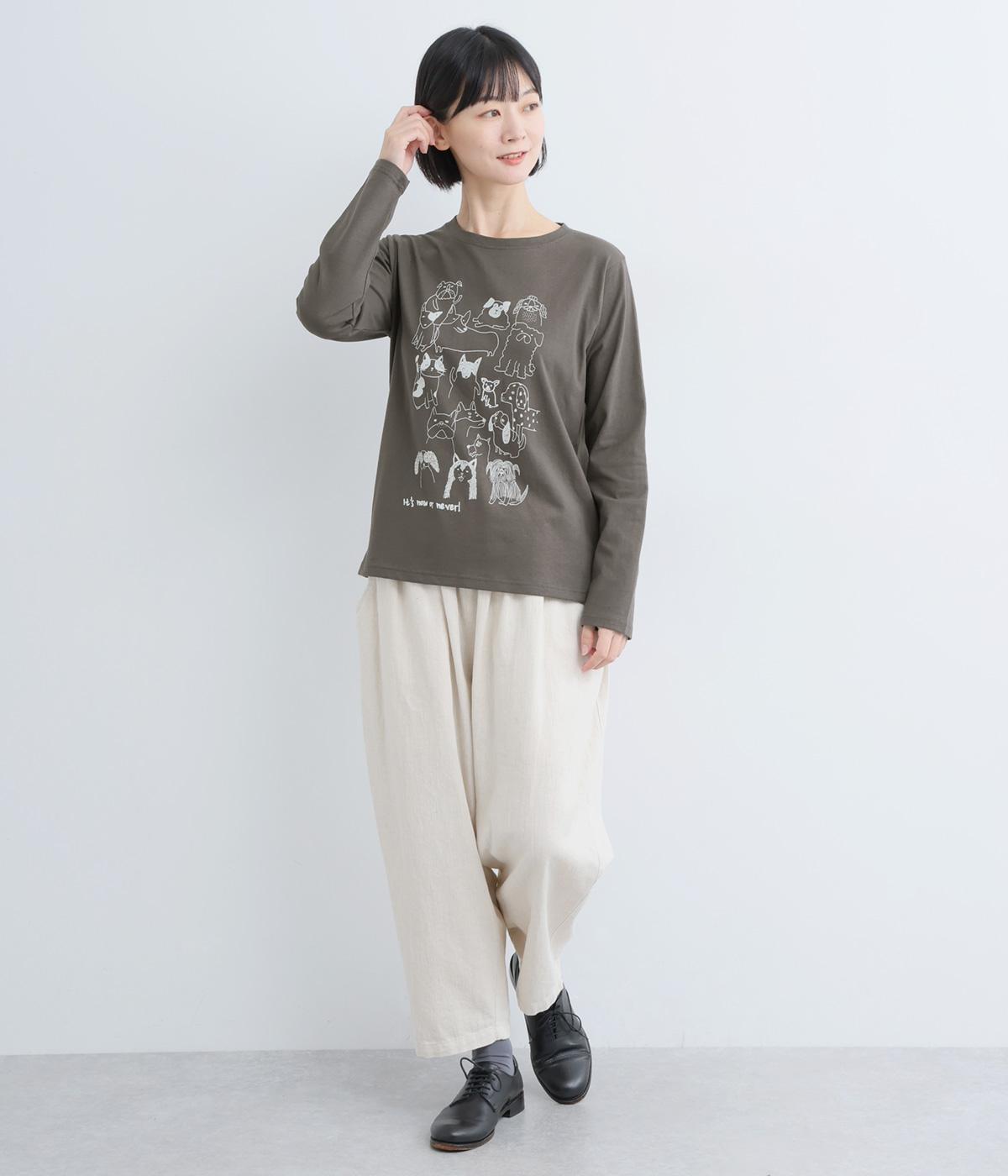 定番のスタイルに犬の絵がプリントされた遊び心のある一着。アクセントにもなる絵柄は落書き風でリラックス感溢れるタッチです。アーティスティックな雰囲気の犬と猫たちを主役に、シンプルに着こなしたいアイテムです。
