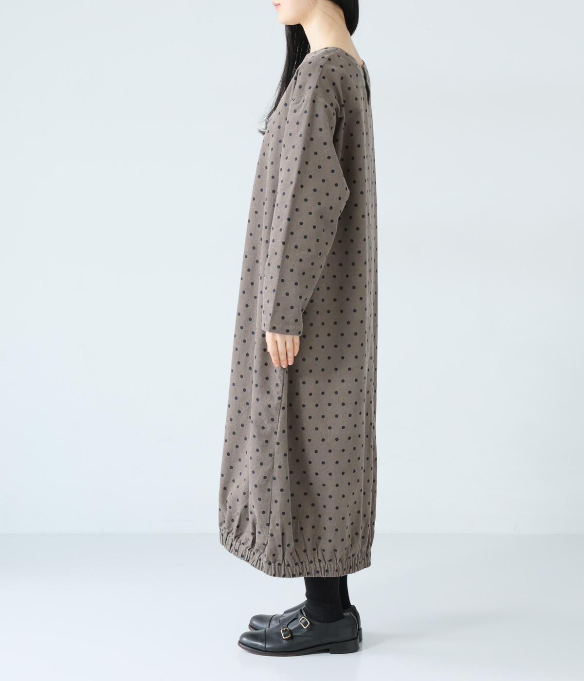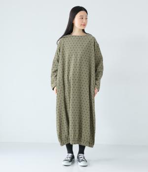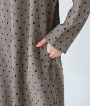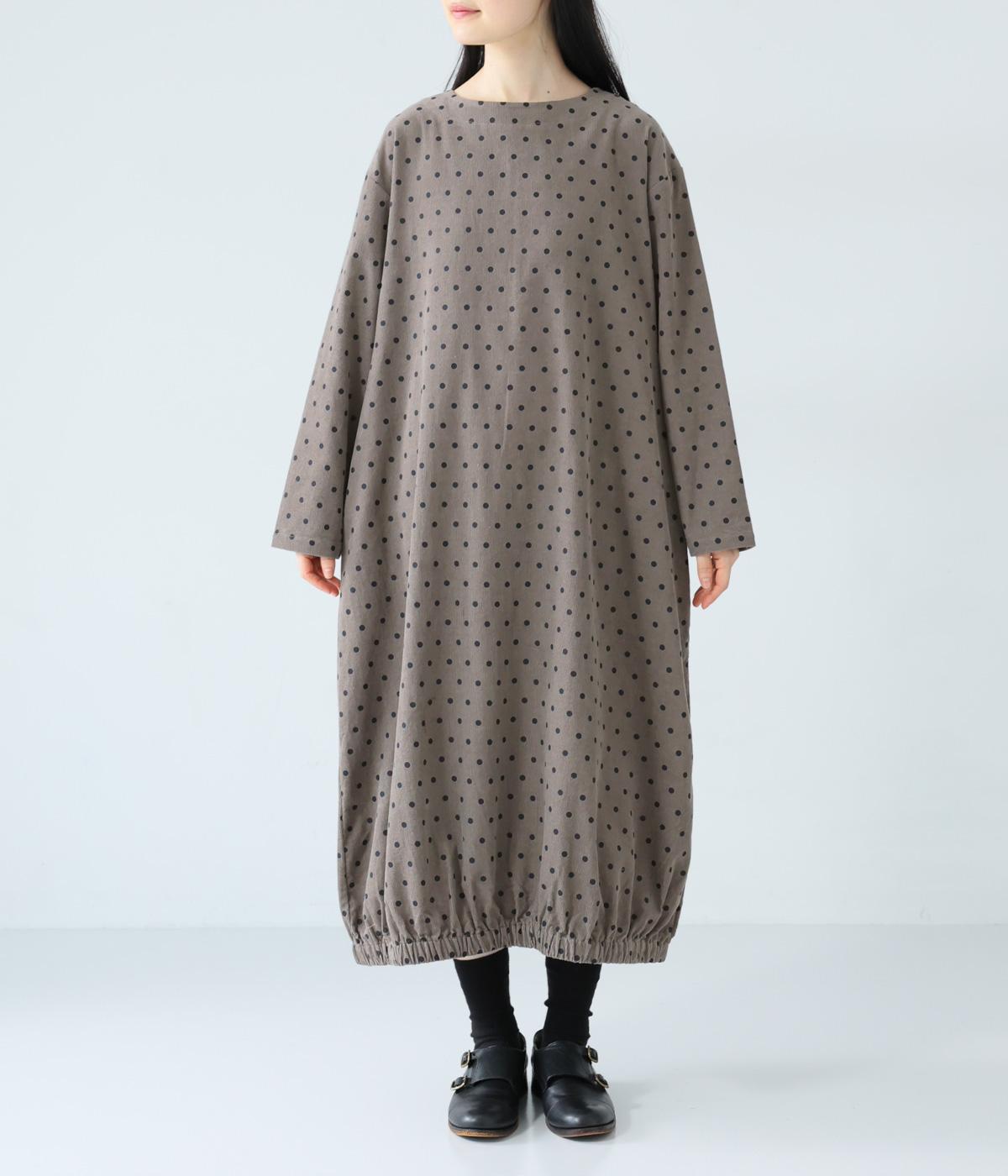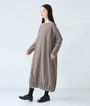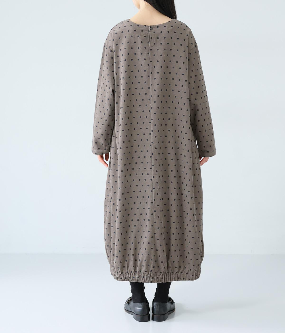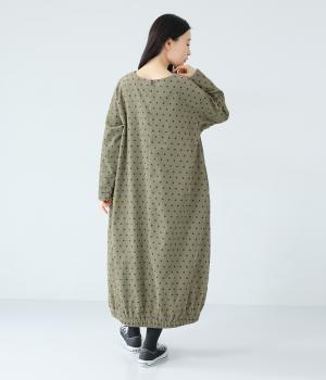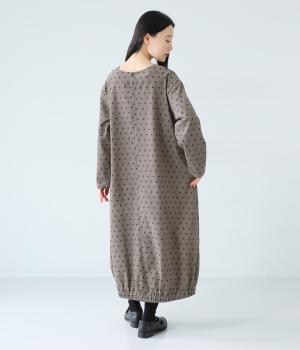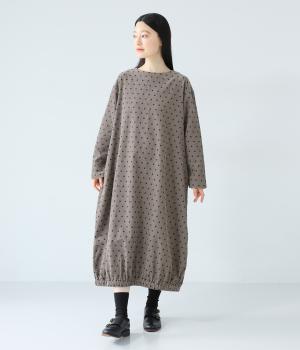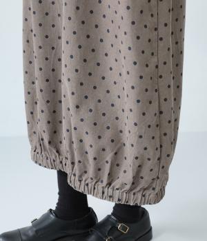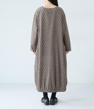 全身のドット柄を落ち着いた色合いで仕上げ、甘さを抑えた大人な雰囲気に。コーデュロイ素材とアースカラーが秋冬コーディネートに馴染みます。広めの首元で抜け感を出し、裾のゴム仕様が全体をコクーンシルエットに仕上げます。