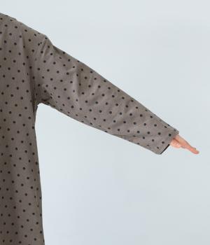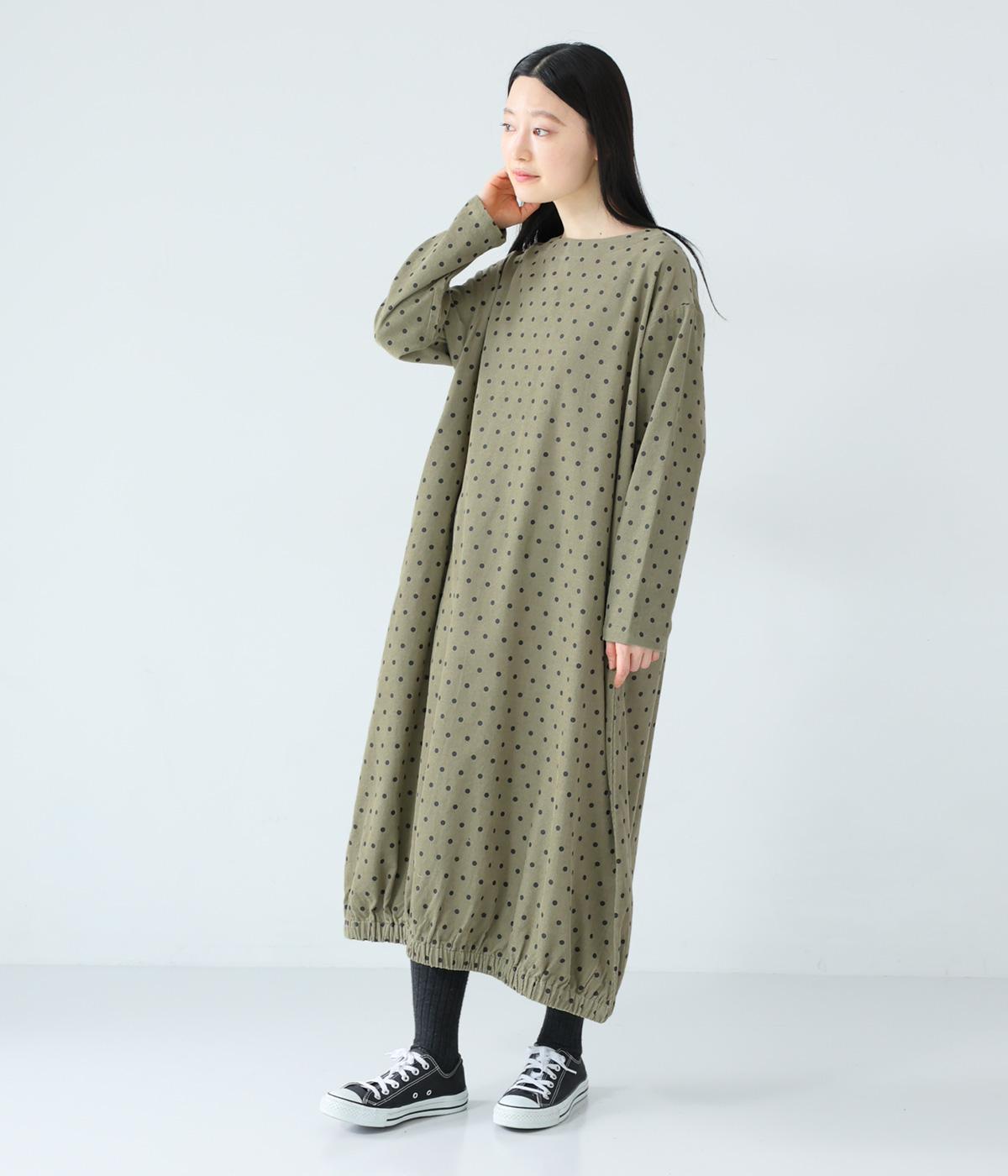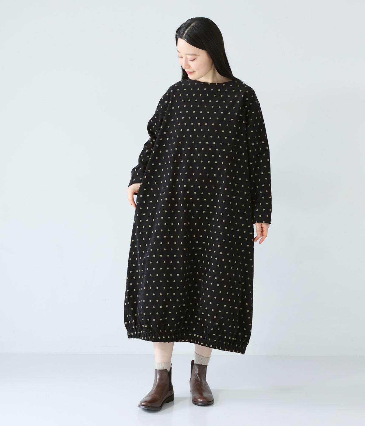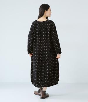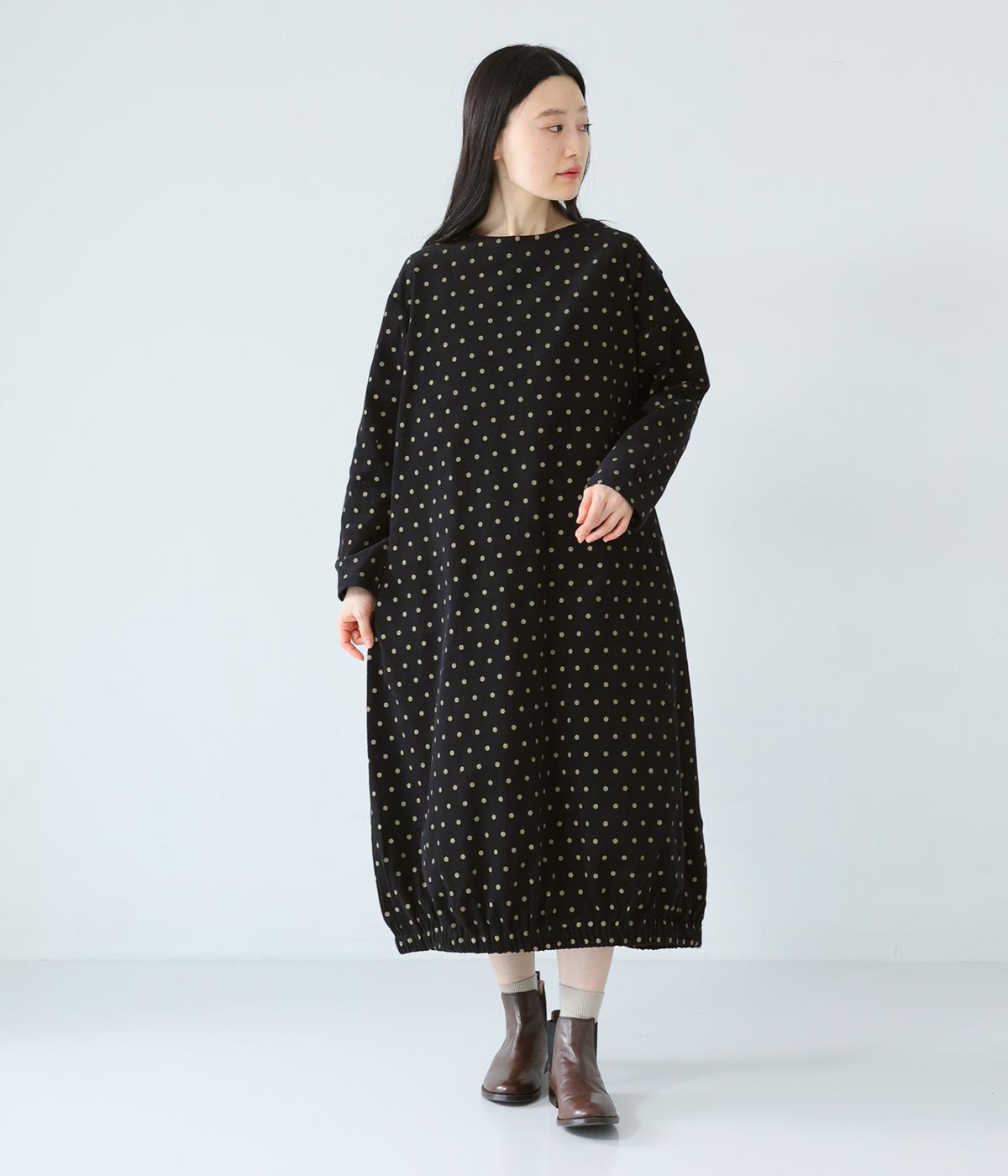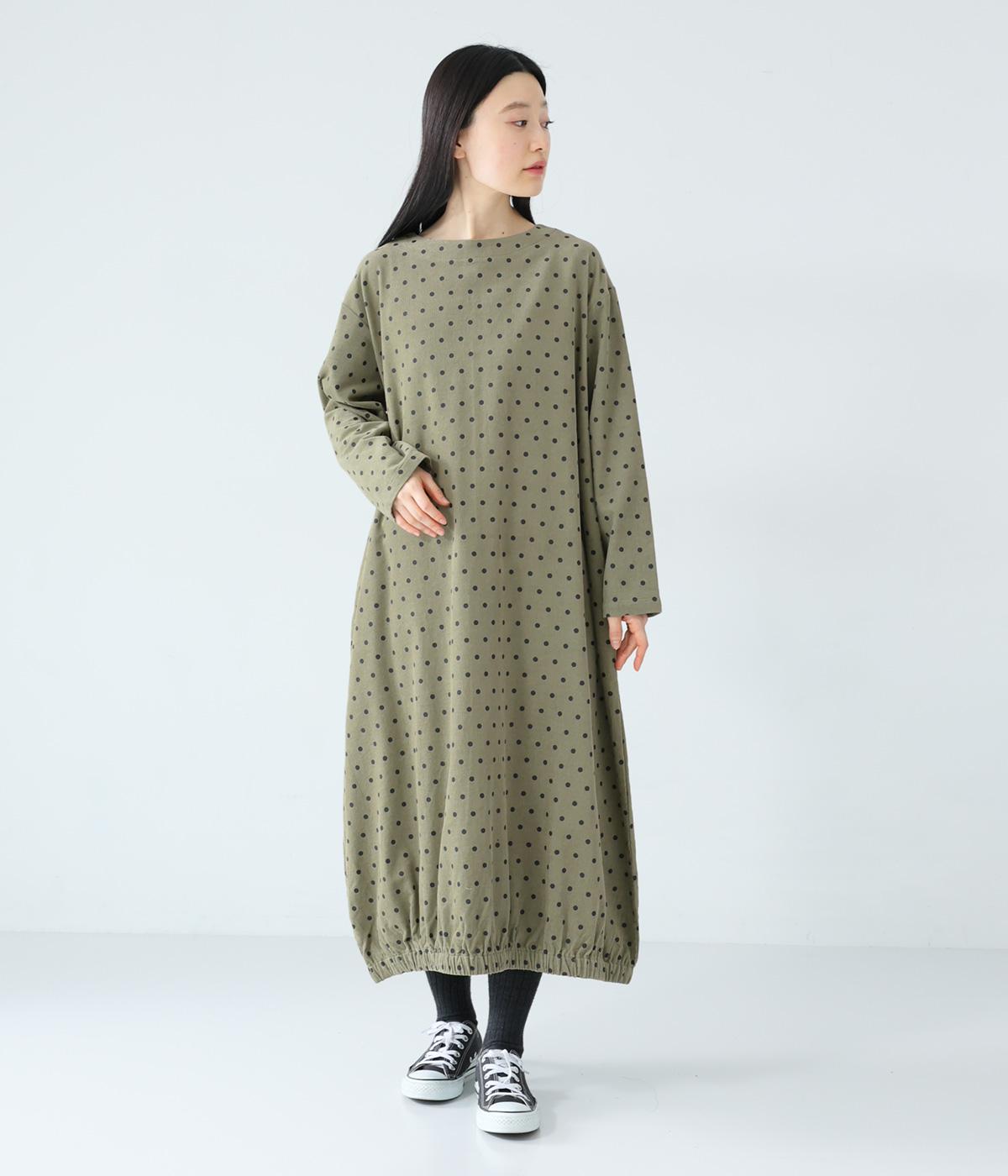 全身のドット柄を落ち着いた色合いで仕上げ、甘さを抑えた大人な雰囲気に。コーデュロイ素材とアースカラーが秋冬コーディネートに馴染みます。広めの首元で抜け感を出し、裾のゴム仕様が全体をコクーンシルエットに仕上げます。