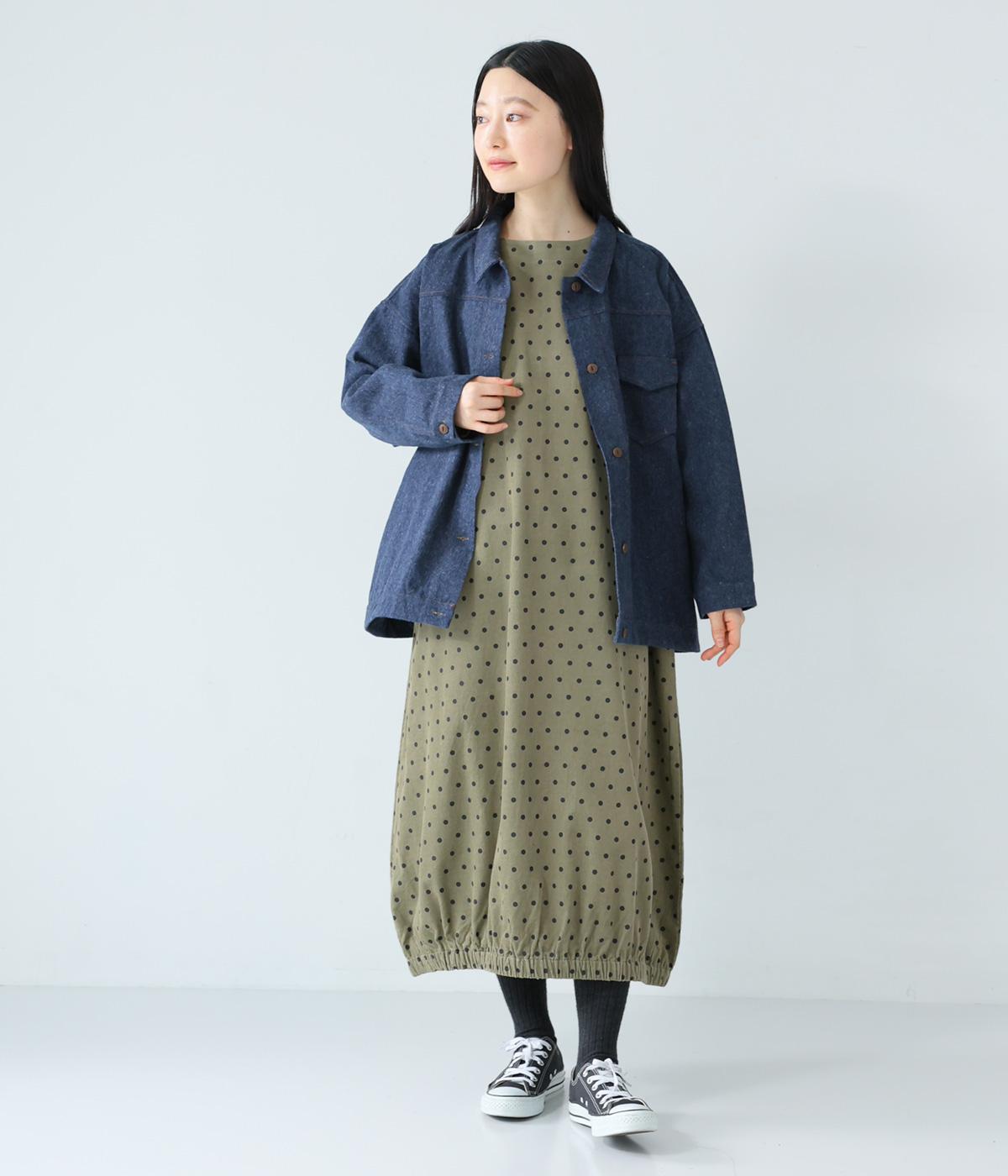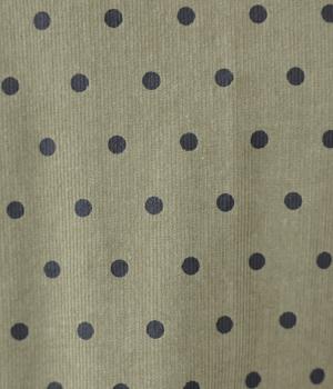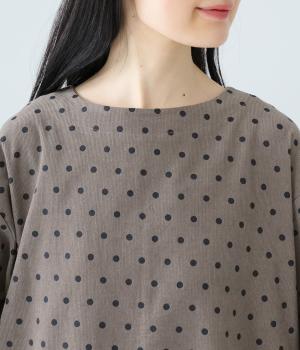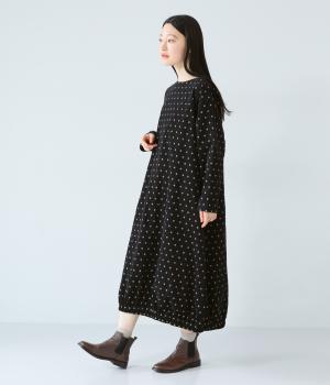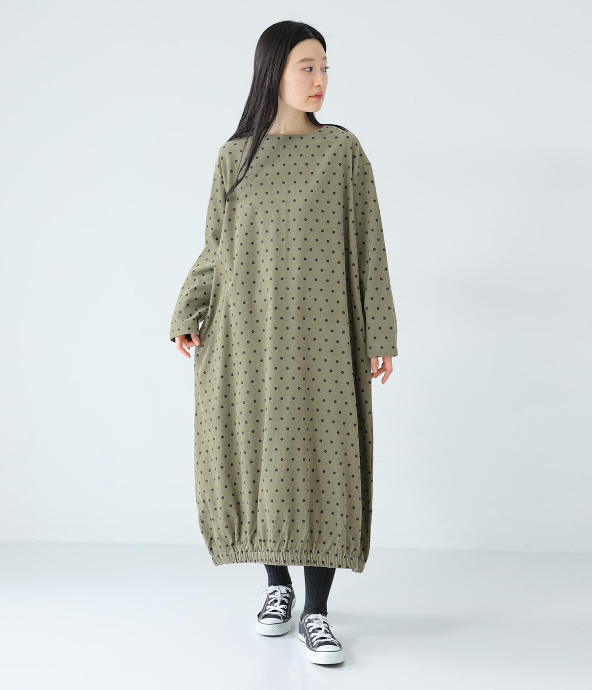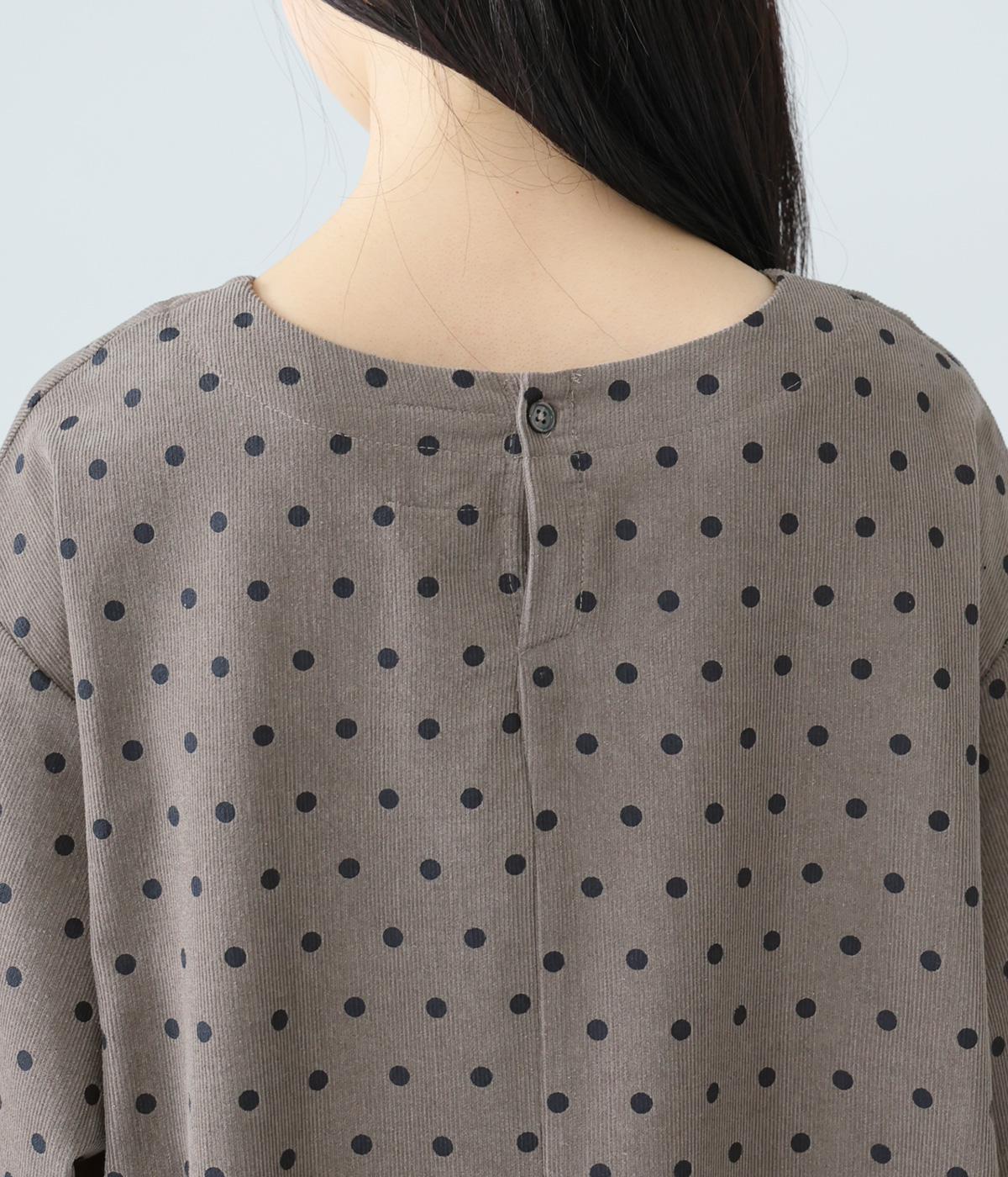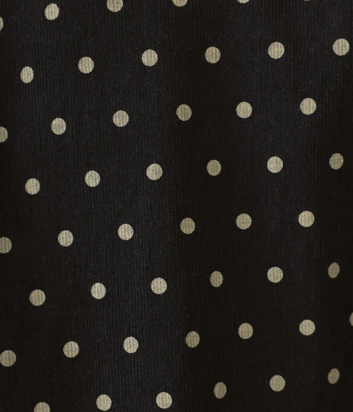 全身のドット柄を落ち着いた色合いで仕上げ、甘さを抑えた大人な雰囲気に。コーデュロイ素材とアースカラーが秋冬コーディネートに馴染みます。広めの首元で抜け感を出し、裾のゴム仕様が全体をコクーンシルエットに仕上げます。