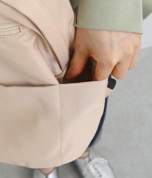 カジュアルさをおさえたシンプルなデザインで、さまざまな装いになじみやすいリュックです。内外に計8つのポケットを備えており、スマホやポーチ、チケットといった細かなものを整理して収納可能。A4書類が入るので通勤にも便利です。