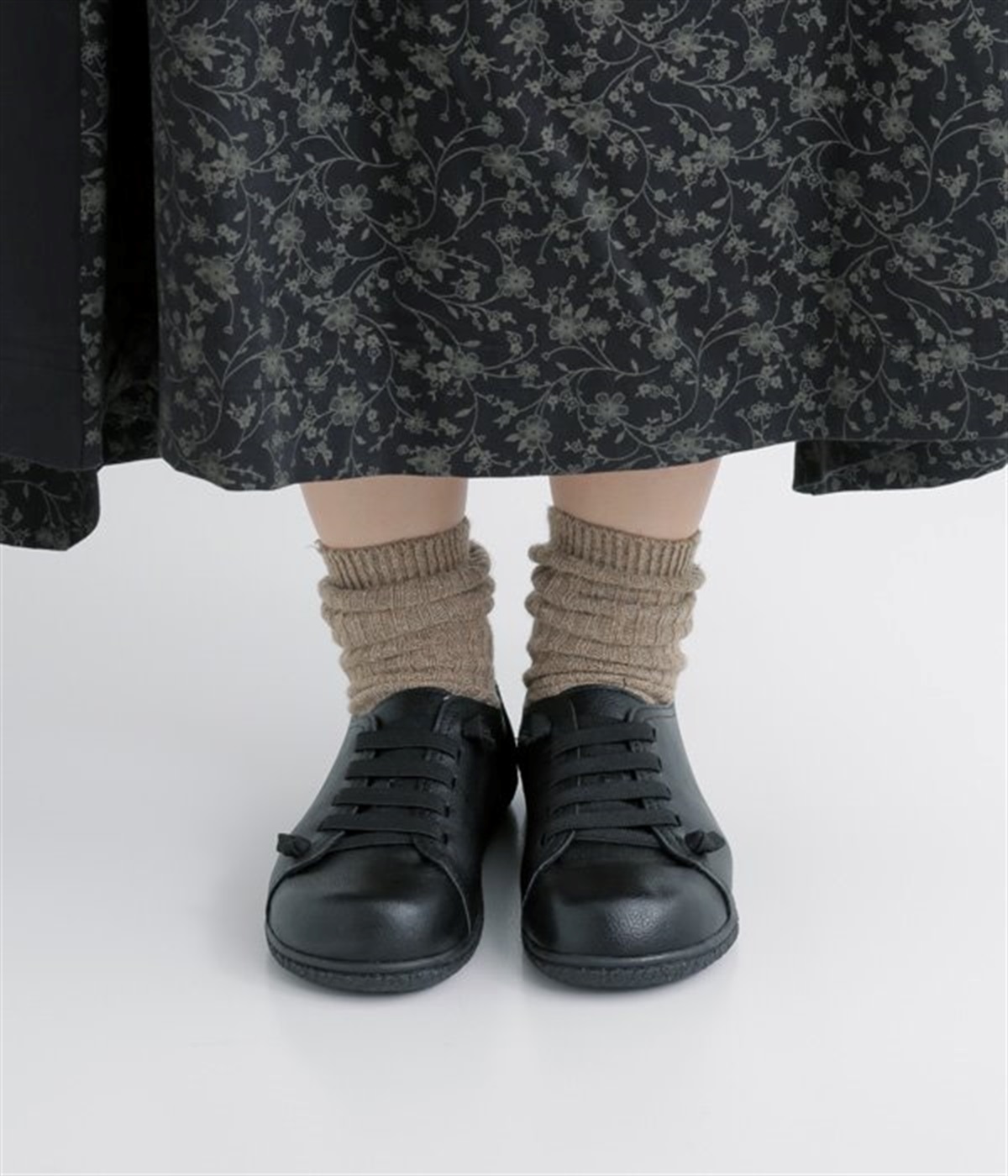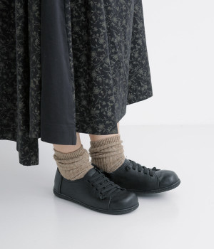 ゴム仕様のシューレースを使用した、脱ぎはきが簡単なレースアップシューズ。楽にはけてきちんと見える、大人にうれしい一足です。フラットソールで歩きやすく、安定感も抜群。丸みのあるトゥのデザインが、女性らしくかわいい足元を演出してくれます。シンプルで合わせるコーディネートを選ばず、ソックスやタイツとの組み合わせも楽しめます。