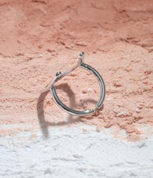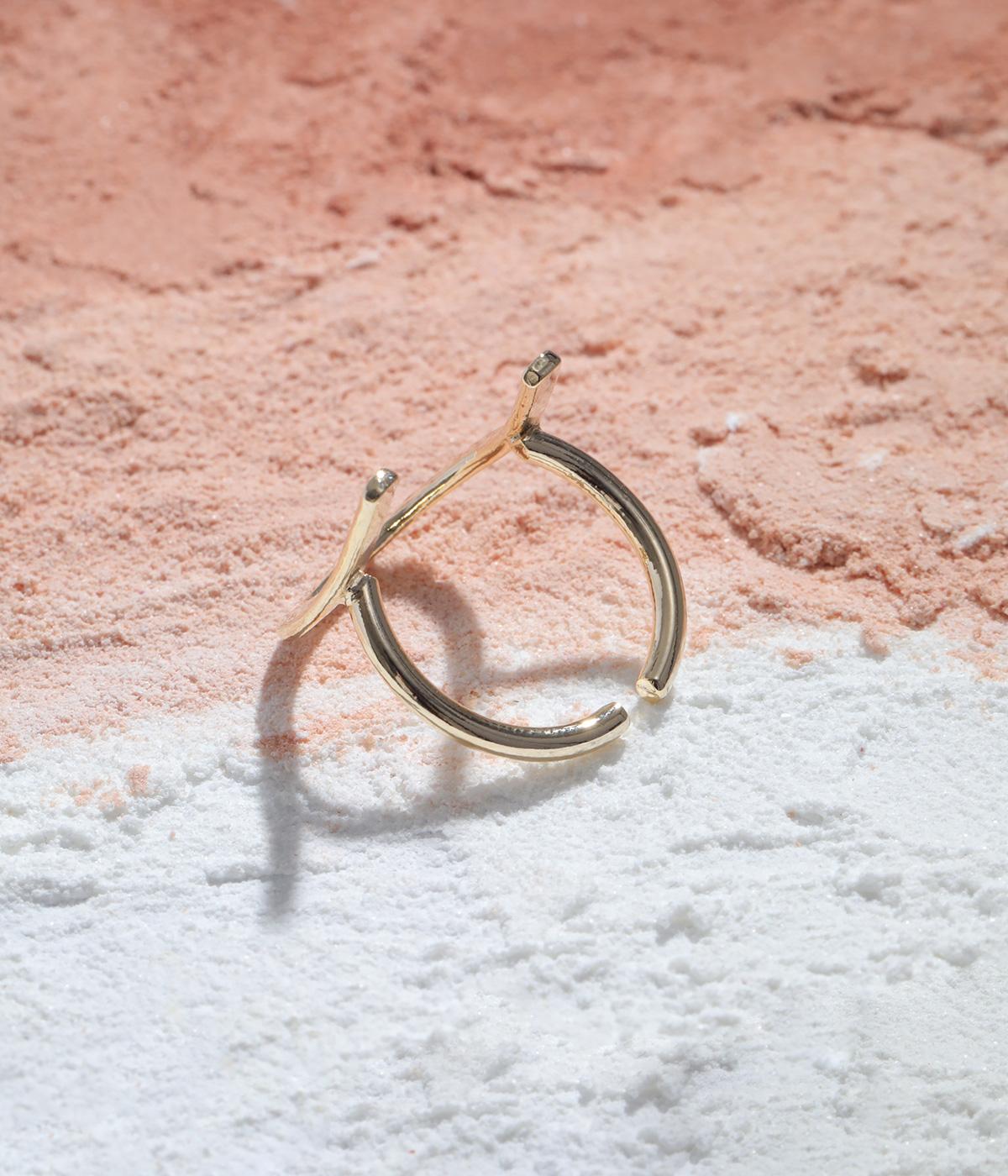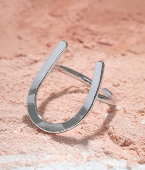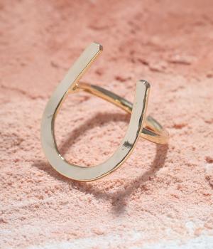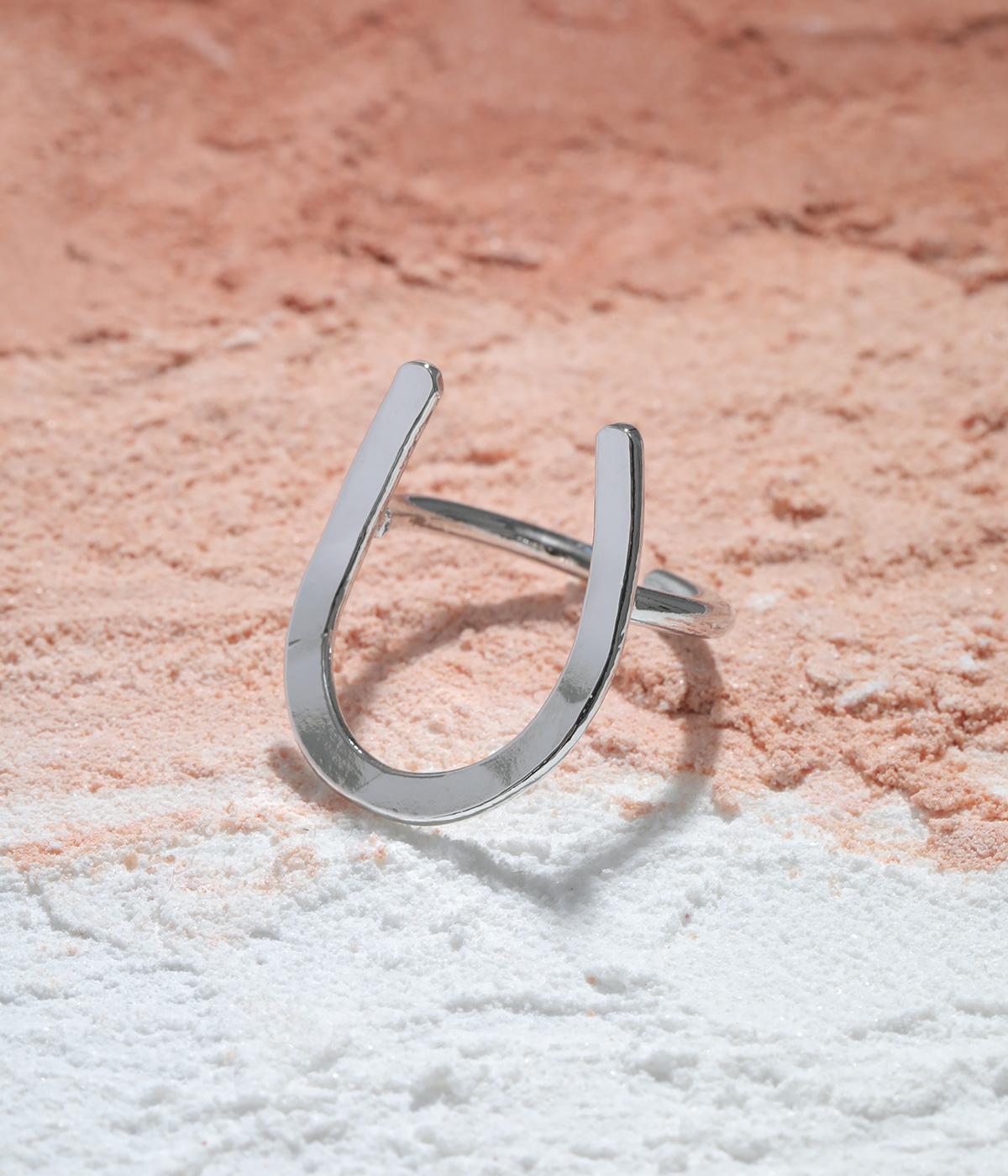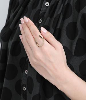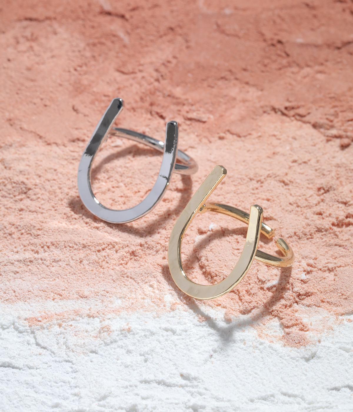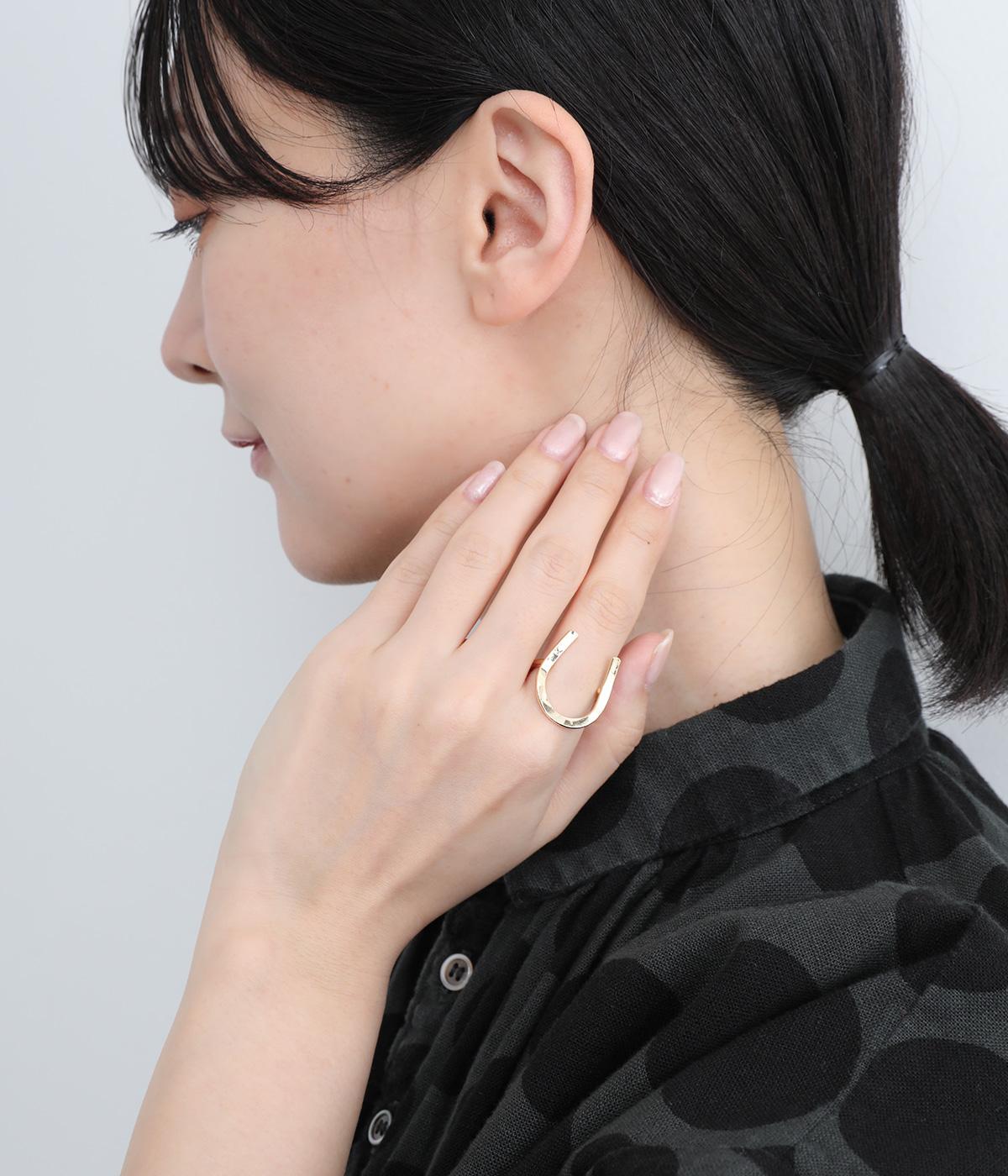 馬蹄のようなU字モチーフが抜け感たっぷりのリング。ひとつひとつ手作業で作成された、クラフト感のある風合いが素敵です。メタルの輝きがさりげなく、他のリングとの重ねづけもサマになります。