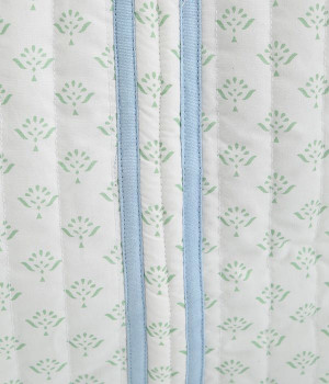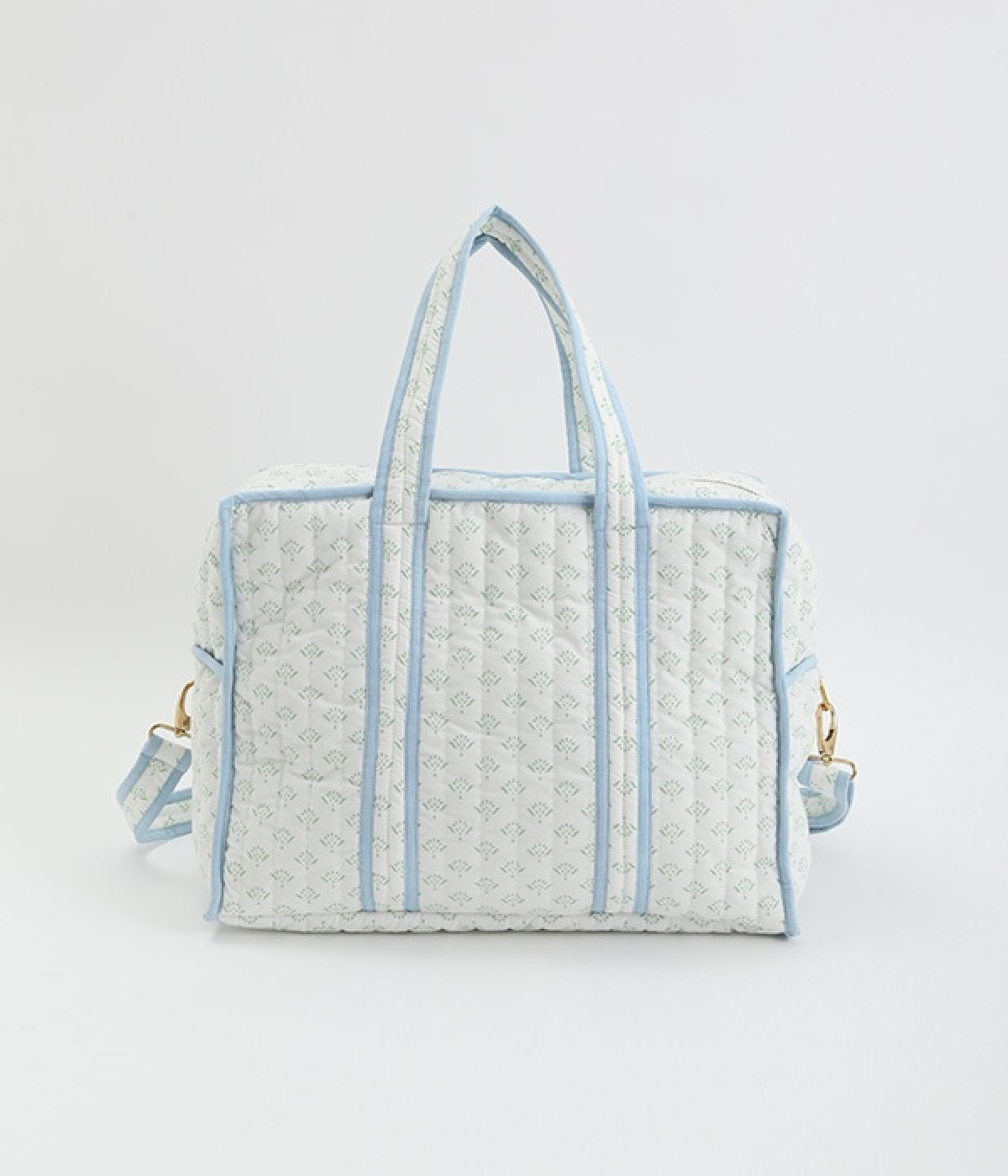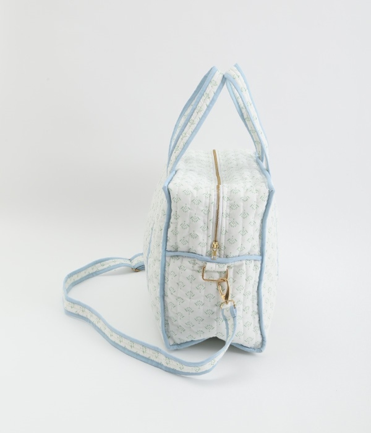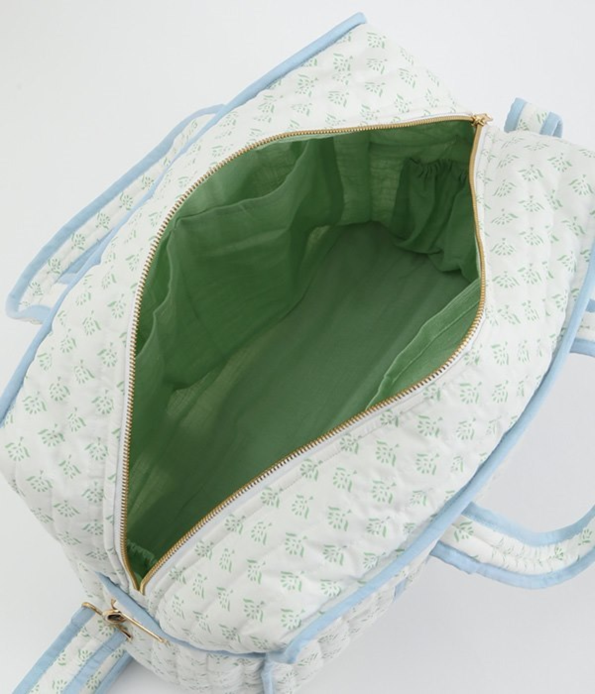 温かみのあるインドプリントとキルティングステッチがかわいらしいボストンバッグ。パイピングでメリハリをつけました。しっくりと手なじみの良いソフトな風合いで気張らずに持ち歩けます。ショルダー紐が外せる2WAY仕様。水筒がすっぽり入るゴム入りポケットなど、内側ポケットが多いので、こまごました持物もすっきり収納できます。マチが大きいので旅行用にもおすすめです。