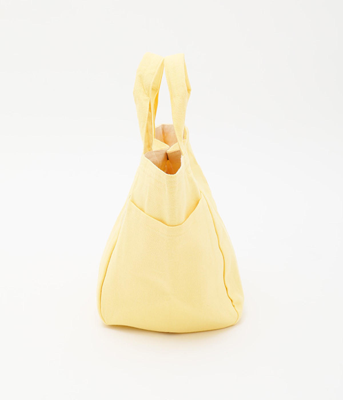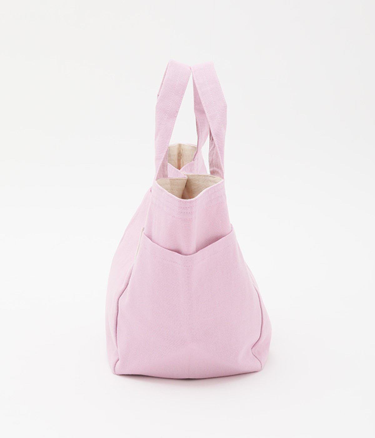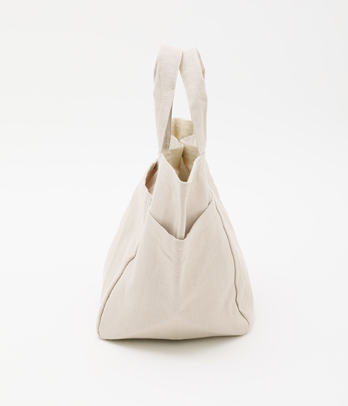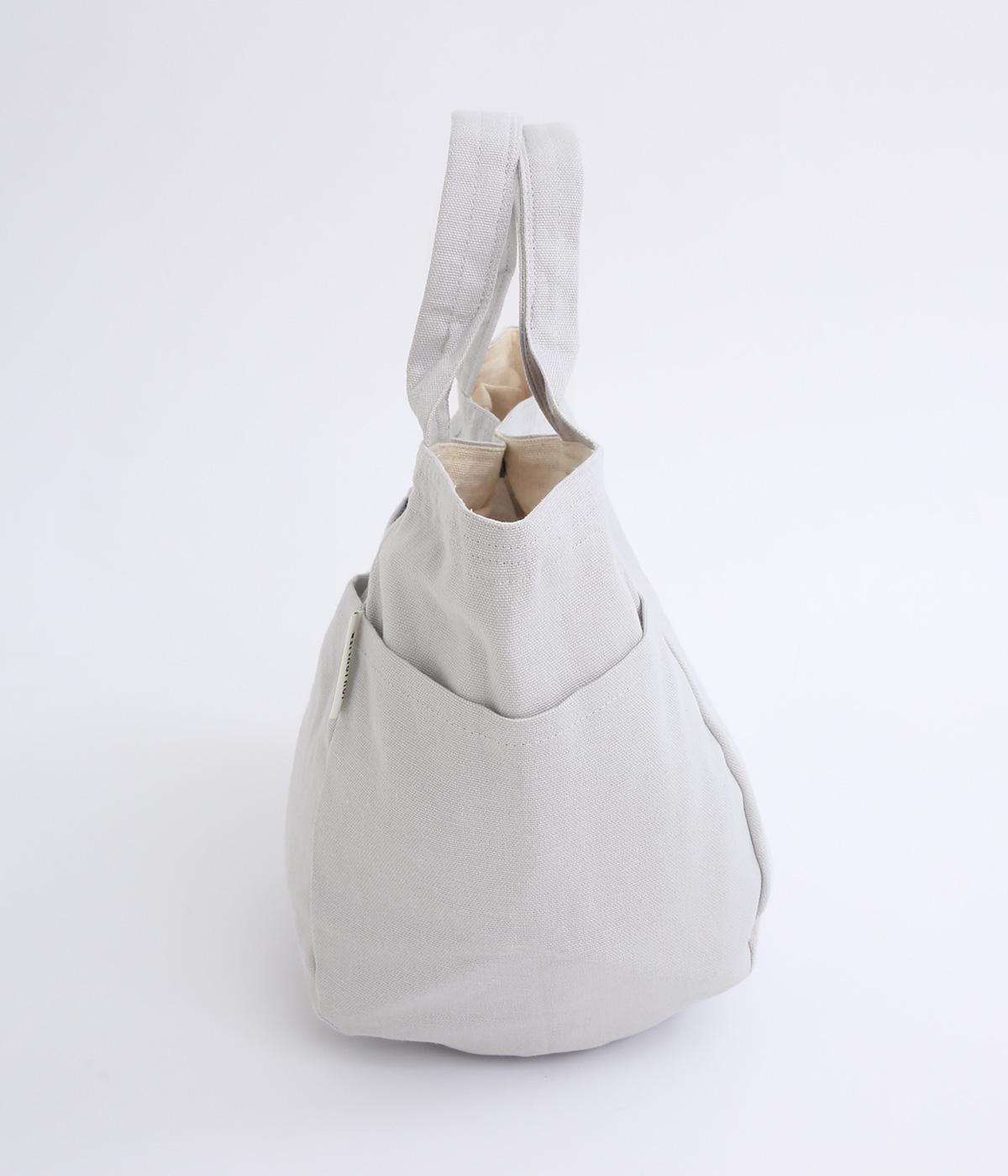 間口を広くとった舟形のバッグ。ランチトートとしてお弁当箱もすっぽり入るのはもちろん、マチが広いのでちょっとしたお出かけ用としても重宝します。外側に3つ。内側に1つポケットがついているので、整理整頓もしやすいです。