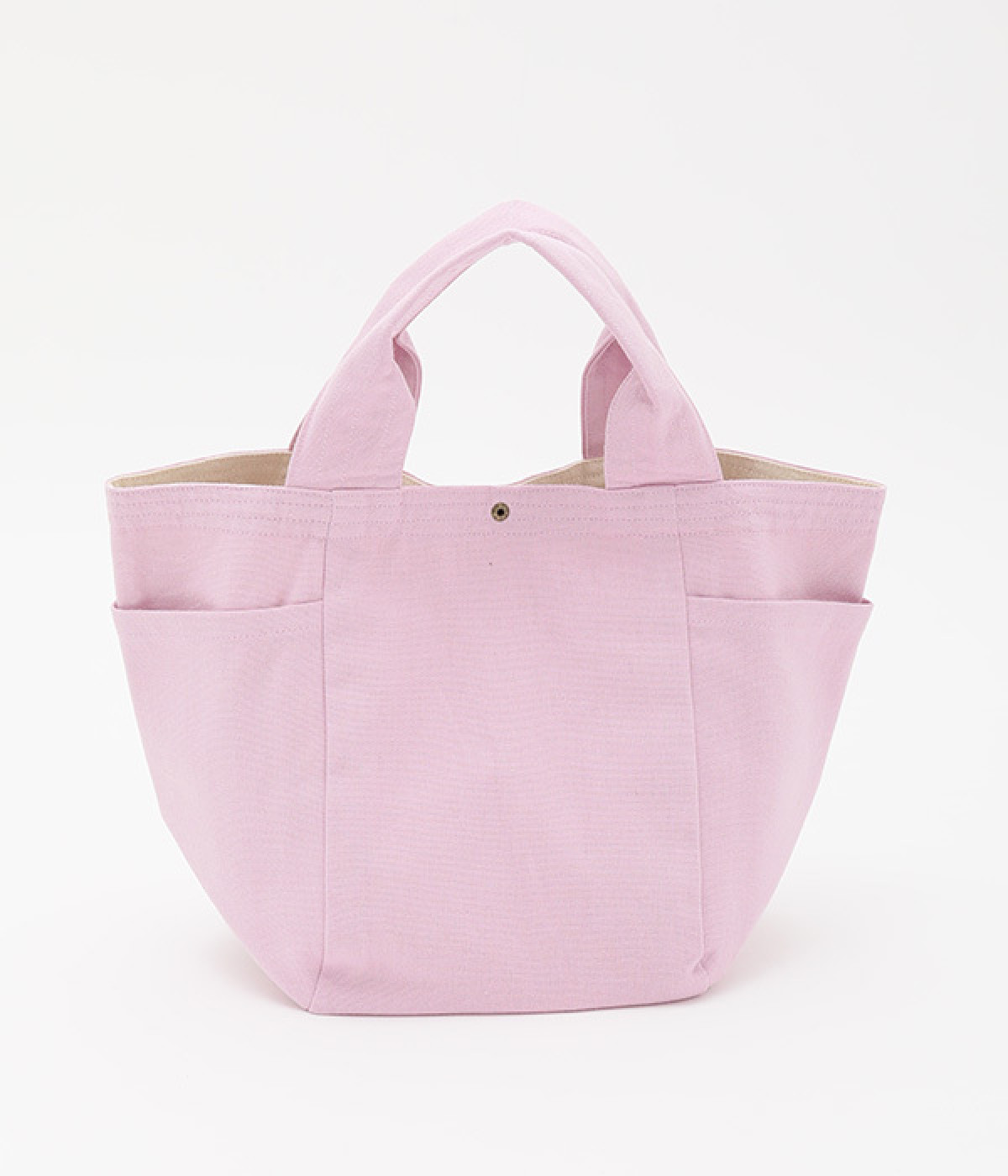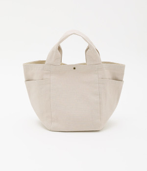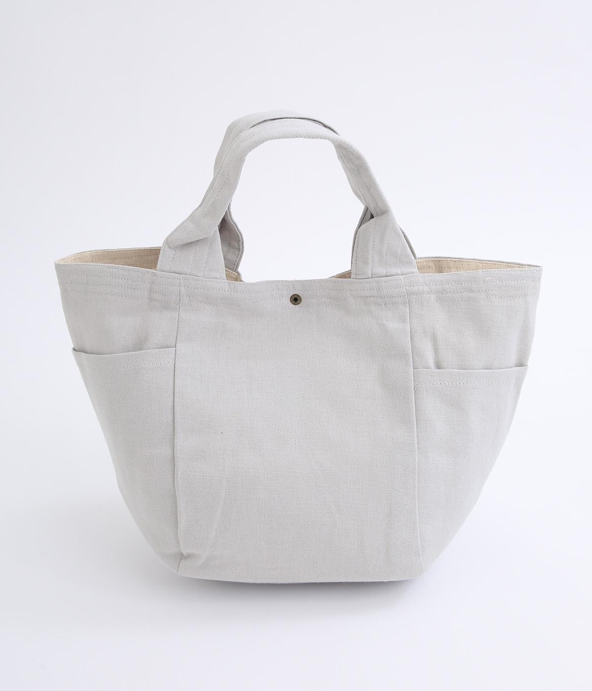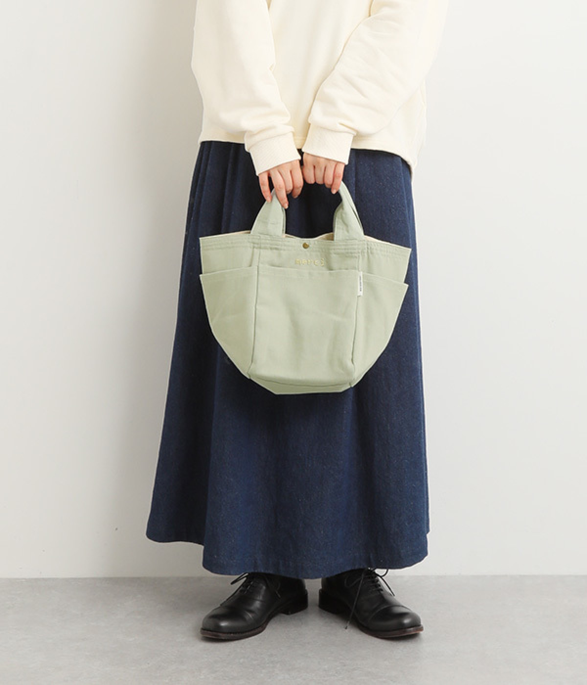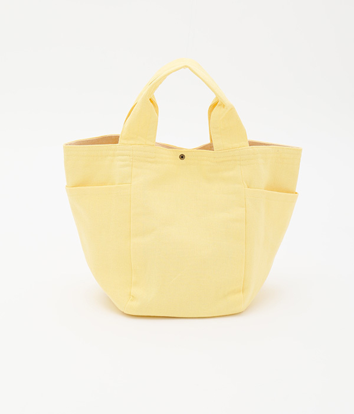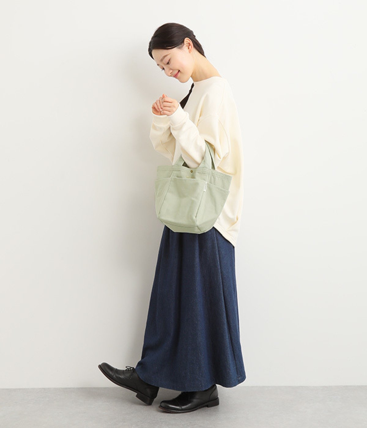 間口を広くとった舟形のバッグ。ランチトートとしてお弁当箱もすっぽり入るのはもちろん、マチが広いのでちょっとしたお出かけ用としても重宝します。外側に3つ。内側に1つポケットがついているので、整理整頓もしやすいです。