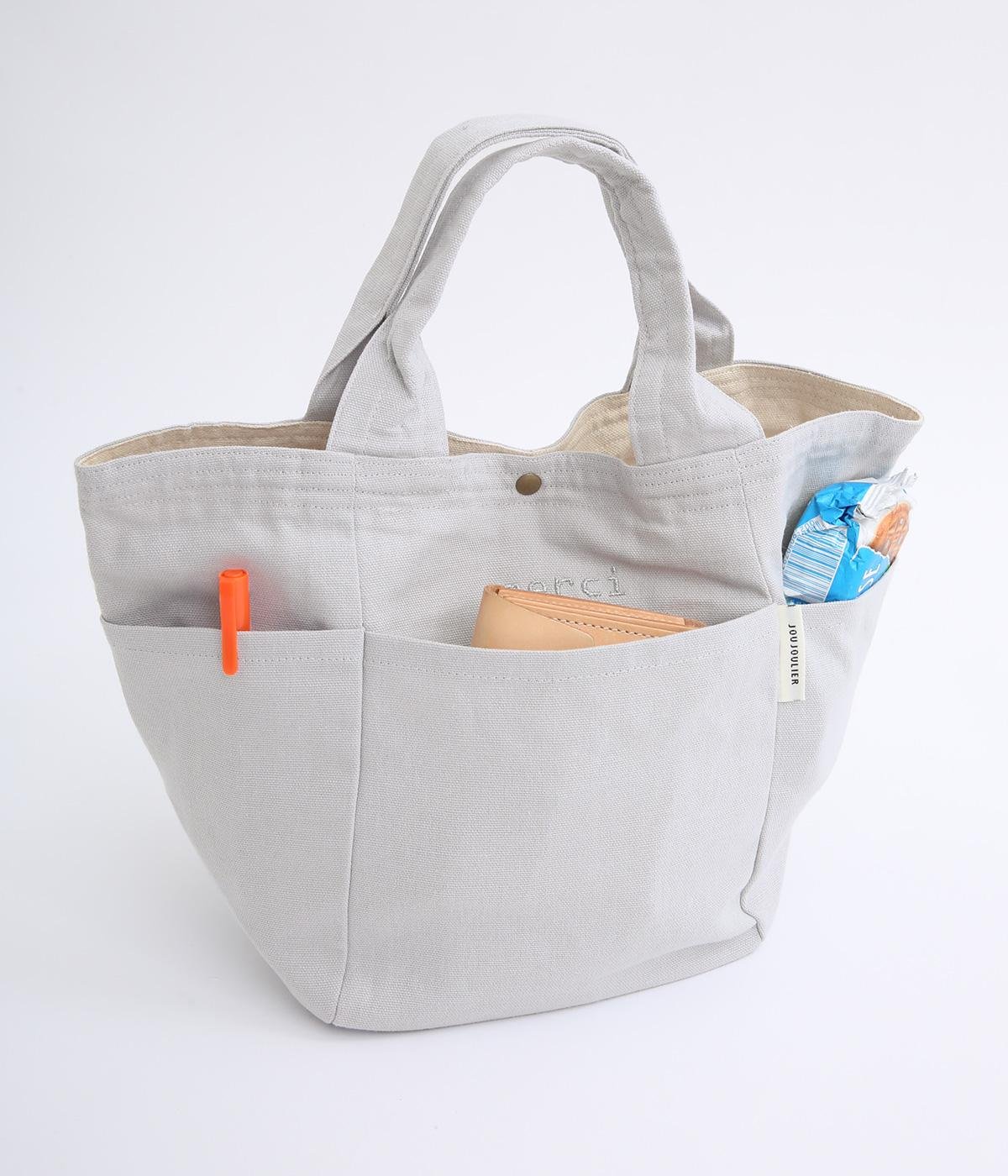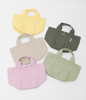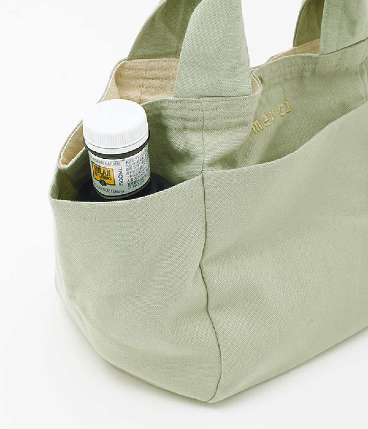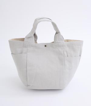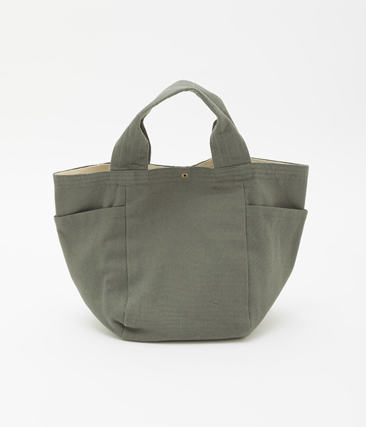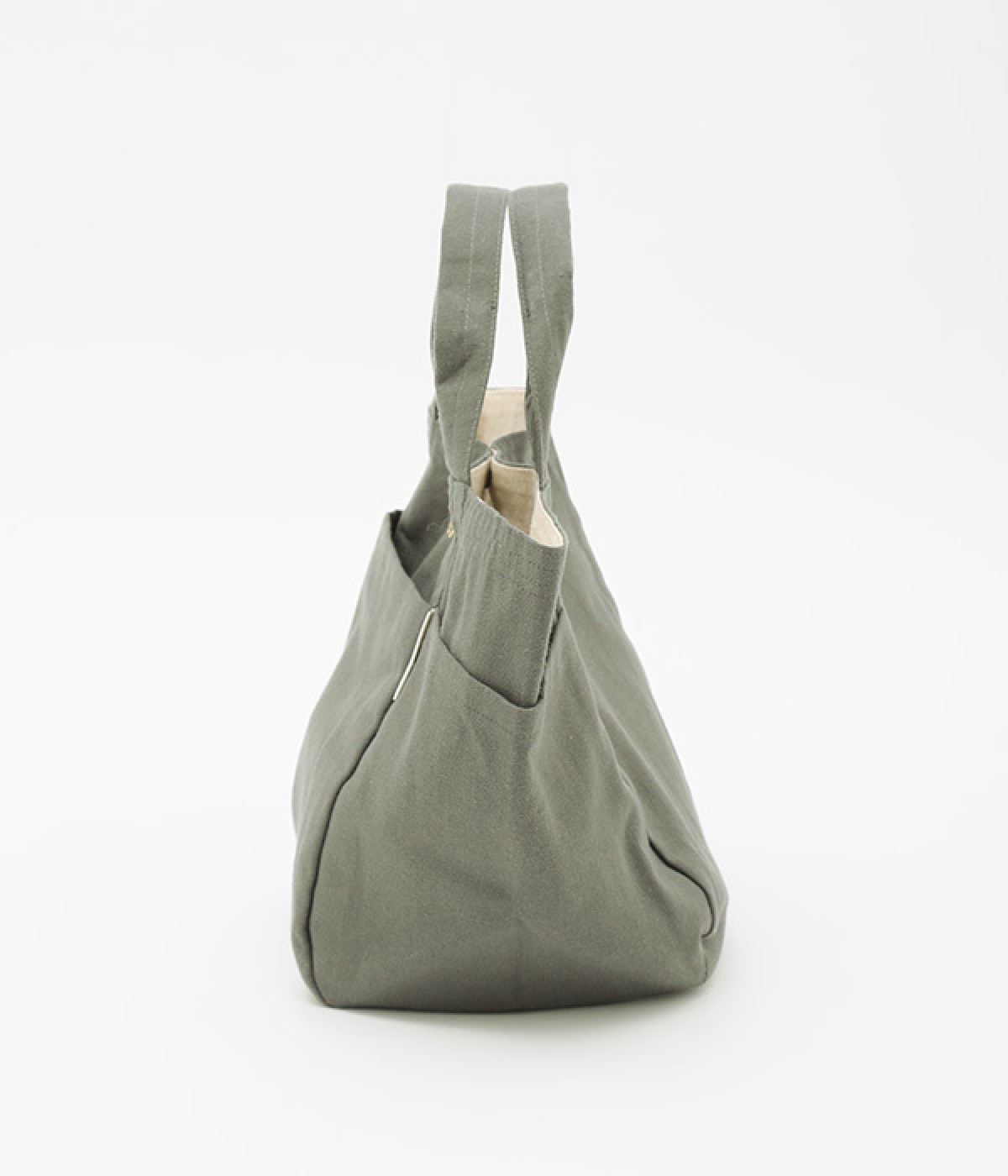 間口を広くとった舟形のバッグ。ランチトートとしてお弁当箱もすっぽり入るのはもちろん、マチが広いのでちょっとしたお出かけ用としても重宝します。外側に3つ。内側に1つポケットがついているので、整理整頓もしやすいです。