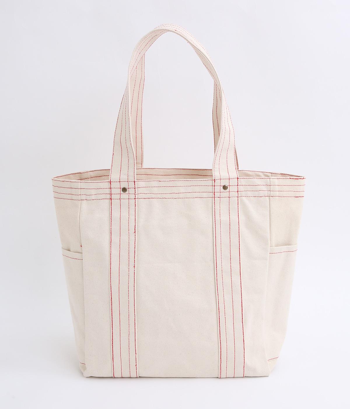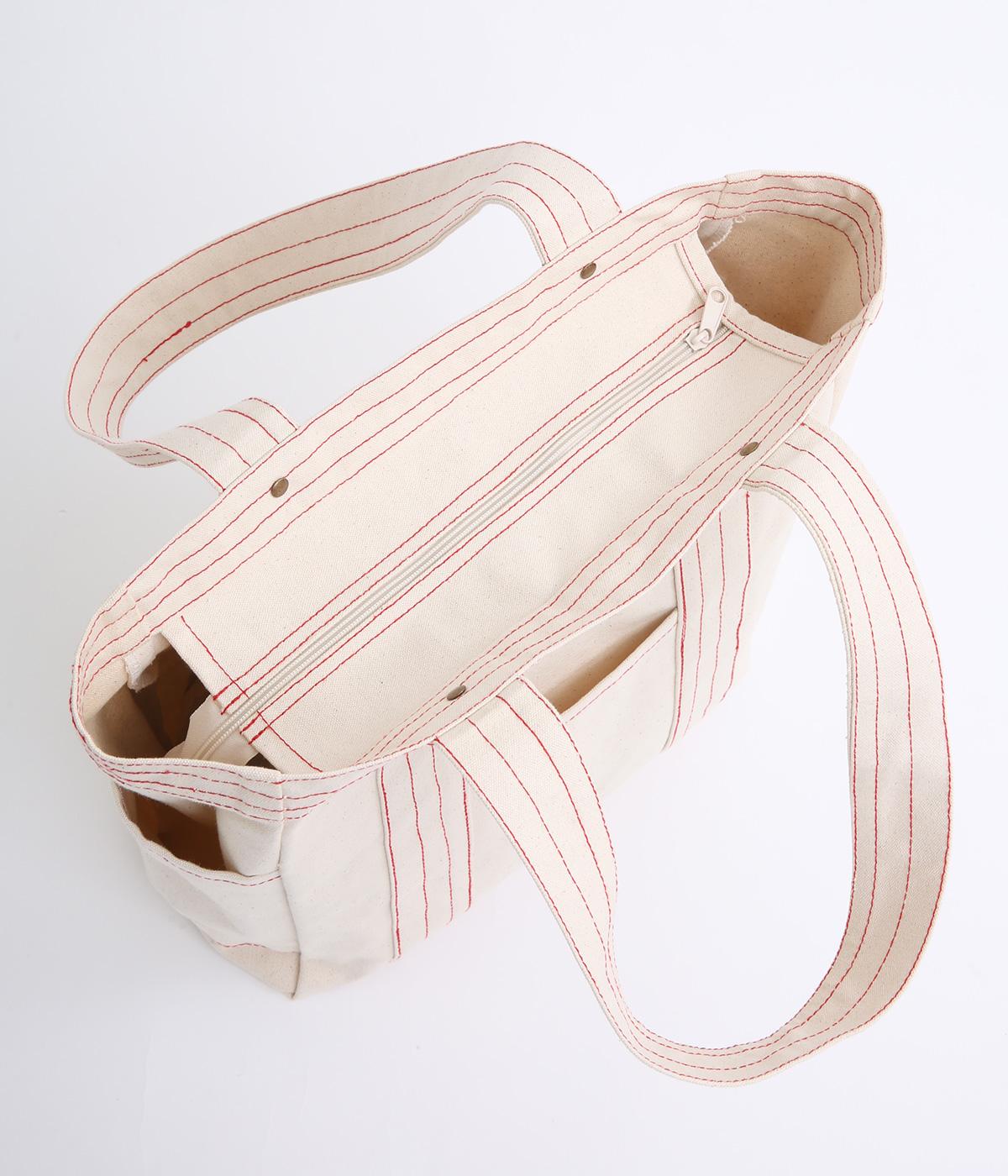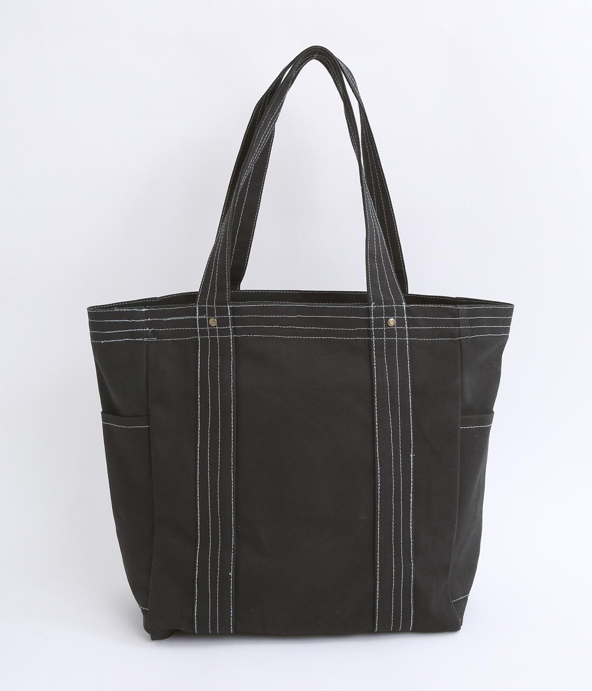 カラーステッチとロゴが目を惹くトートバッグ。シンプルなスクエア型に広めのマチでたっぷり入ります。間口はジップ仕様でしっかり閉められるのもうれしい。サイドやフロントについたアウトポケットポケットも便利です。