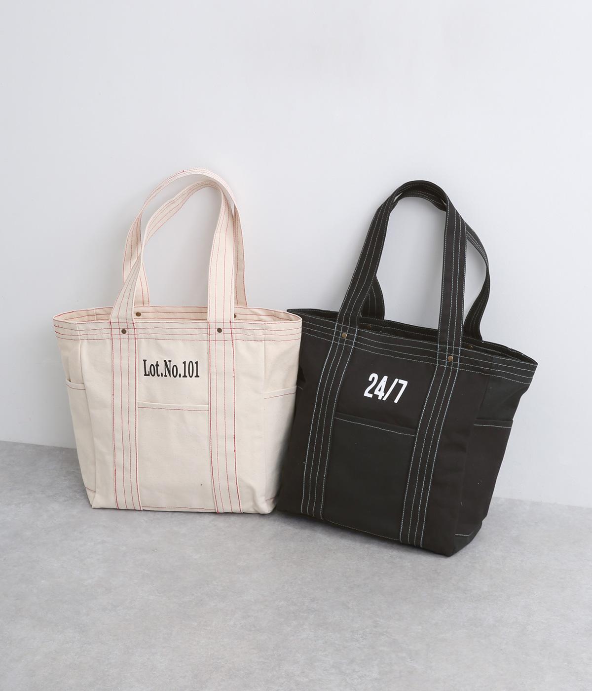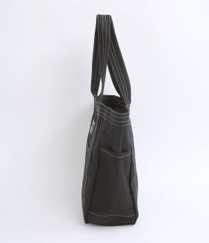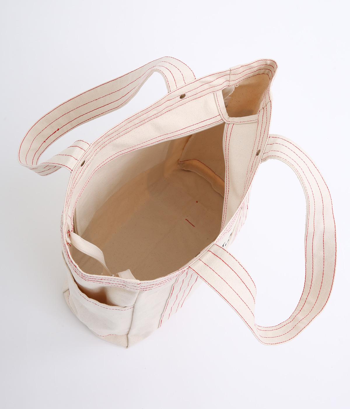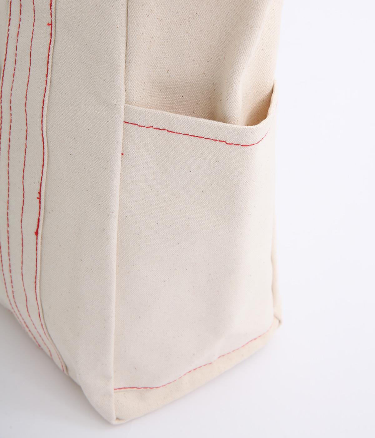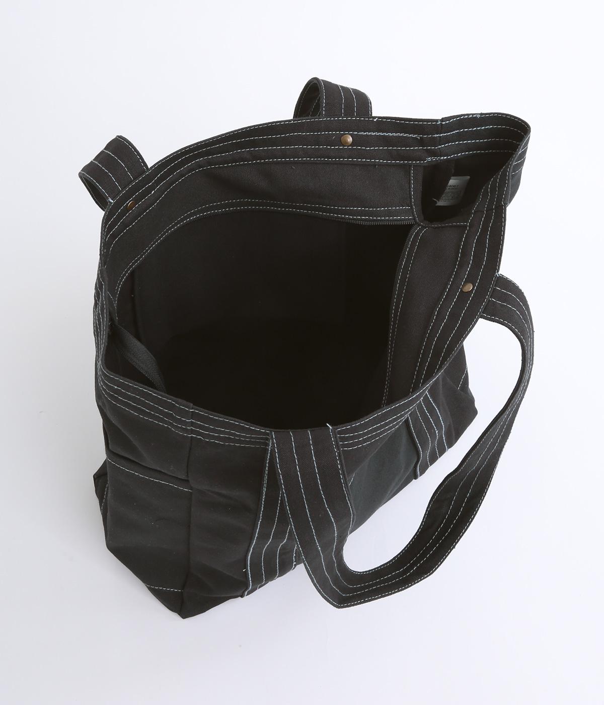 カラーステッチとロゴが目を惹くトートバッグ。シンプルなスクエア型に広めのマチでたっぷり入ります。間口はジップ仕様でしっかり閉められるのもうれしい。サイドやフロントについたアウトポケットポケットも便利です。