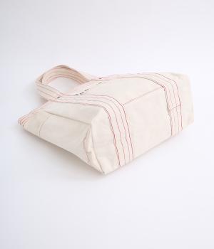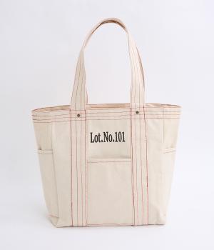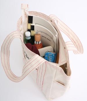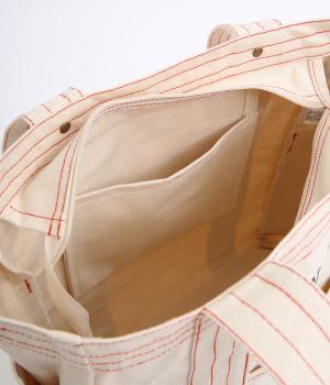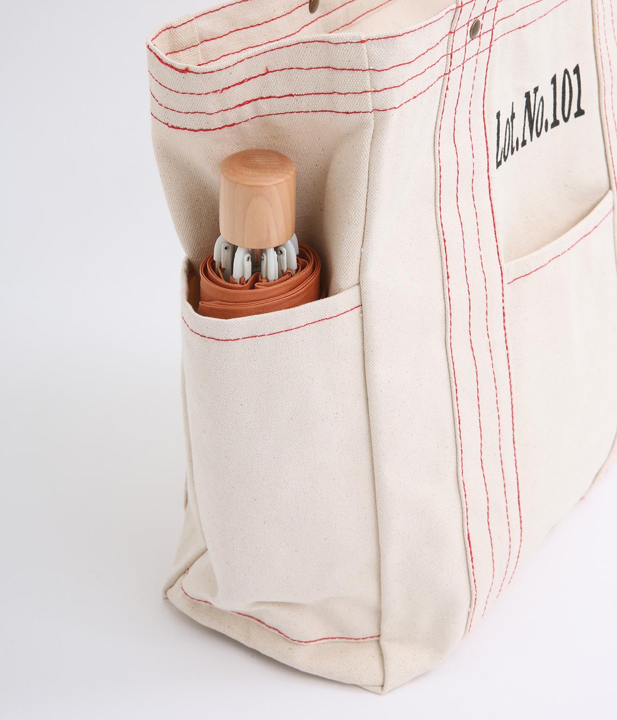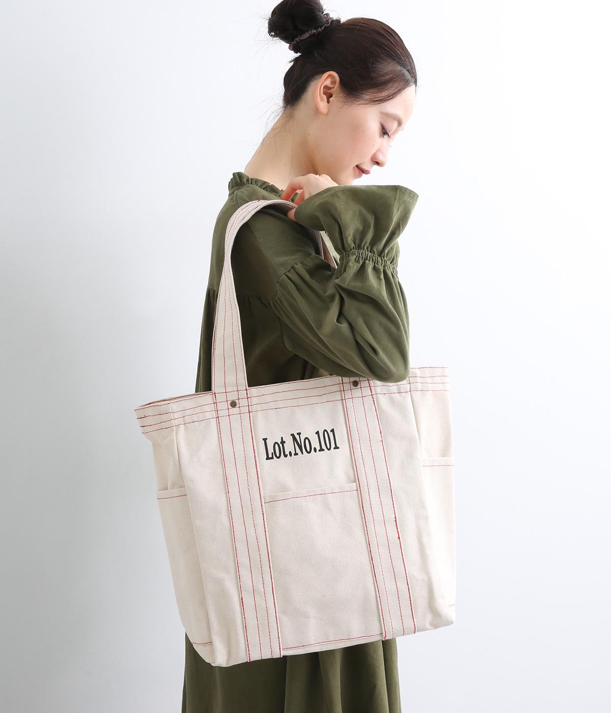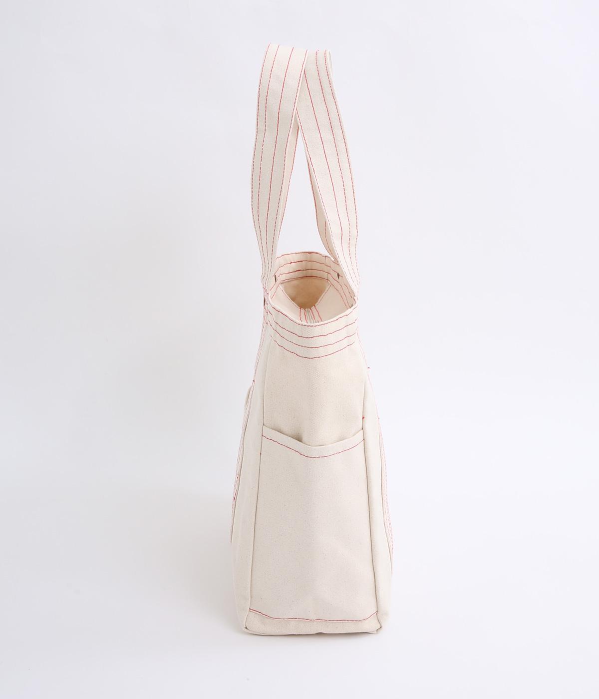 カラーステッチとロゴが目を惹くトートバッグ。シンプルなスクエア型に広めのマチでたっぷり入ります。間口はジップ仕様でしっかり閉められるのもうれしい。サイドやフロントについたアウトポケットポケットも便利です。