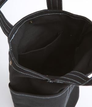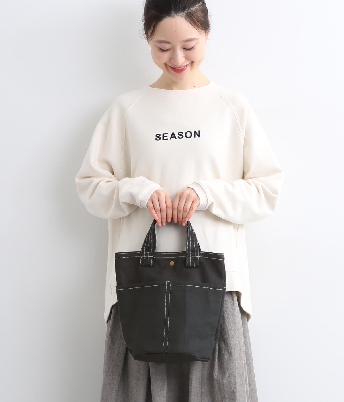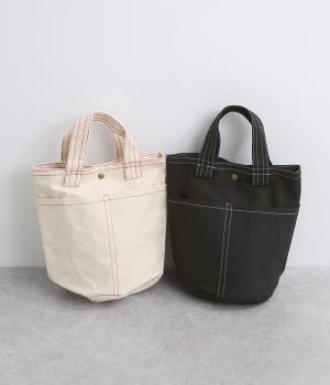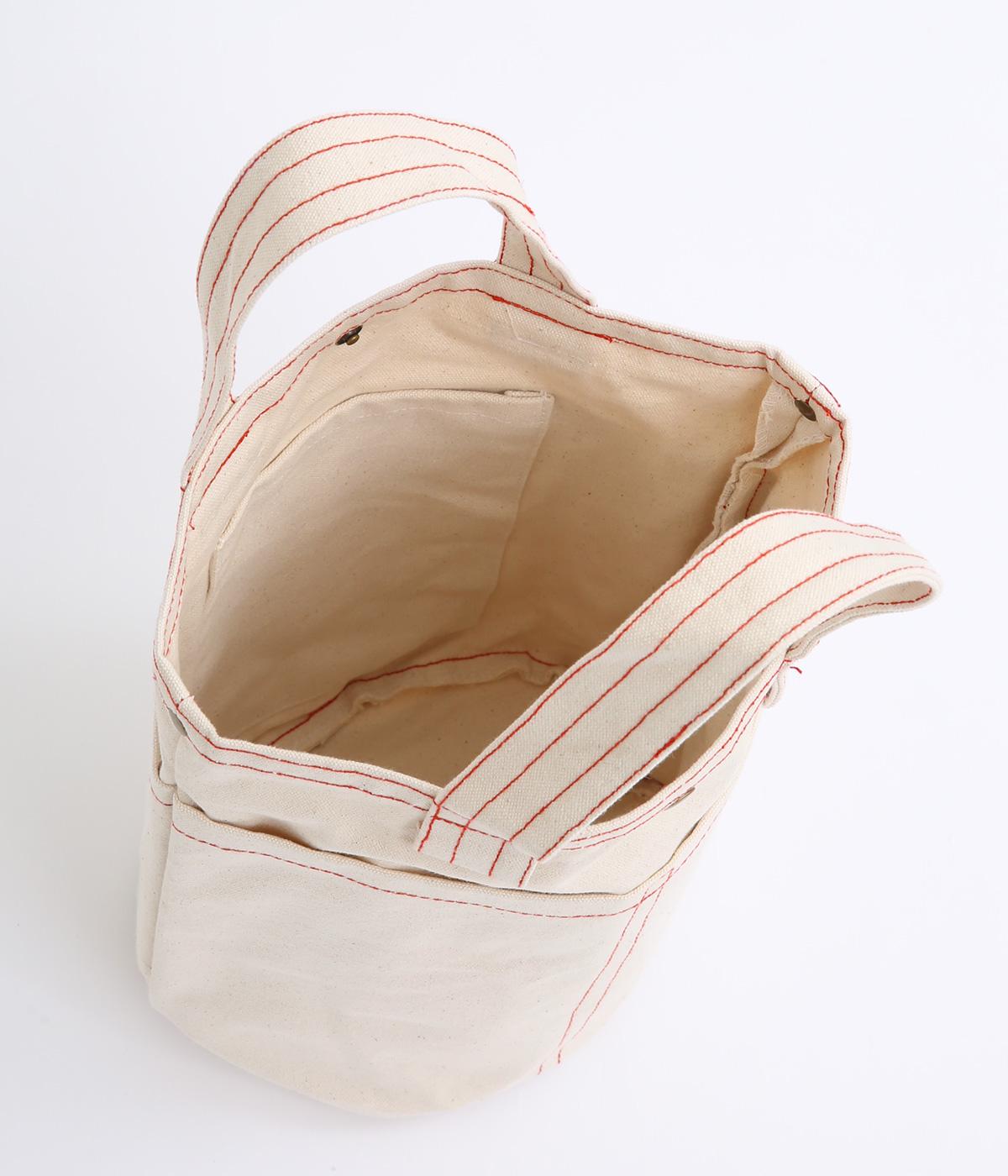 カラーステッチが目を惹くミニサイズのトートバッグです。ちょっとしたお出かけにさっと持ちやすい手提げタイプ。前後にアウトポケットもついているので、荷物の仕分けがしやすく必要なものをさっと取り出せます。