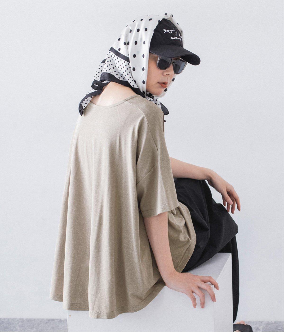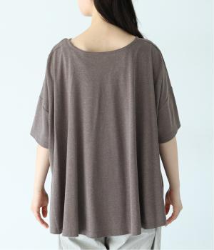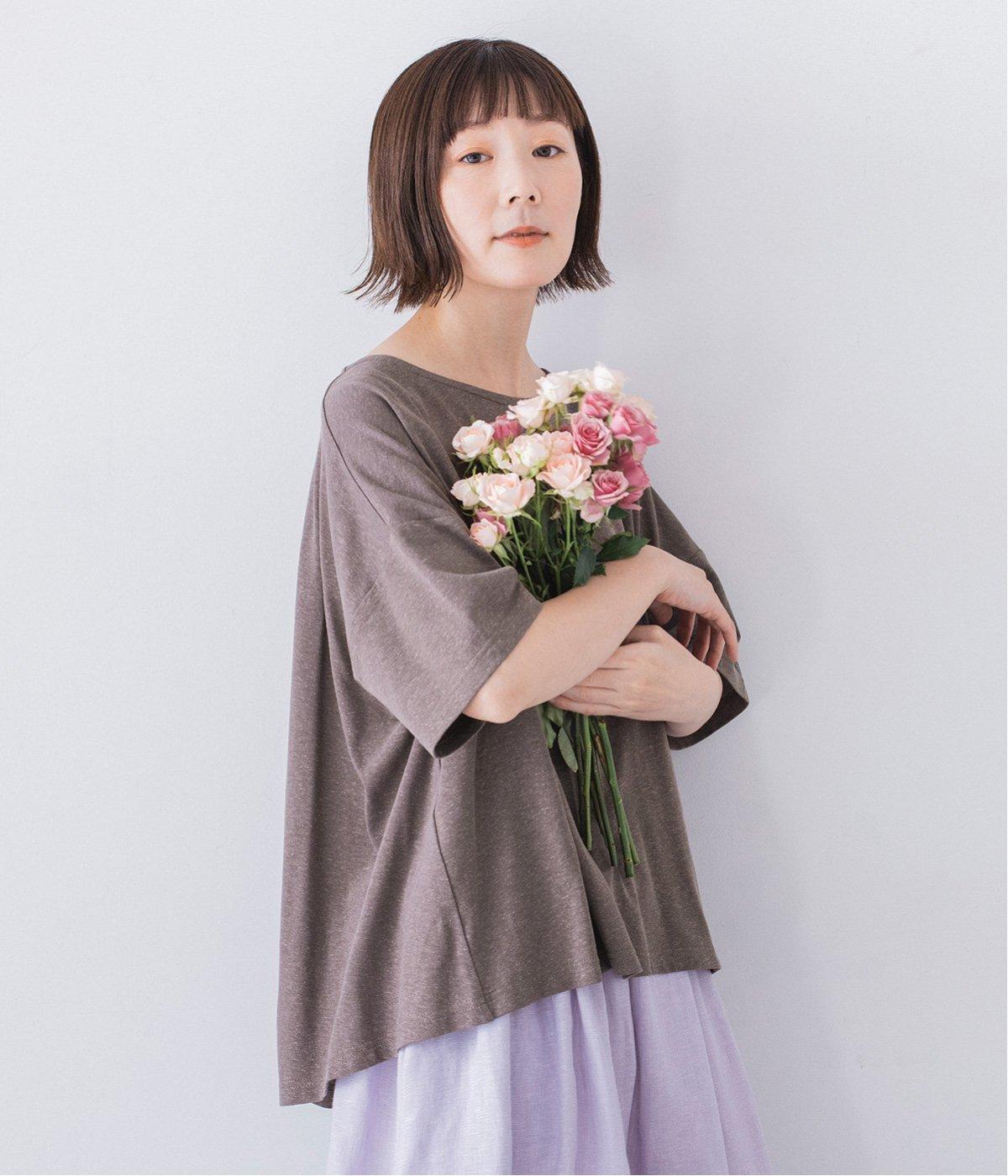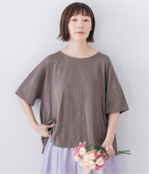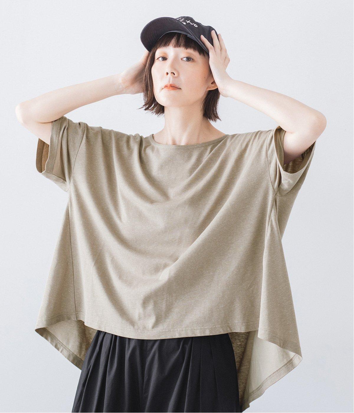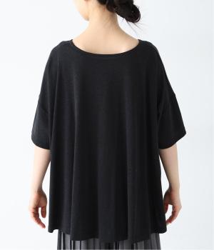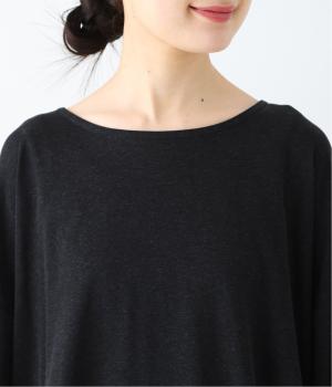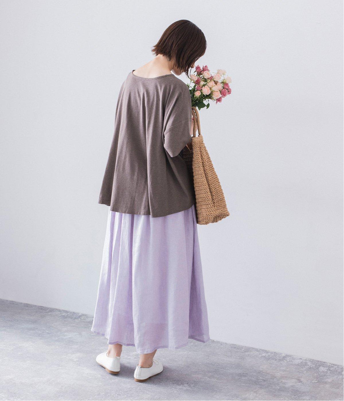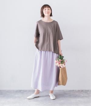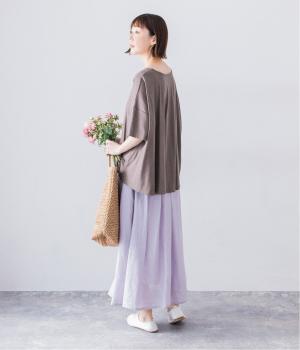 前はすっきりと、後ろは流れるようなドレープが目を引くフレアシルエットにデザインしています。ゆったりとしているので風通しがよく涼しい着心地。横に広めに開いた衿ぐりが大人フェミニンな印象です。インナーとしても合わせやすく、ロングシーズン活躍します。