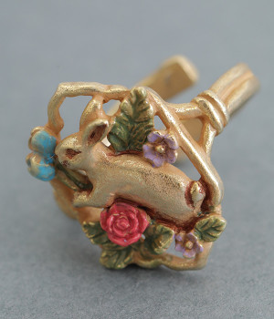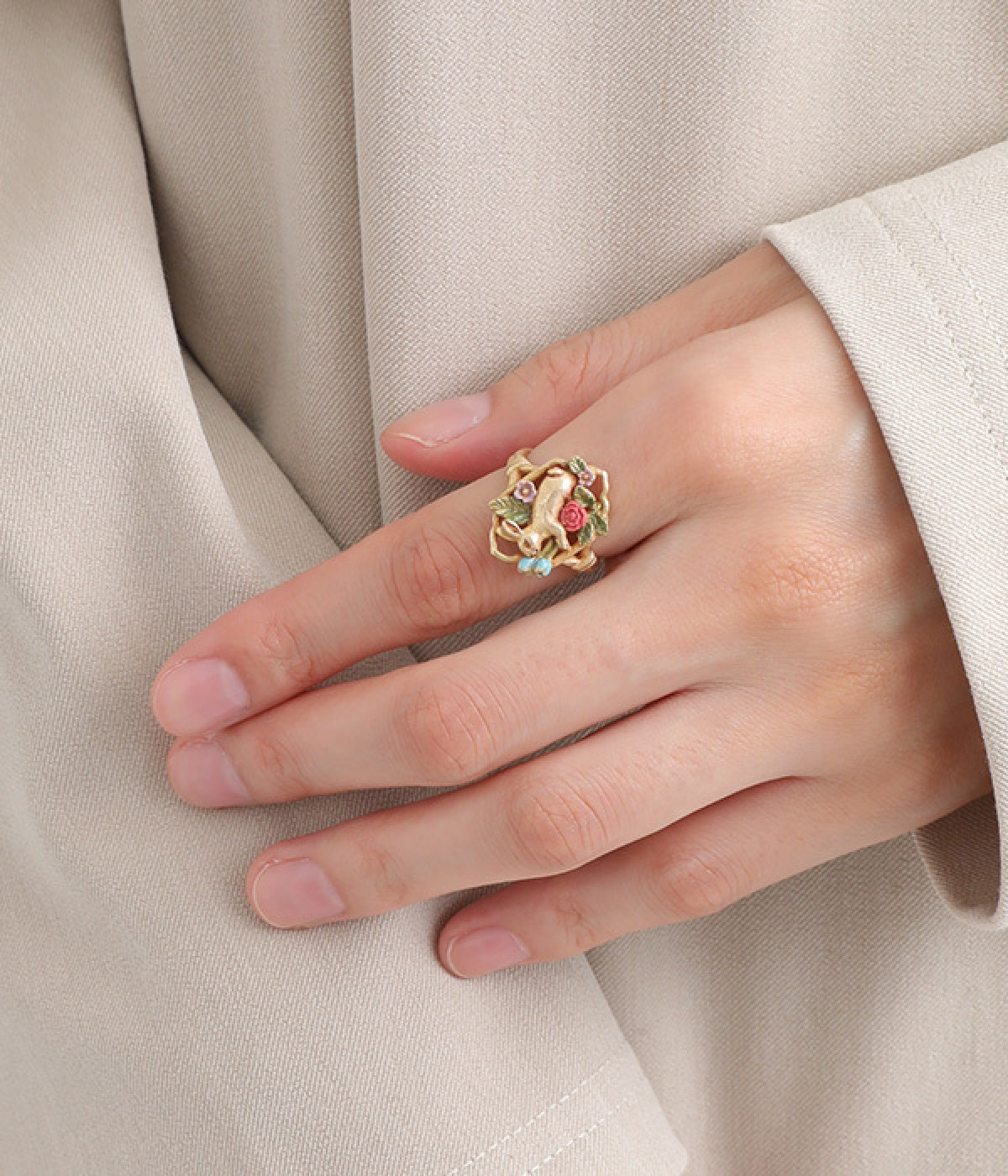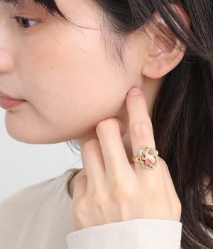 思わず魅入ってしまいそうな繊細なデザインのリング。花々が咲き乱れる幻想的な空間に、今にも飛び出してきそうなかわいらしい野ウサギが目を惹きます。小さなフォルムにやさしい色彩が詰め込まれ、手元を華やかに飾ってくれます。フリーサイズなのでお好みの指に着用できて、ちょっとしたプレゼントにも喜ばれそう。