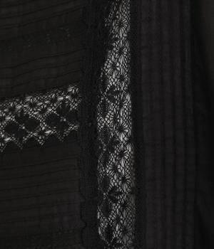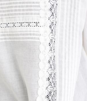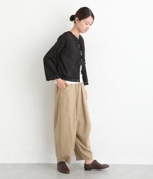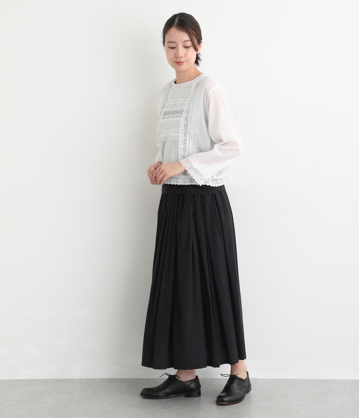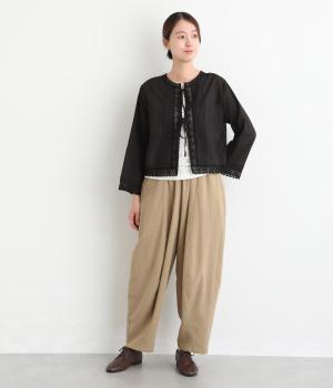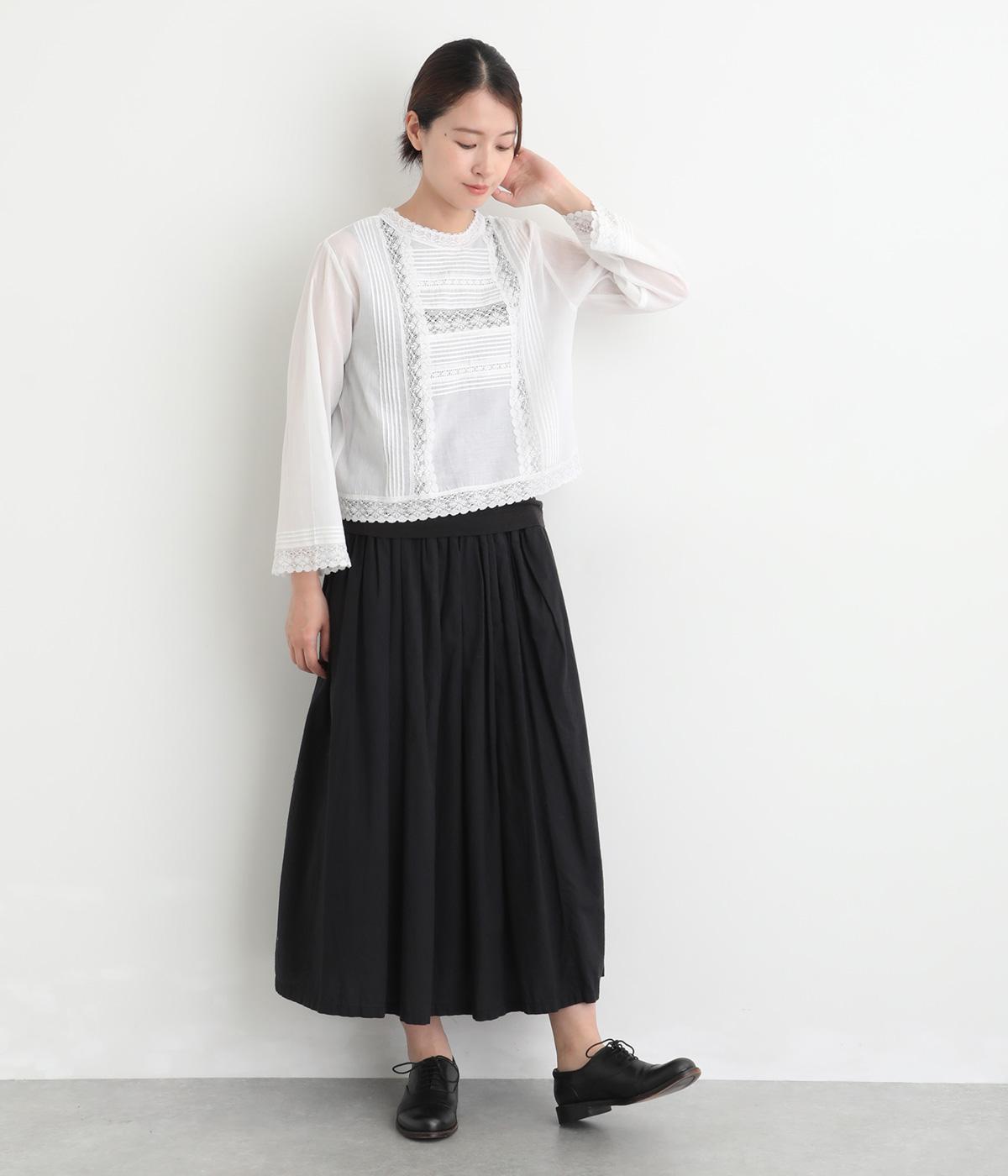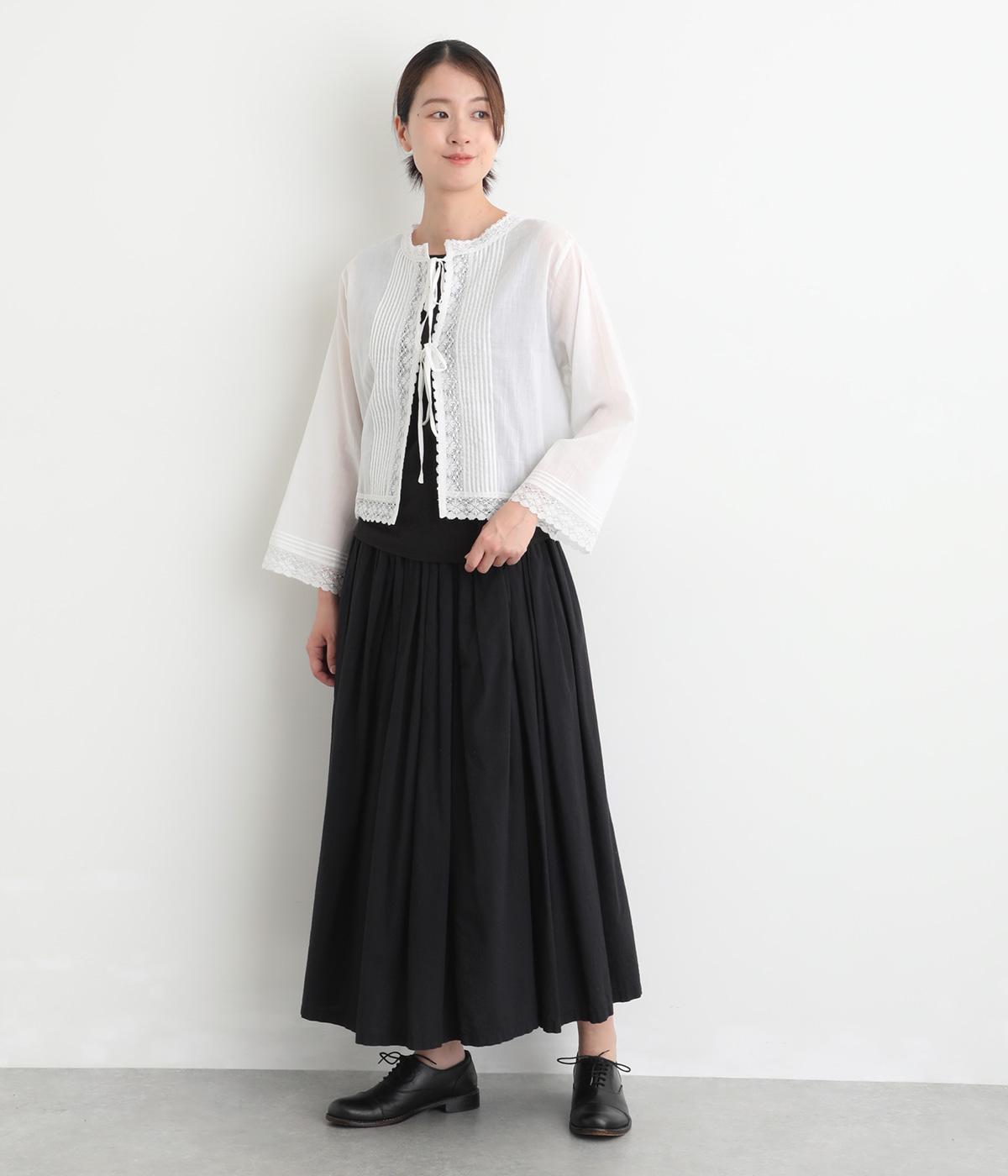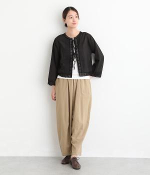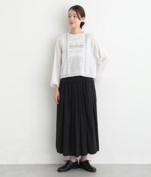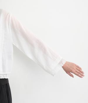 薄手でほんのり透け感のあるコットン生地。ふんわりと軽やかで通気性がよく、やさしい肌ざわりです。ネップのあるナチュラルな表情が魅力で、レースが華やかさを添えます。