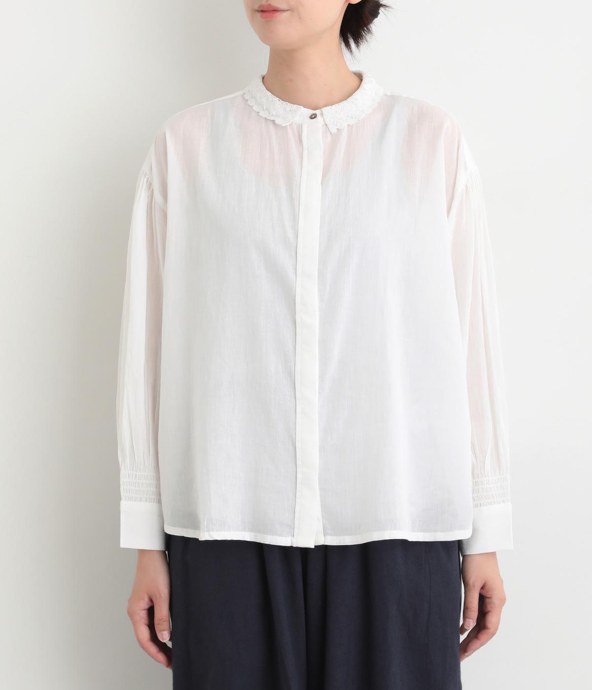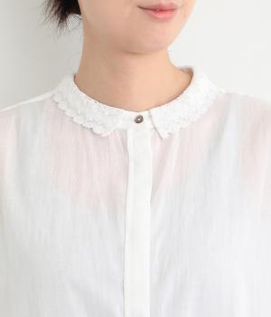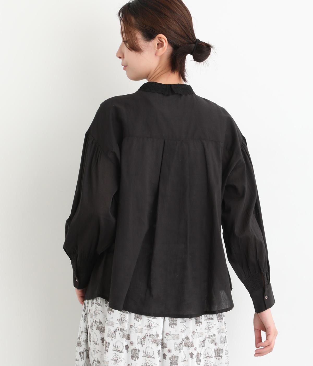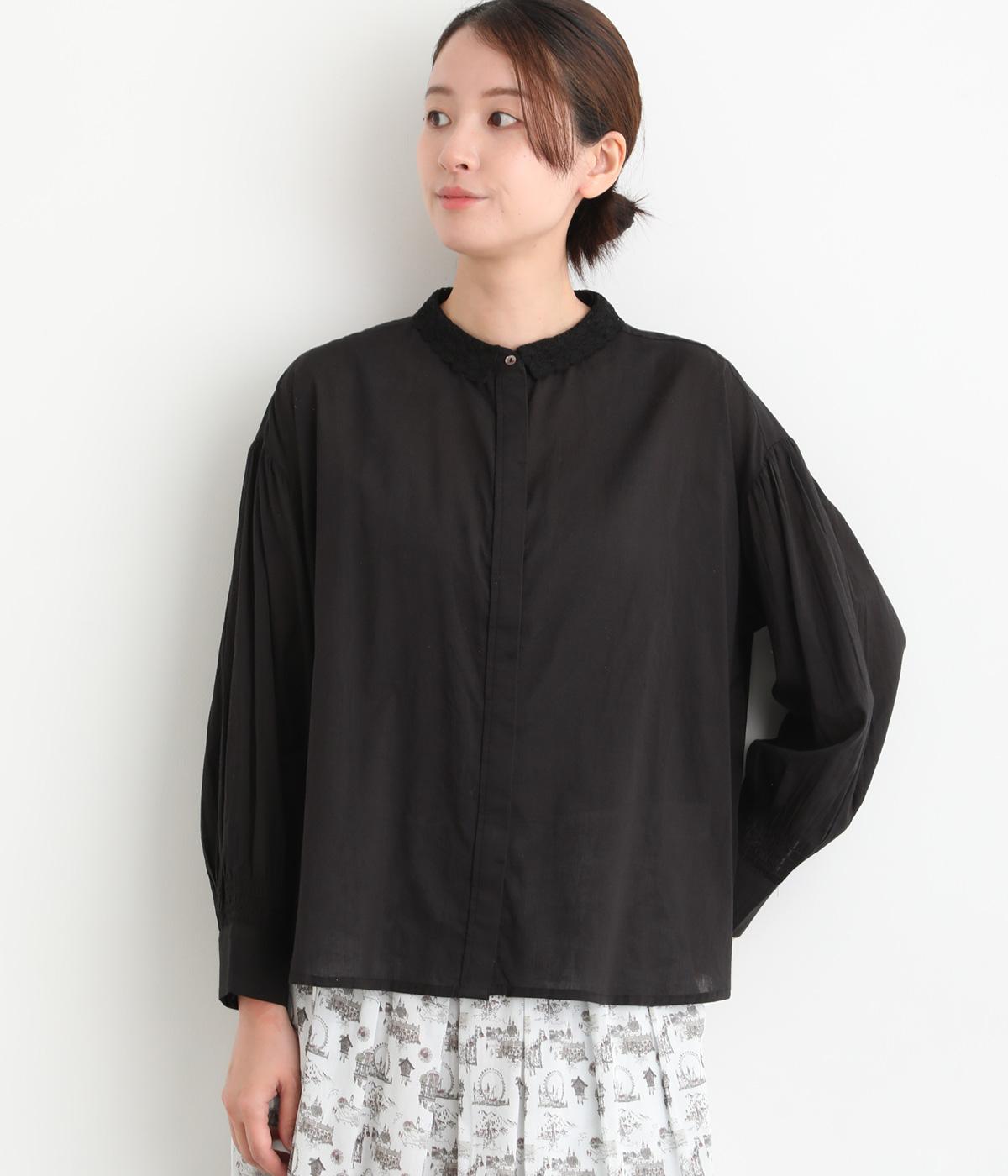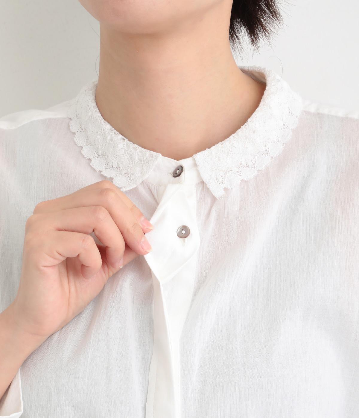 繊細なレース襟がエレガントな雰囲気のブラウス。フロントは比翼仕立てですっきりとした印象に。袖口にはシャーリングをあしらい、さりげない表情を添えています。軽やかな生地感で、装いにやさしい華やぎを添える一枚です。