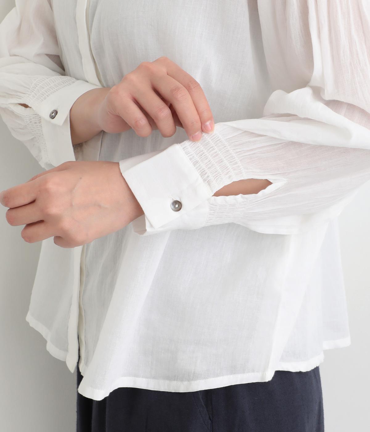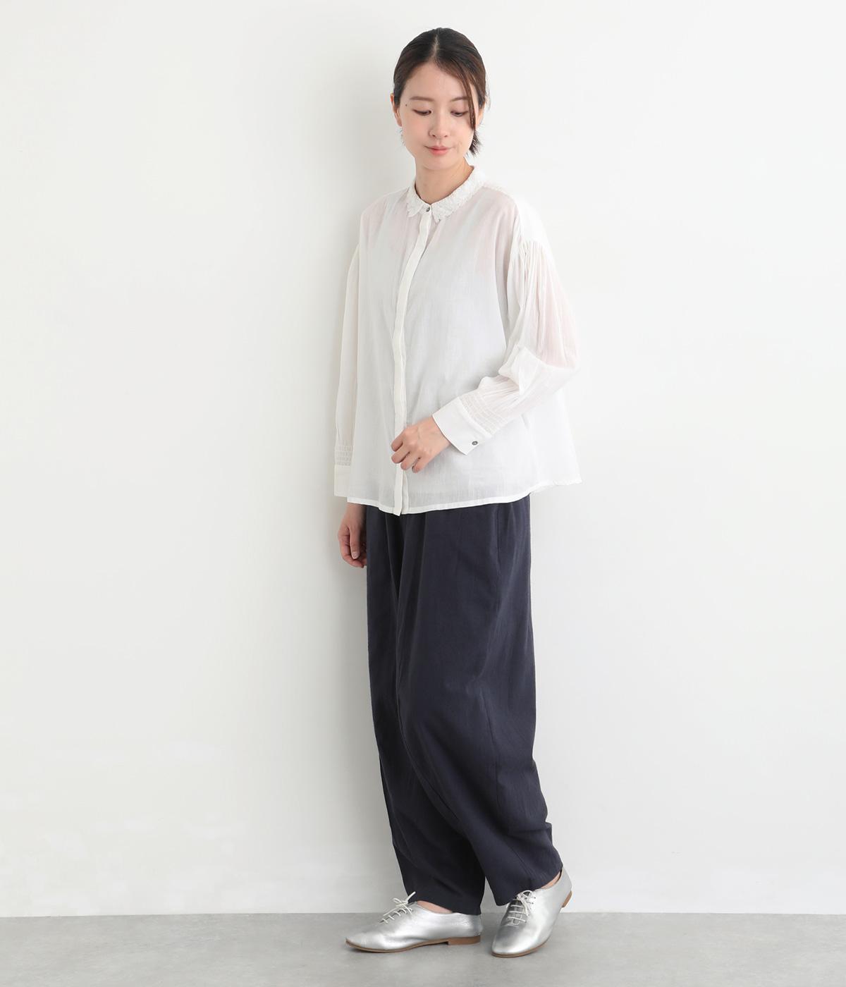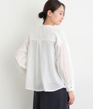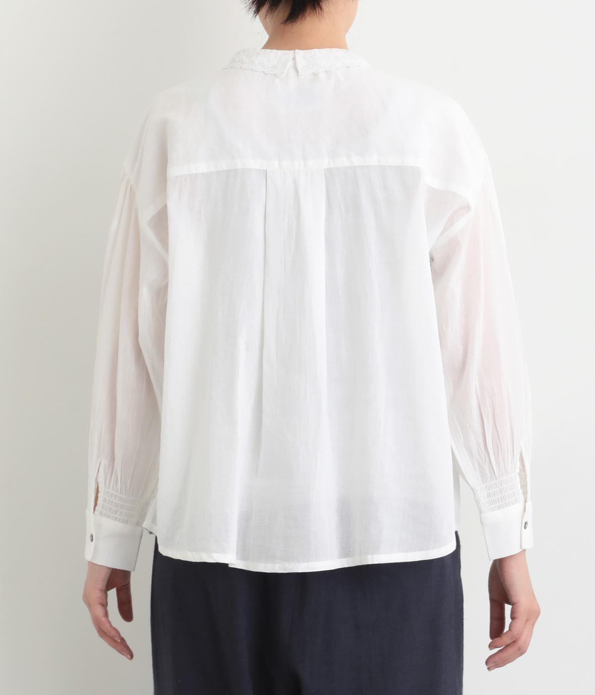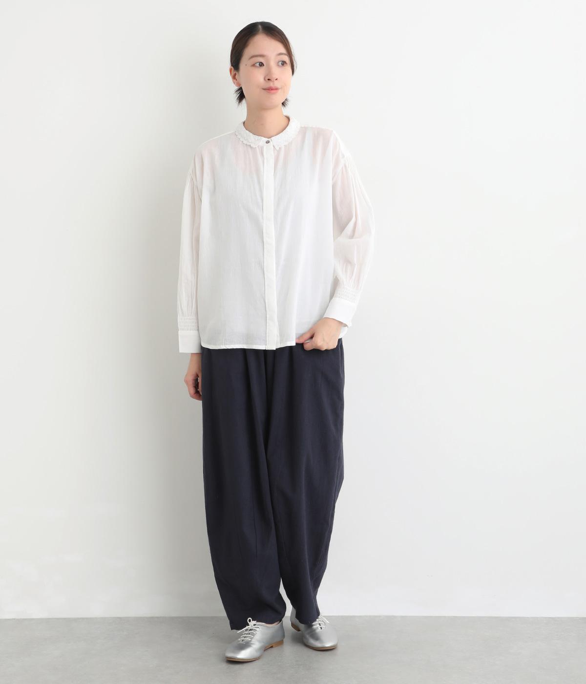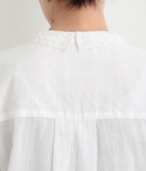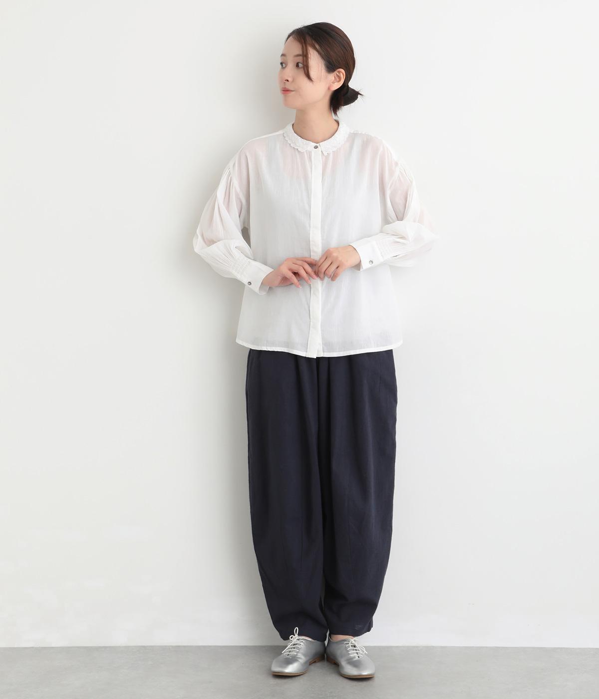 繊細なレース襟がエレガントな雰囲気のブラウス。フロントは比翼仕立てですっきりとした印象に。袖口にはシャーリングをあしらい、さりげない表情を添えています。軽やかな生地感で、装いにやさしい華やぎを添える一枚です。