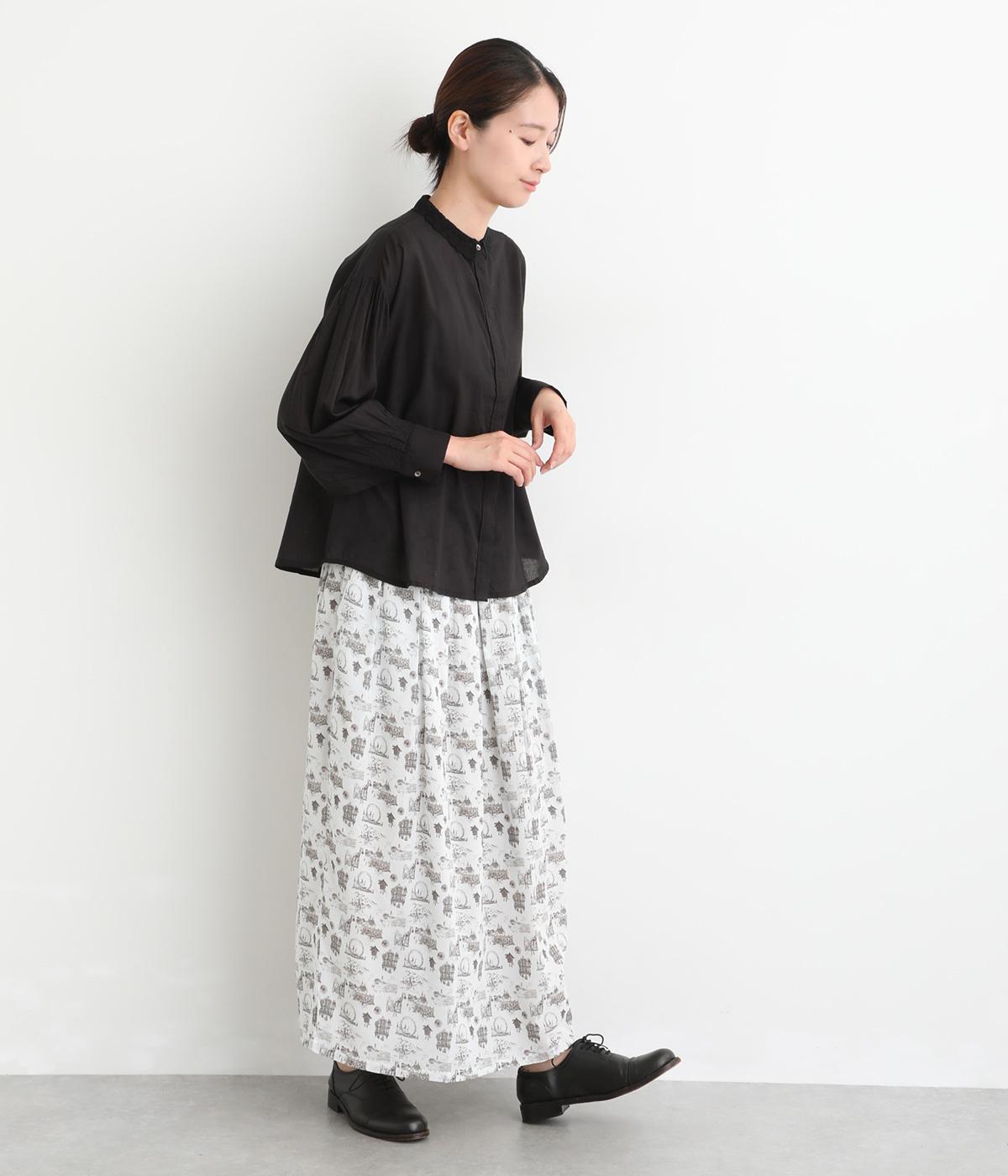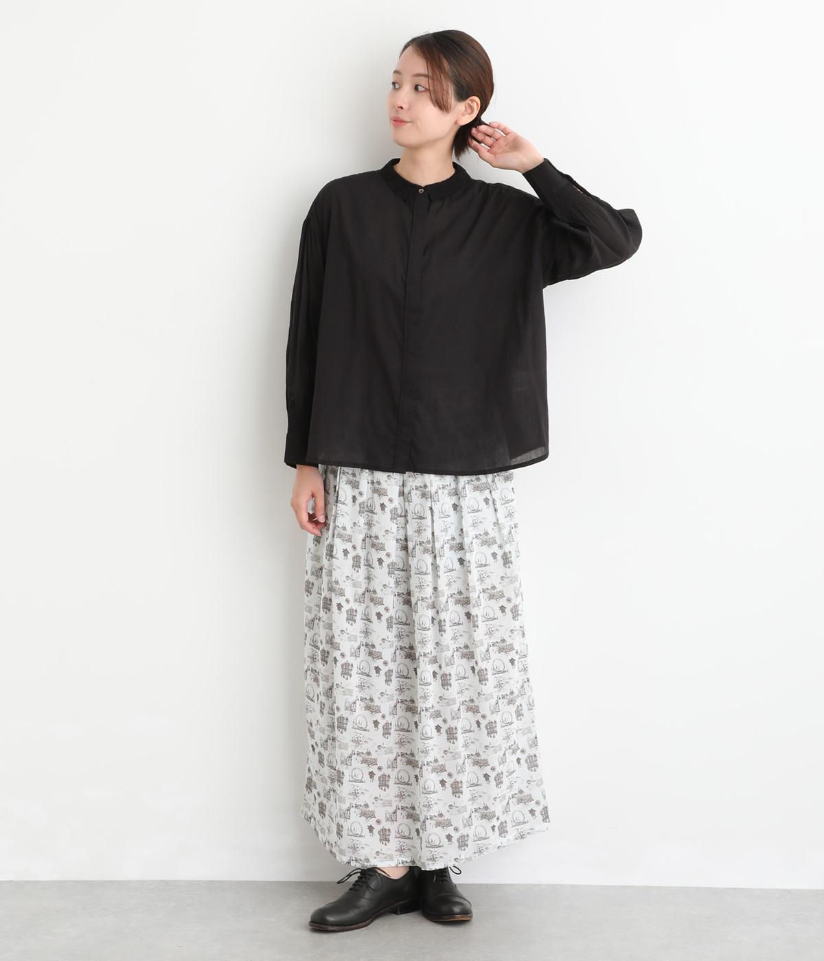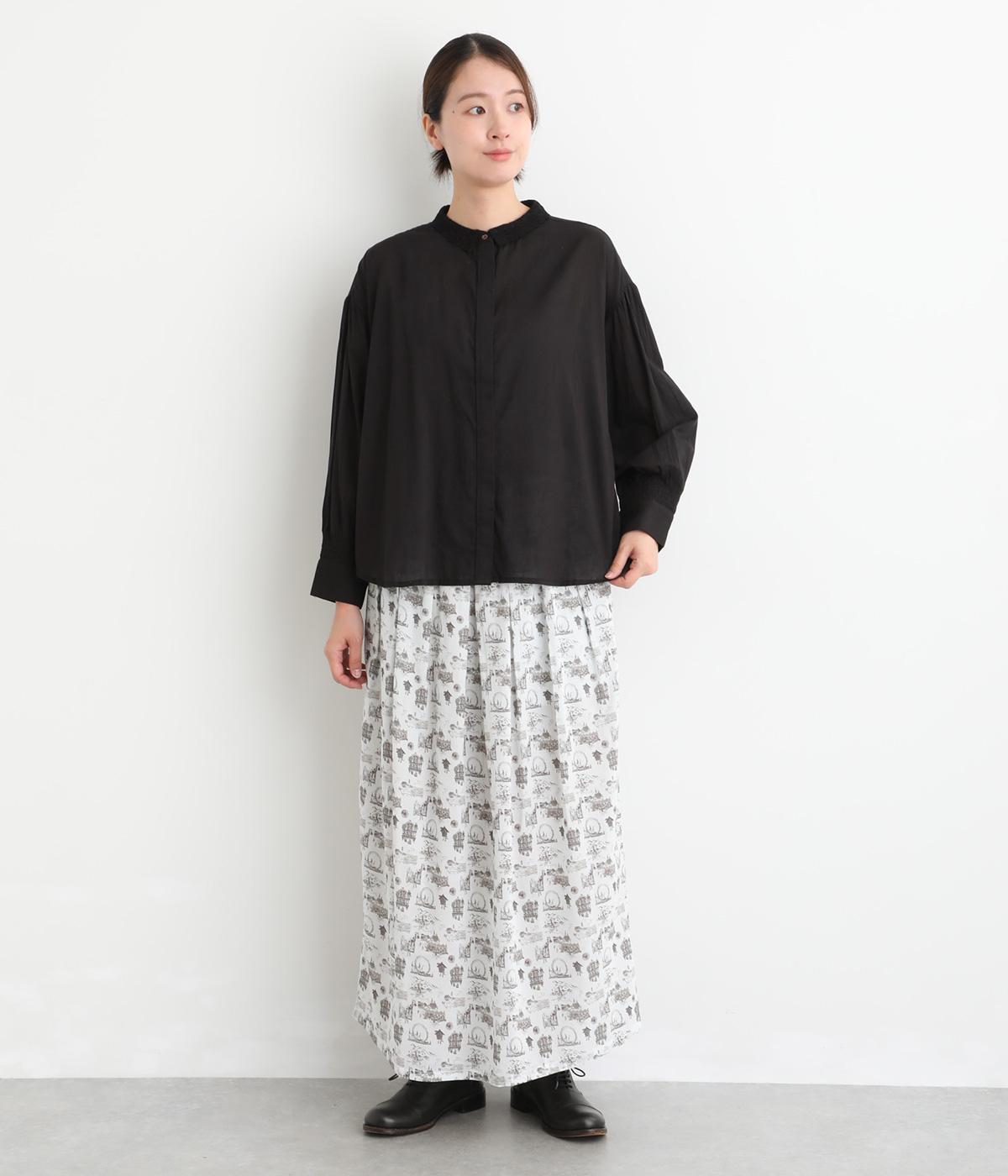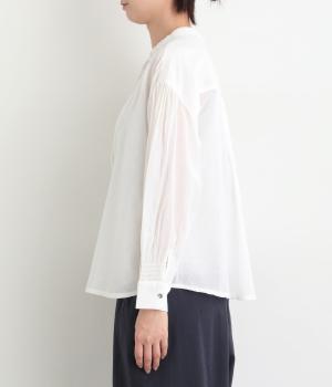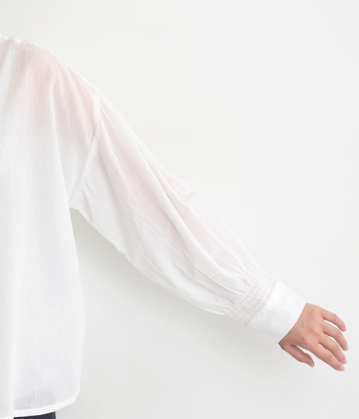 繊細なレース襟がエレガントな雰囲気のブラウス。フロントは比翼仕立てですっきりとした印象に。袖口にはシャーリングをあしらい、さりげない表情を添えています。軽やかな生地感で、装いにやさしい華やぎを添える一枚です。