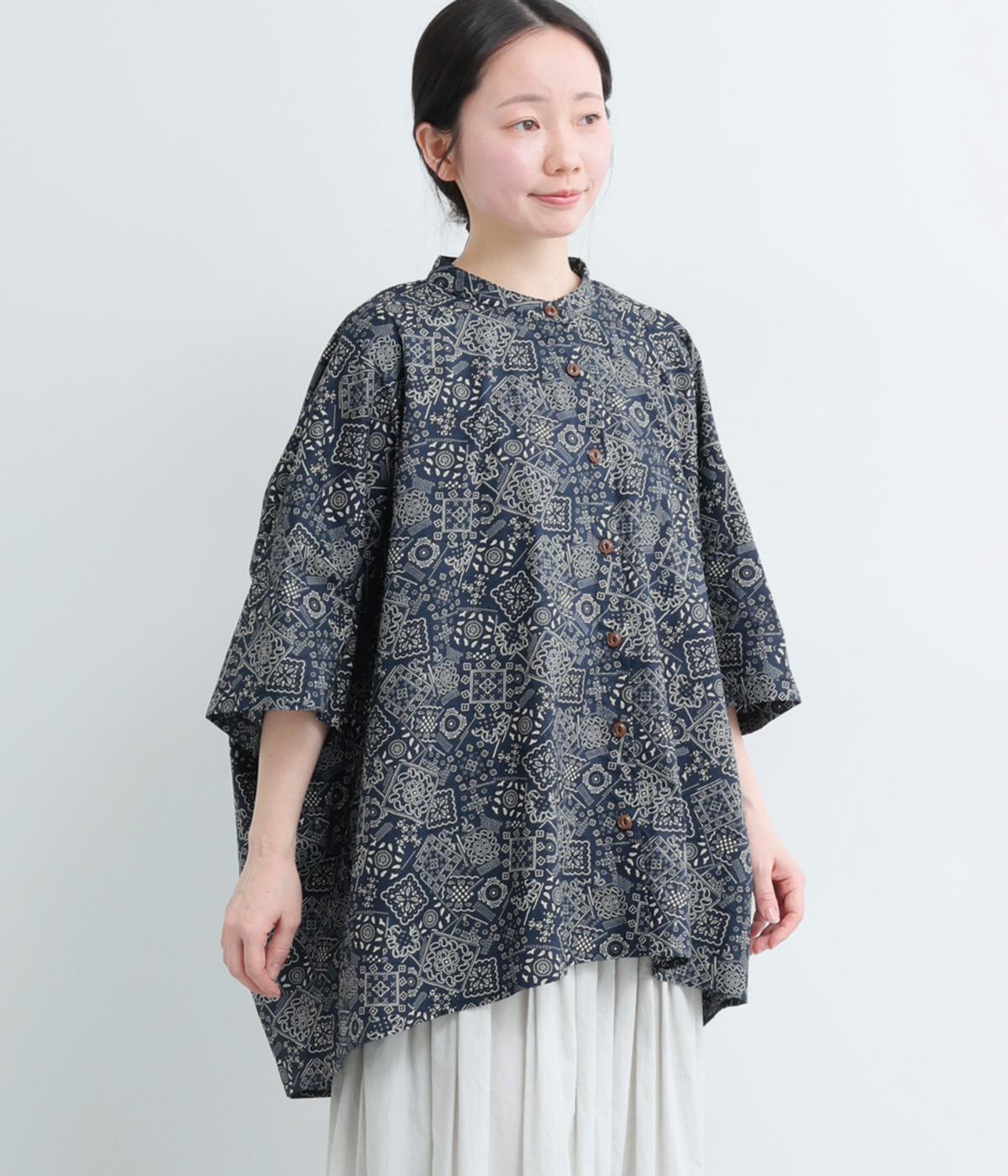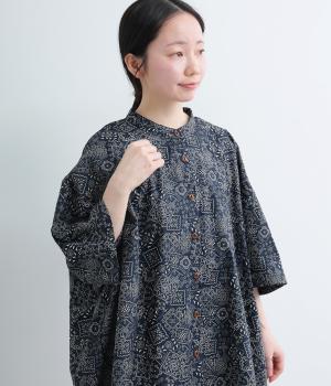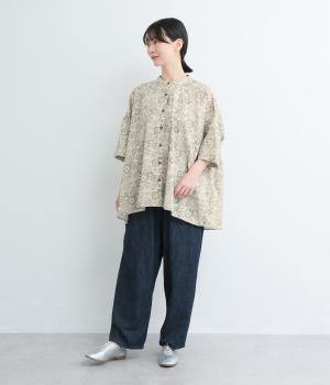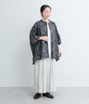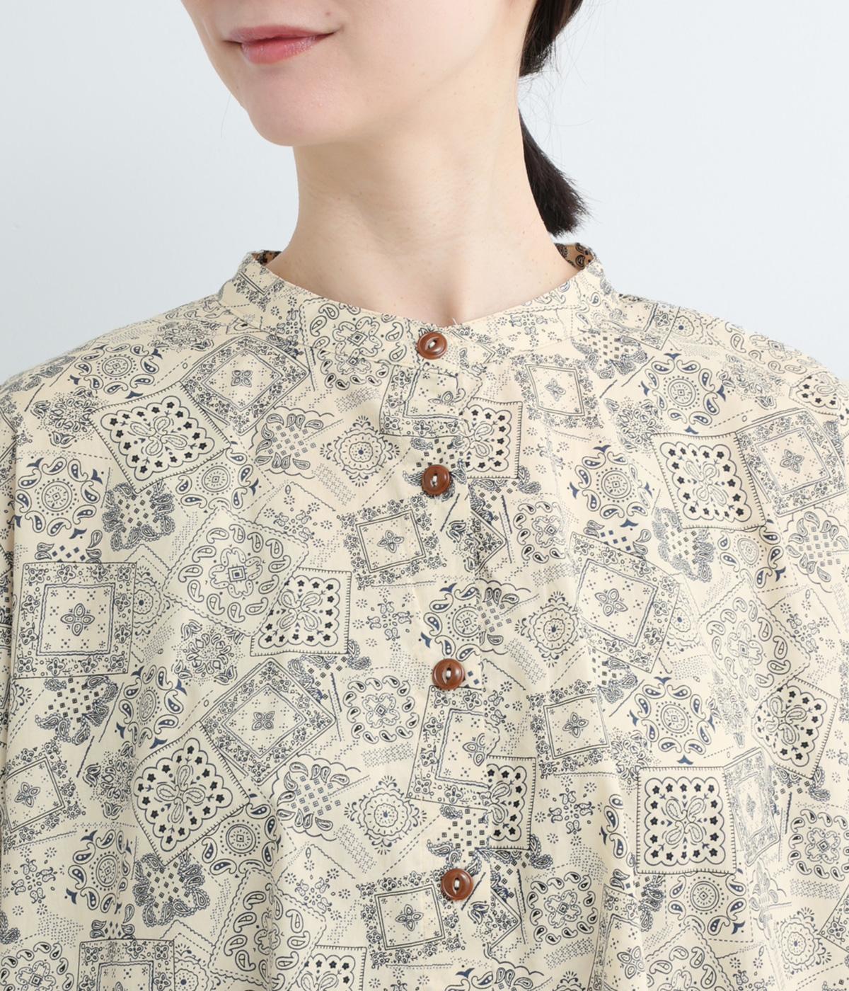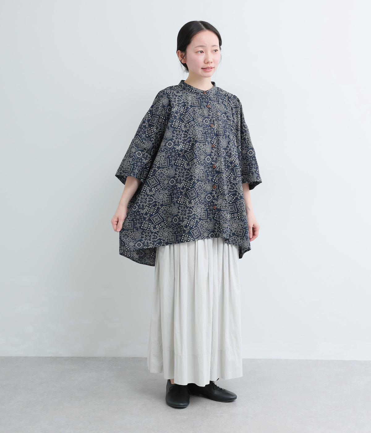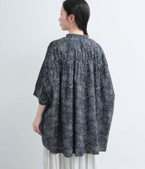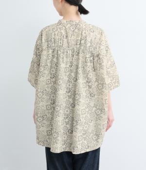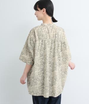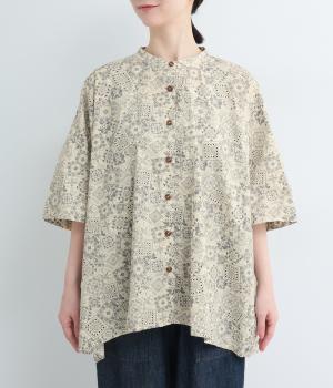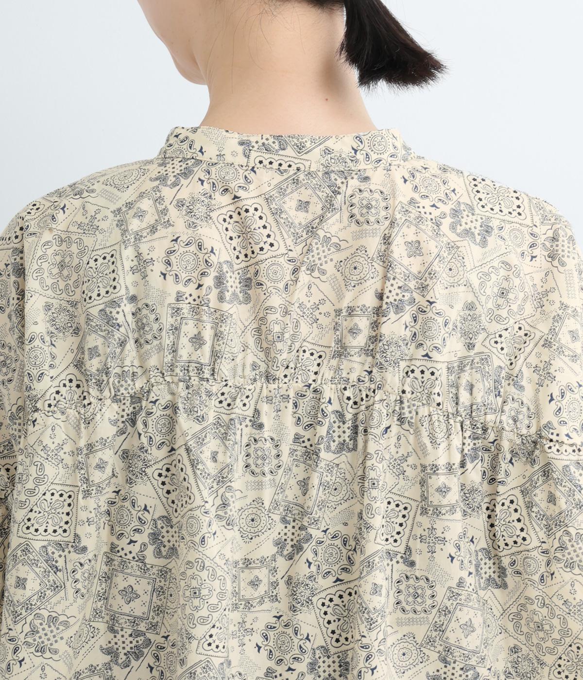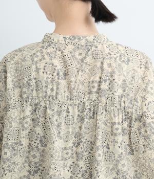 パッチワーク風のにぎやかな総柄がアイキャッチになるシャツ。前はすっきりとフレアに、後ろはヨークギャザーでドレープ感を強調。凛としたバンドカラーに太めの袖が甘さを中和し、バランスよく着こなせます。ラフな羽織りも◎。