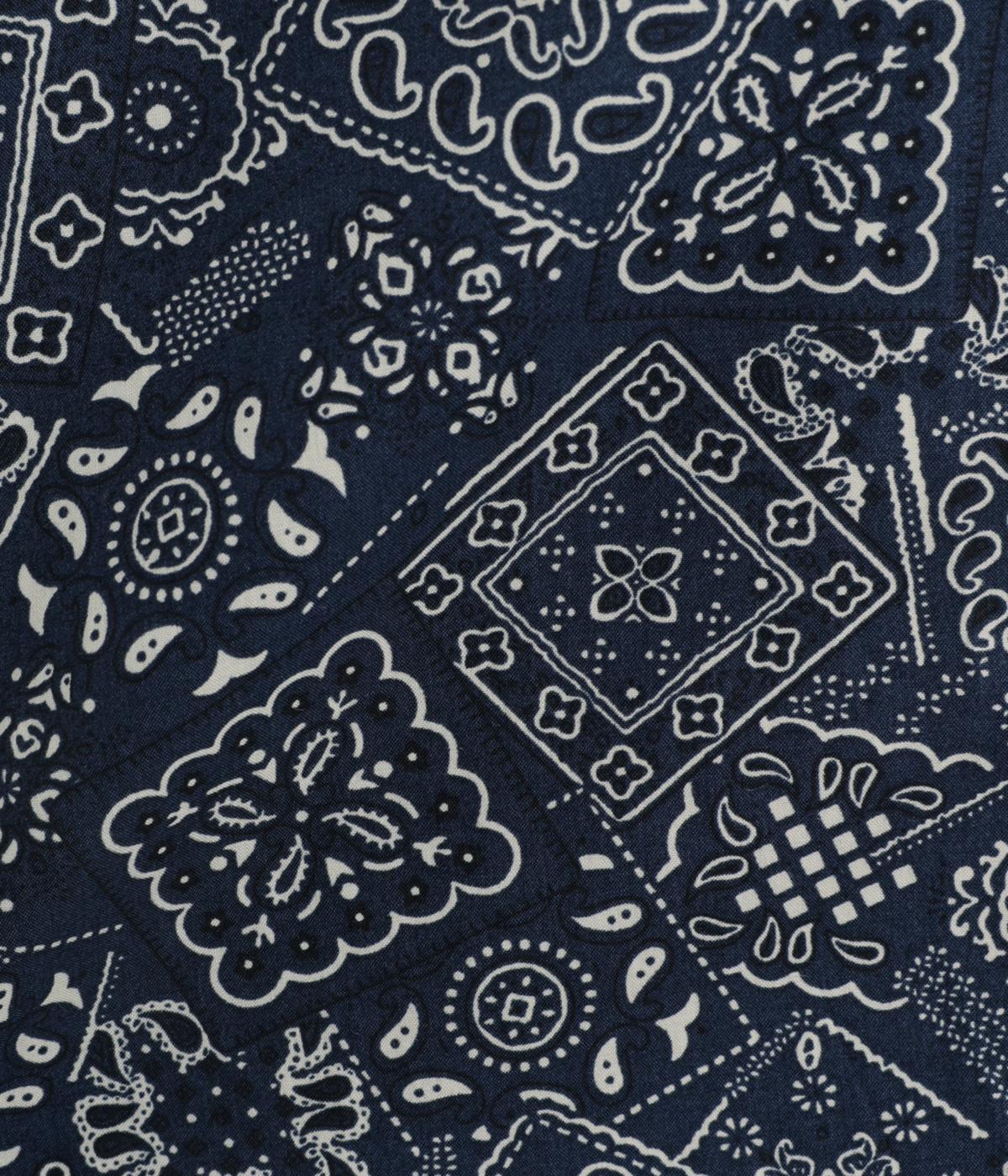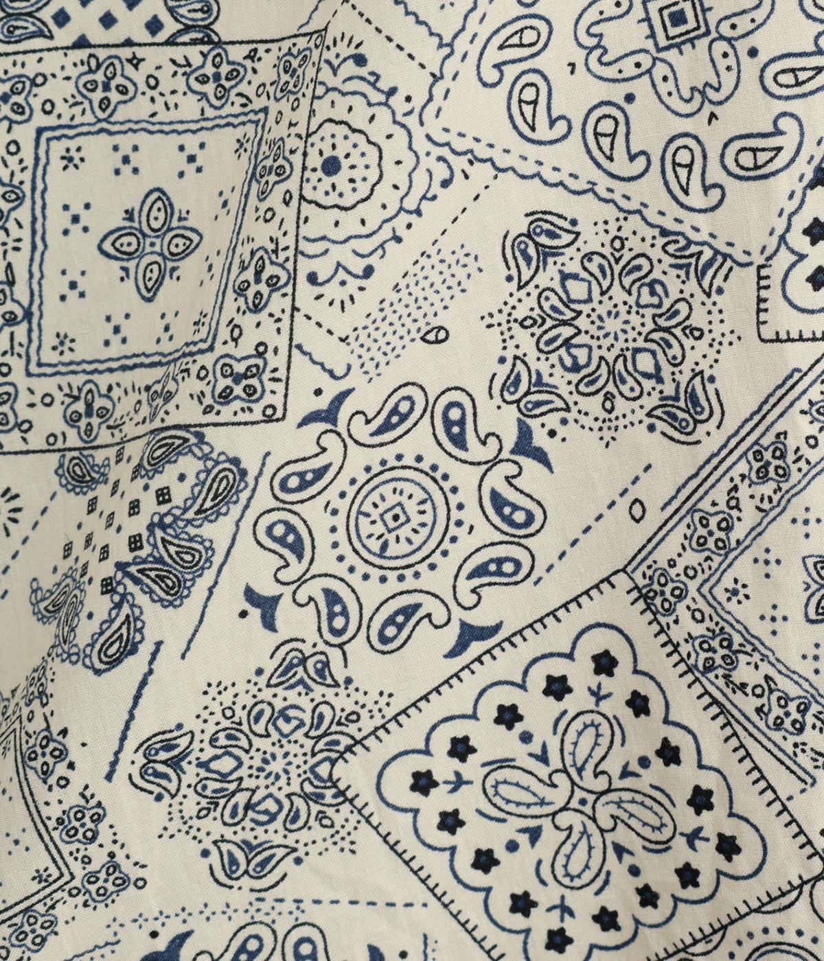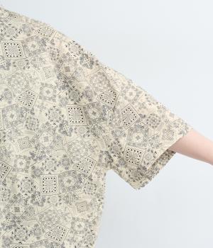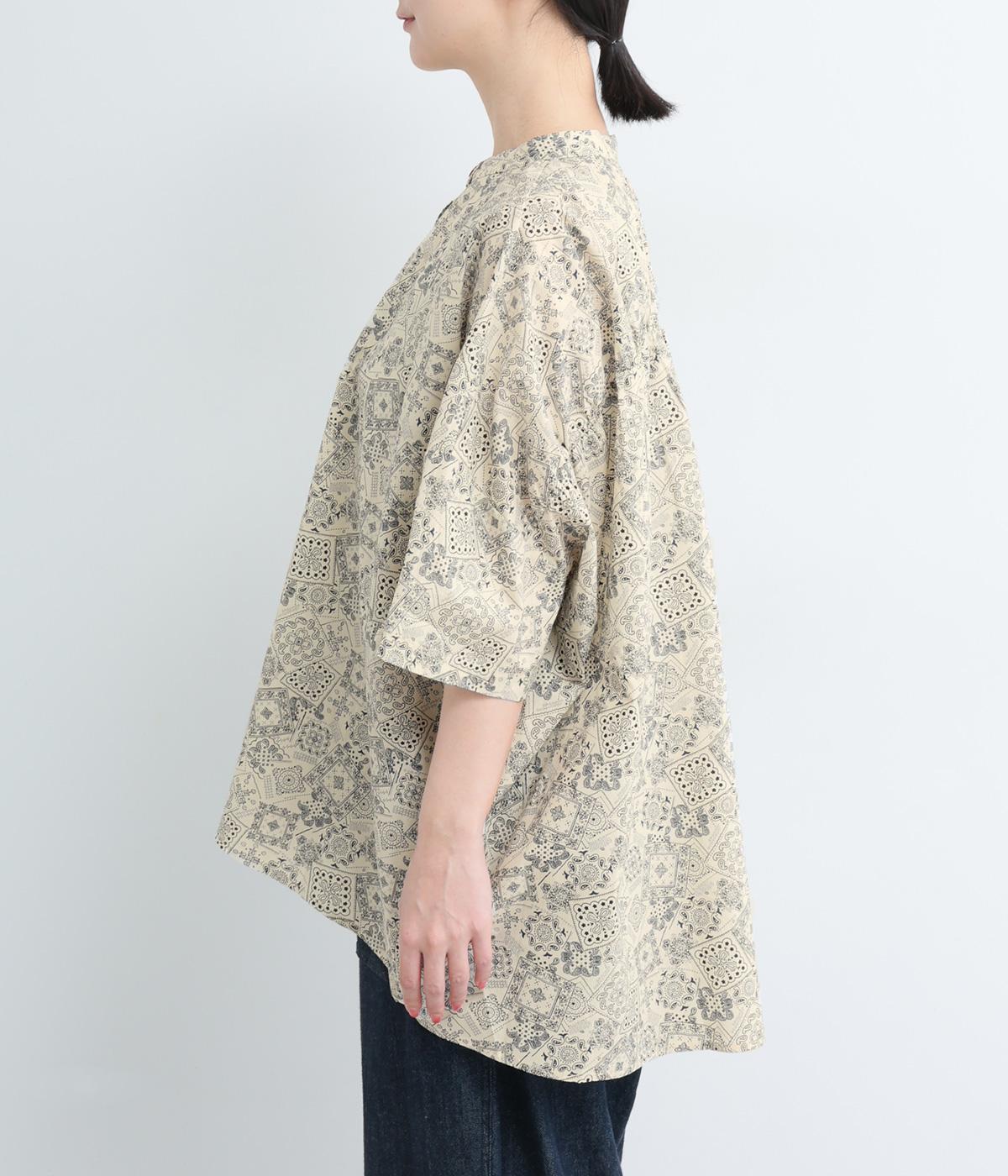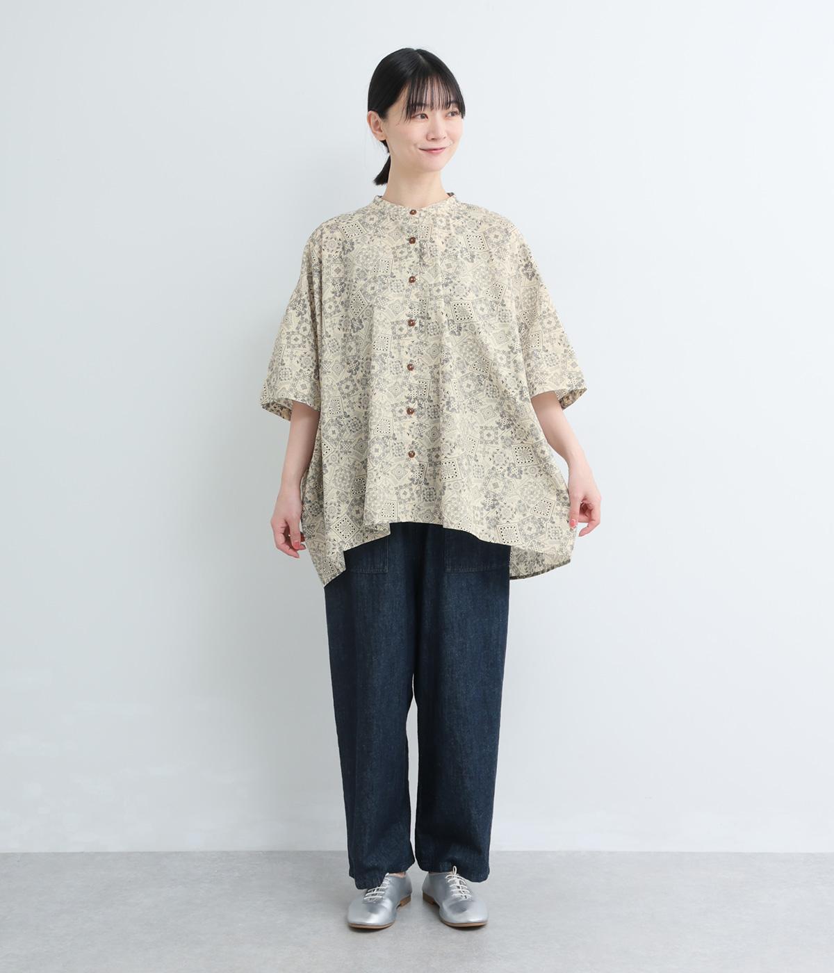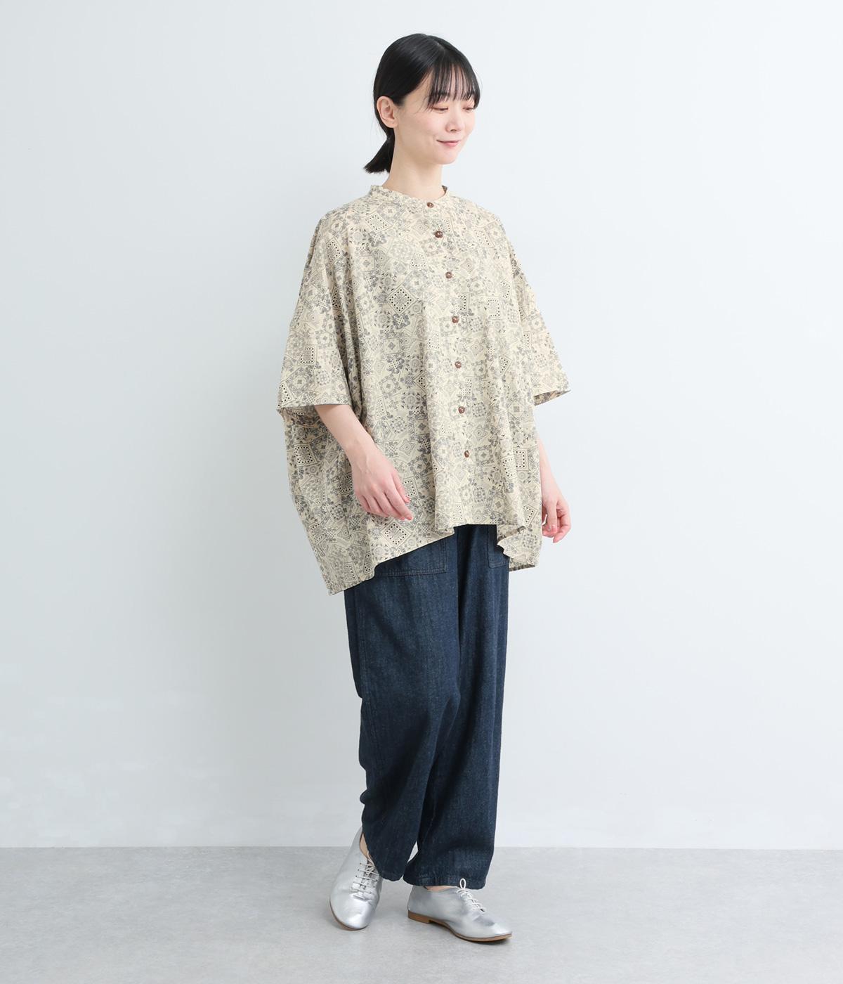 パッチワーク風のにぎやかな総柄がアイキャッチになるシャツ。前はすっきりとフレアに、後ろはヨークギャザーでドレープ感を強調。凛としたバンドカラーに太めの袖が甘さを中和し、バランスよく着こなせます。ラフな羽織りも◎。
