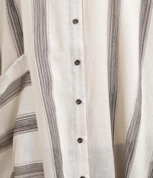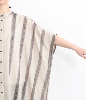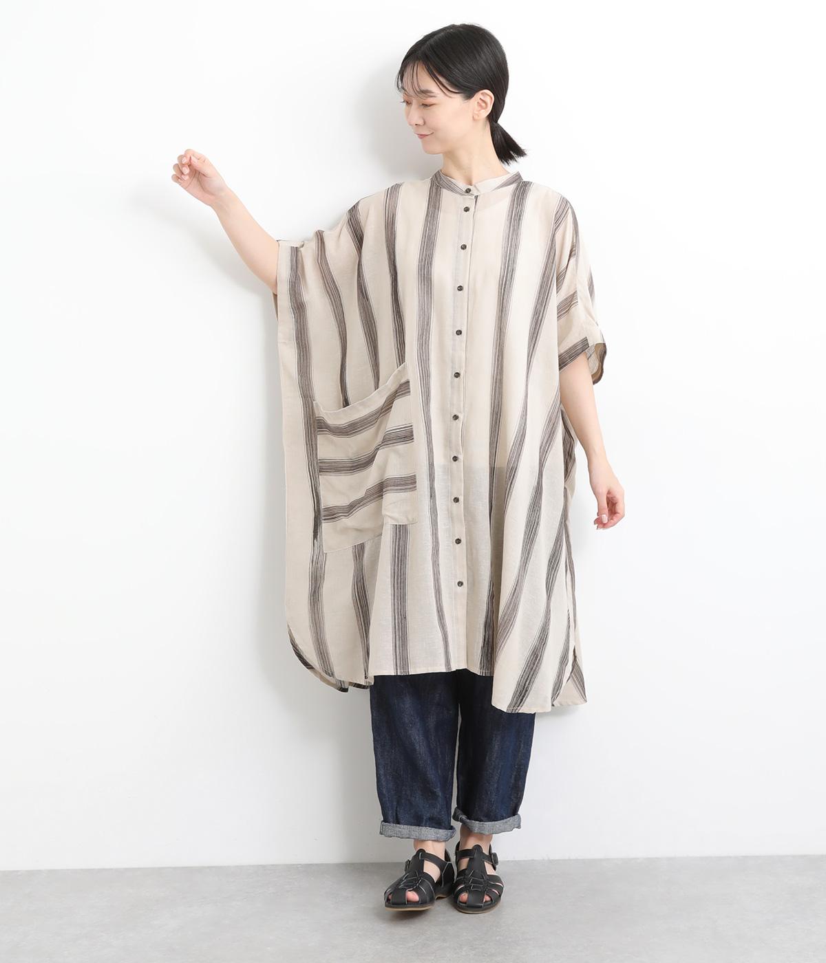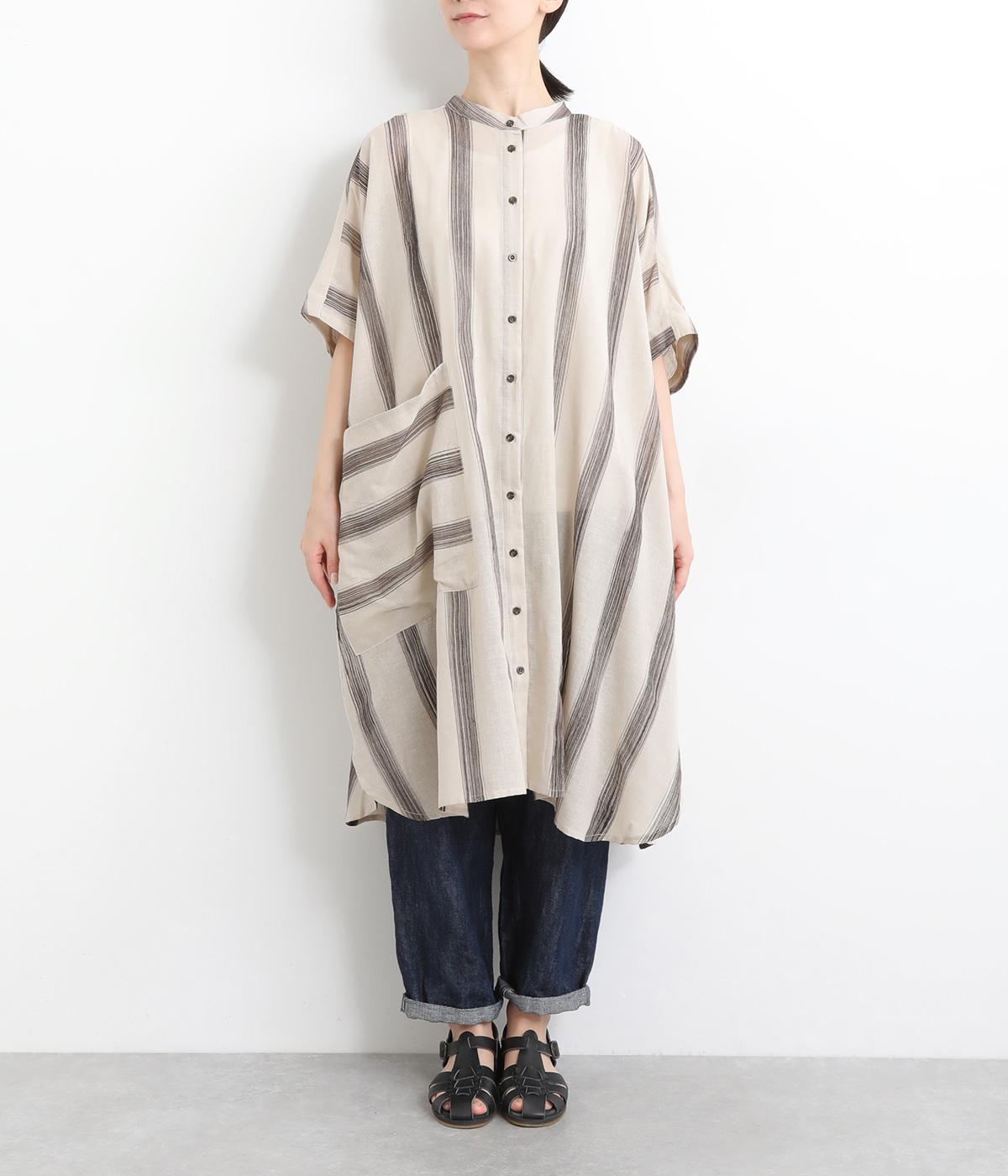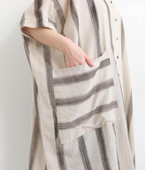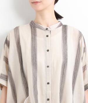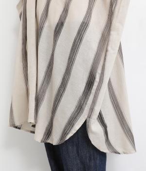 太いブラシで大胆にストライプ柄を手書きで描いたブラウスです。縦のラインはワンランク上のハンサムな印象に。右側のみ配置した大きめポケットがアクセントをきかせています。