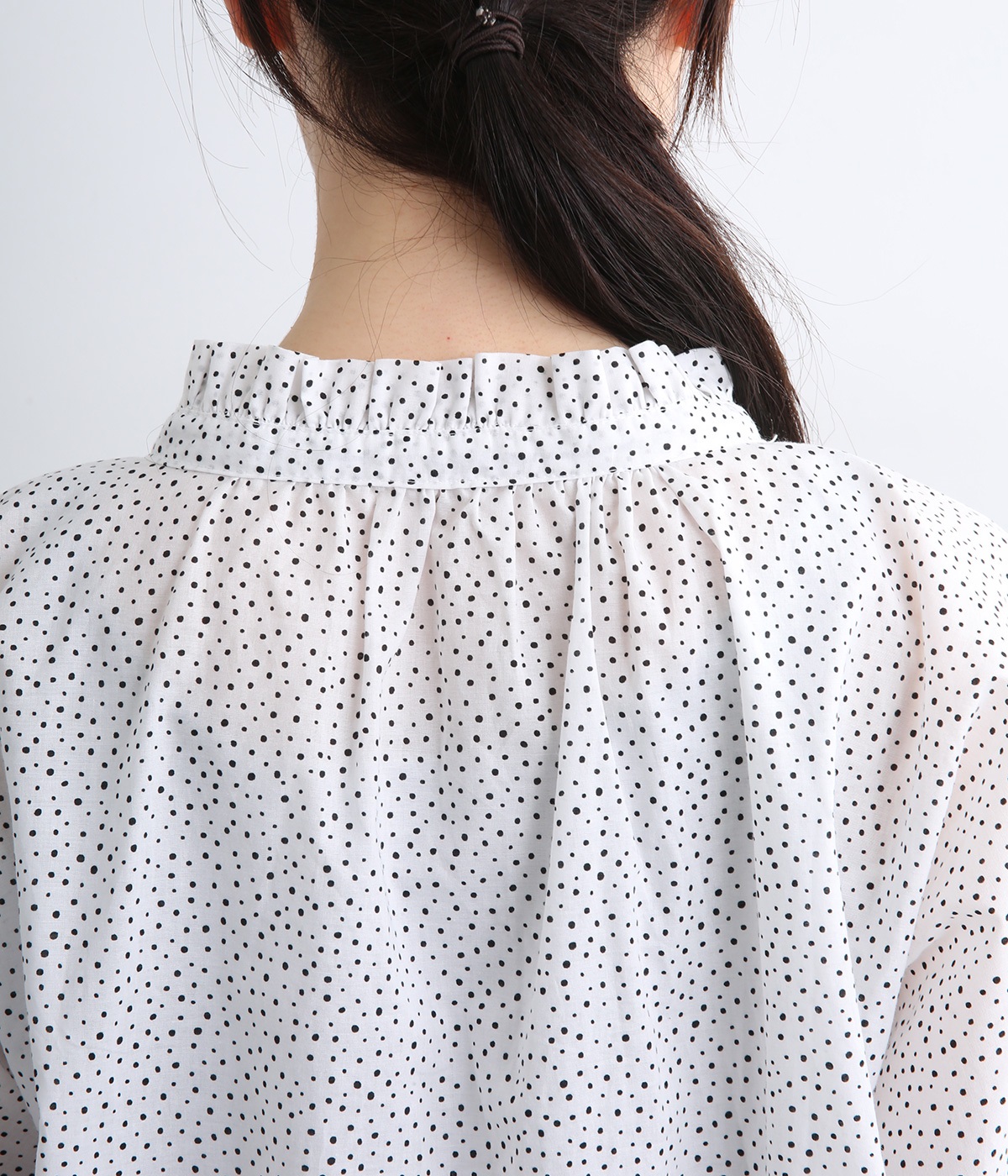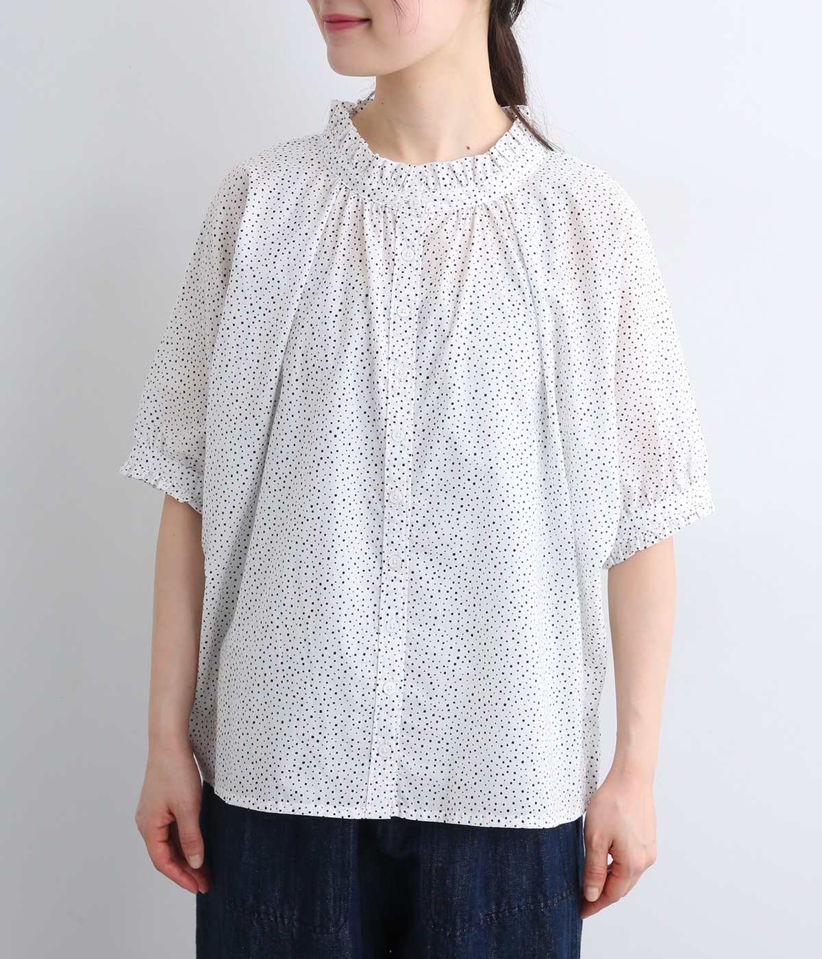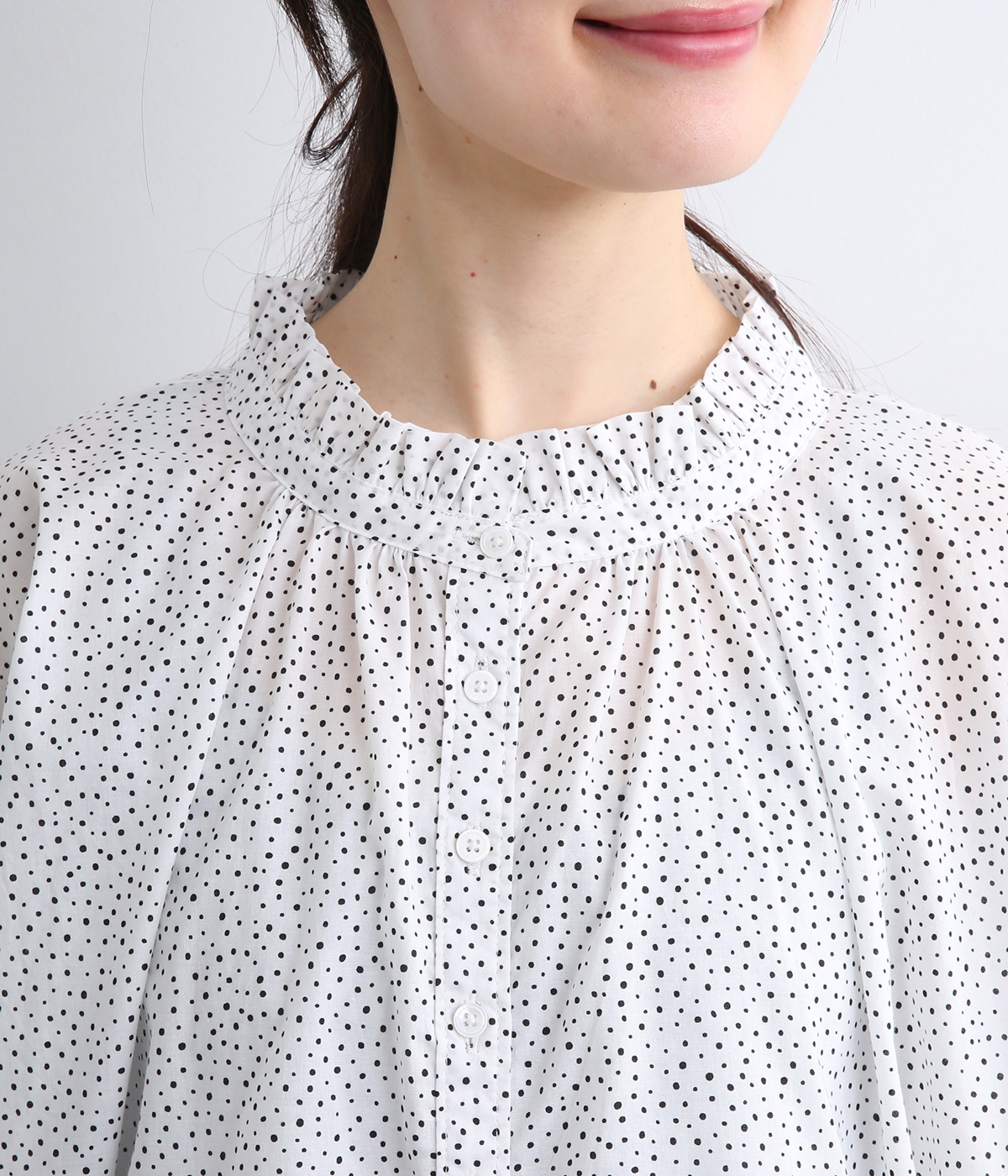 襟と袖口にフリルをあしらった上品な佇まいのブラウス。体がゆったりと泳ぐドルマンシルエットで、リラックス感あふれるやわらかなフォルムに。前立てには、艶めくシェルボタンが上品なアクセントを添えます。