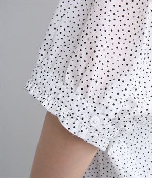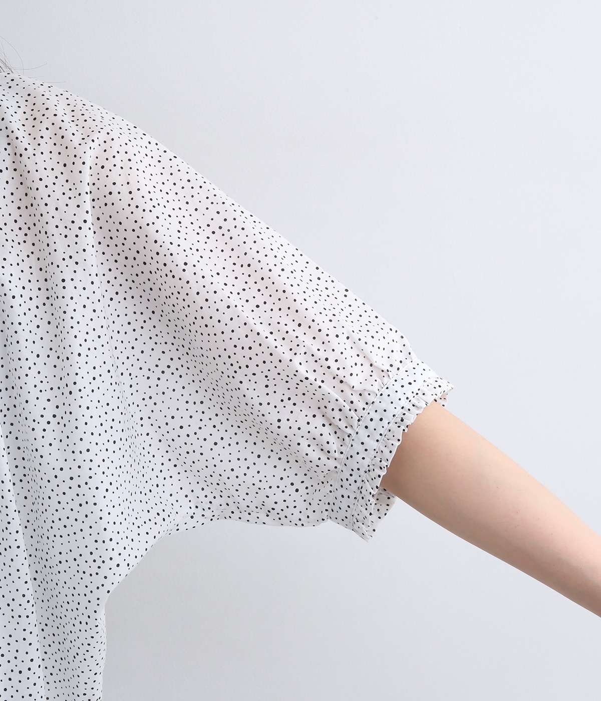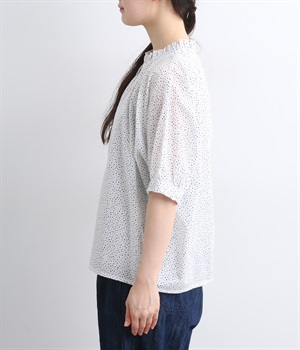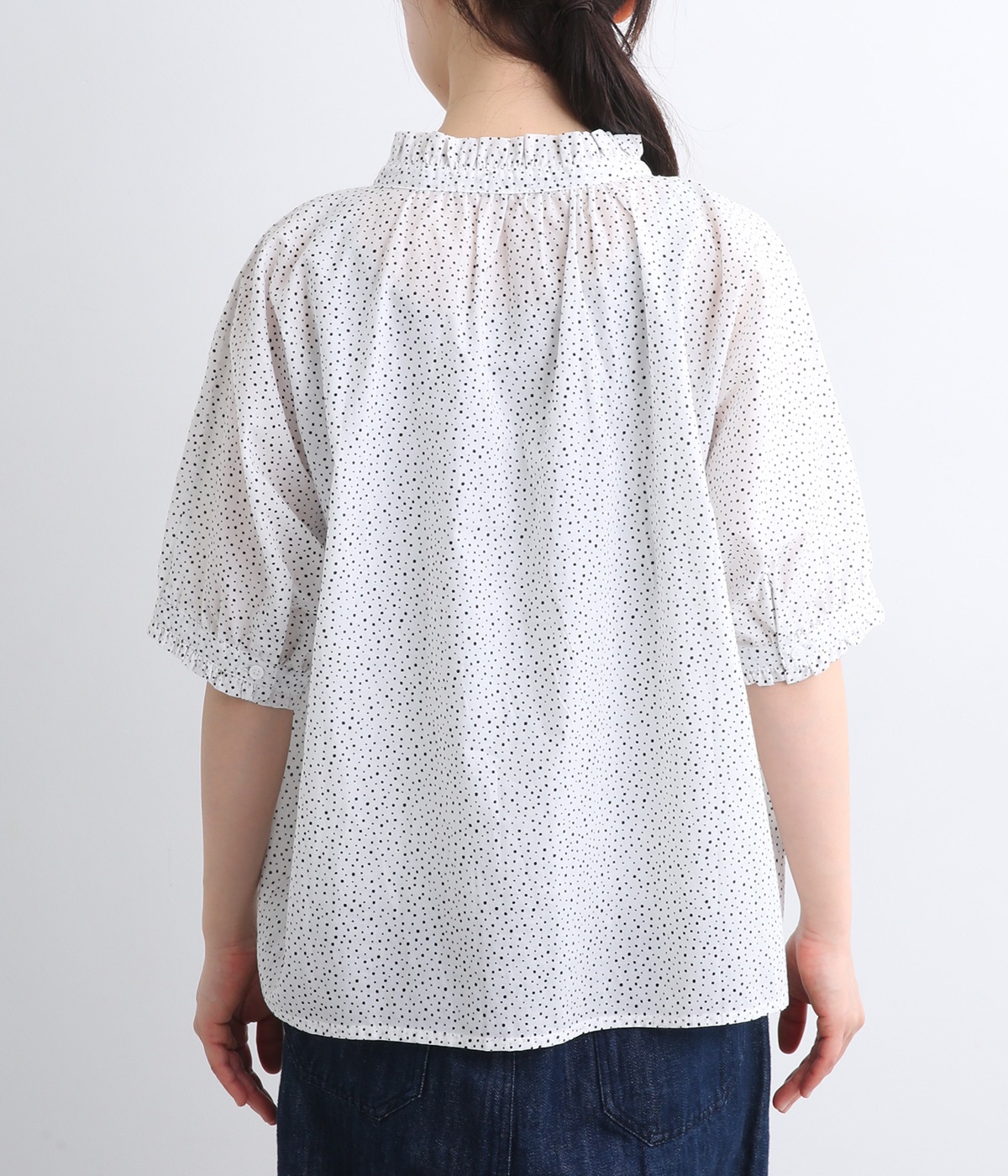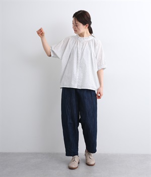 襟と袖口にフリルをあしらった上品な佇まいのブラウス。体がゆったりと泳ぐドルマンシルエットで、リラックス感あふれるやわらかなフォルムに。前立てには、艶めくシェルボタンが上品なアクセントを添えます。