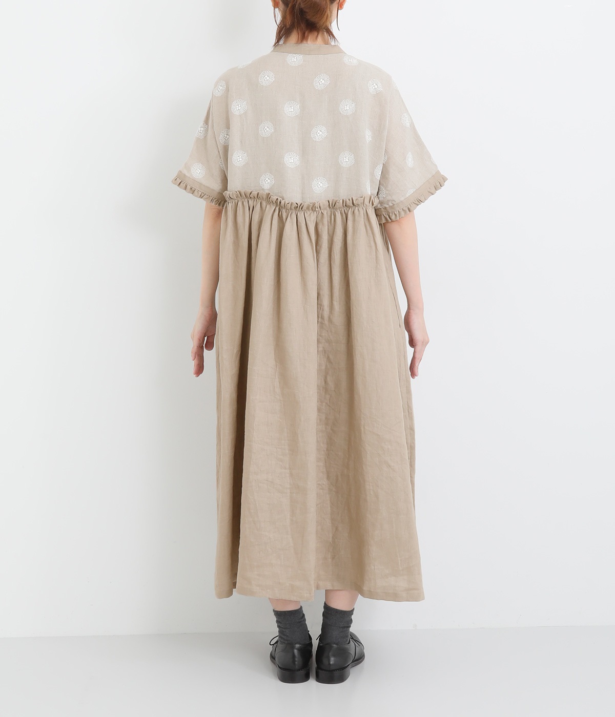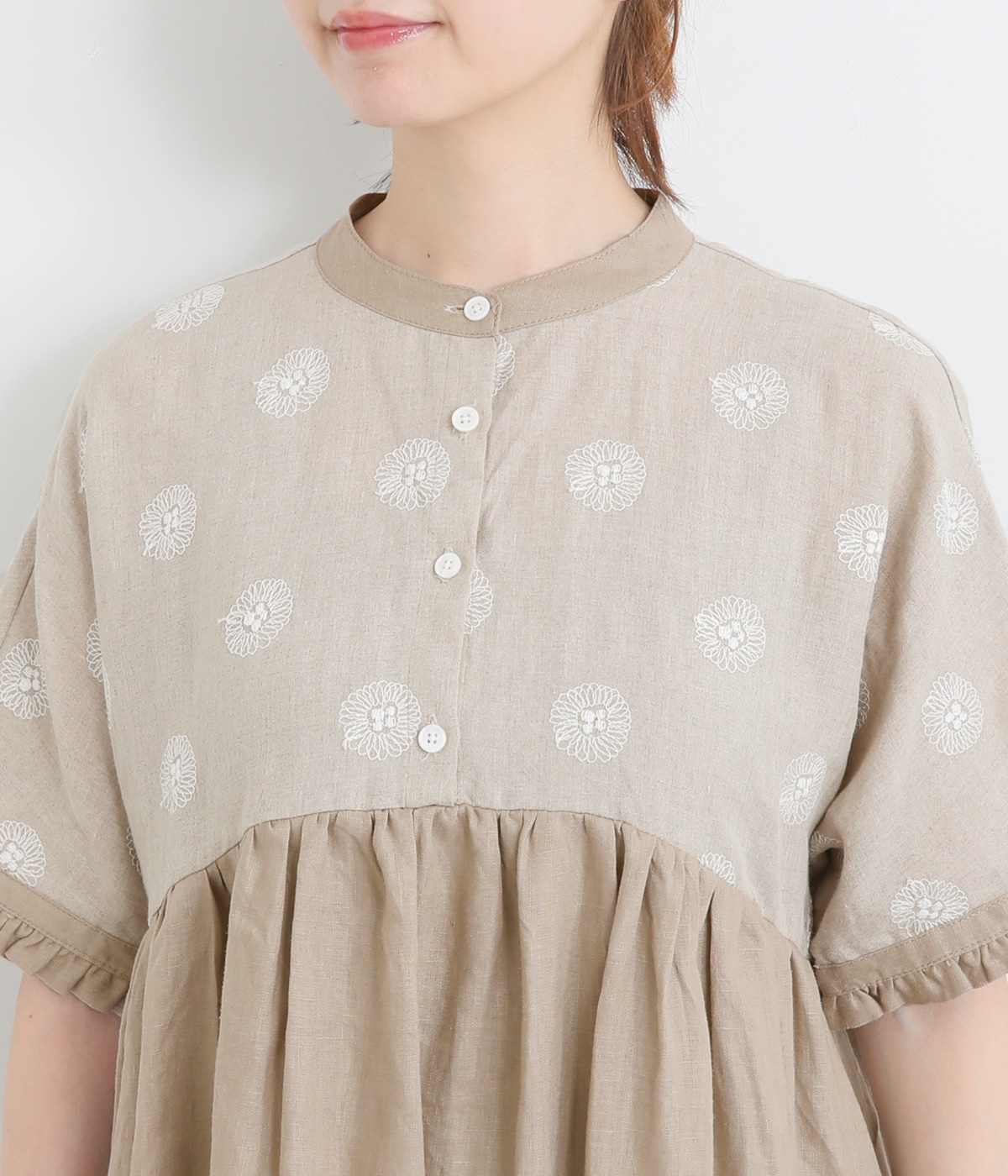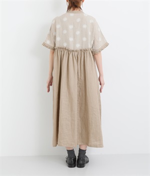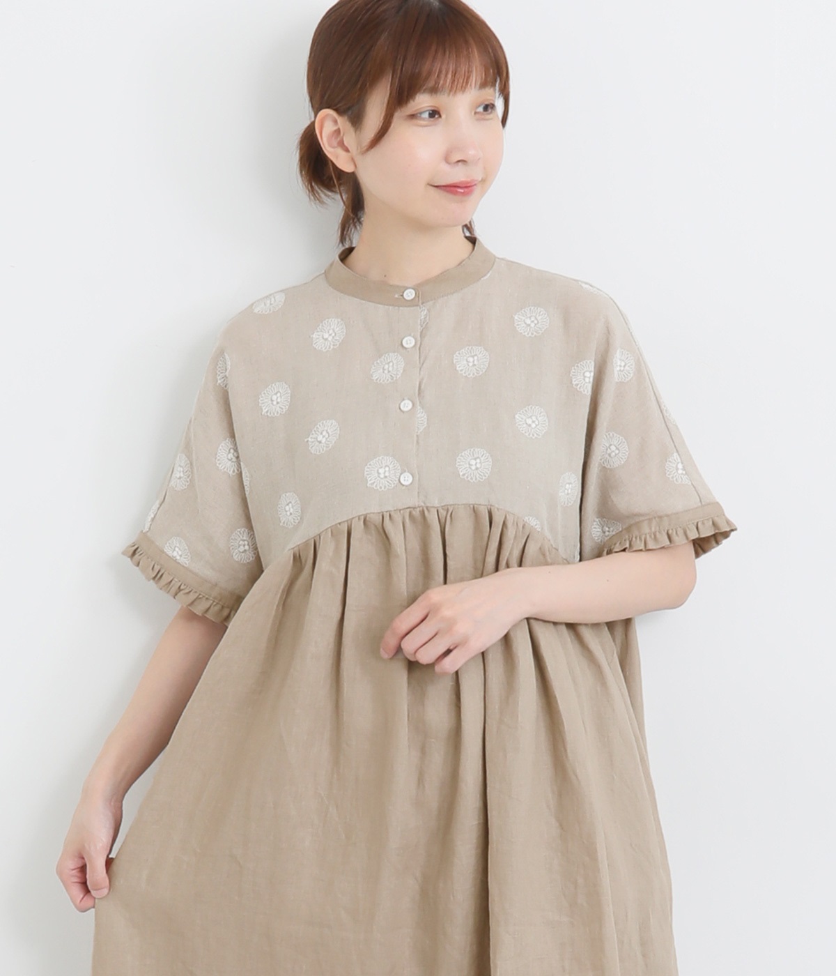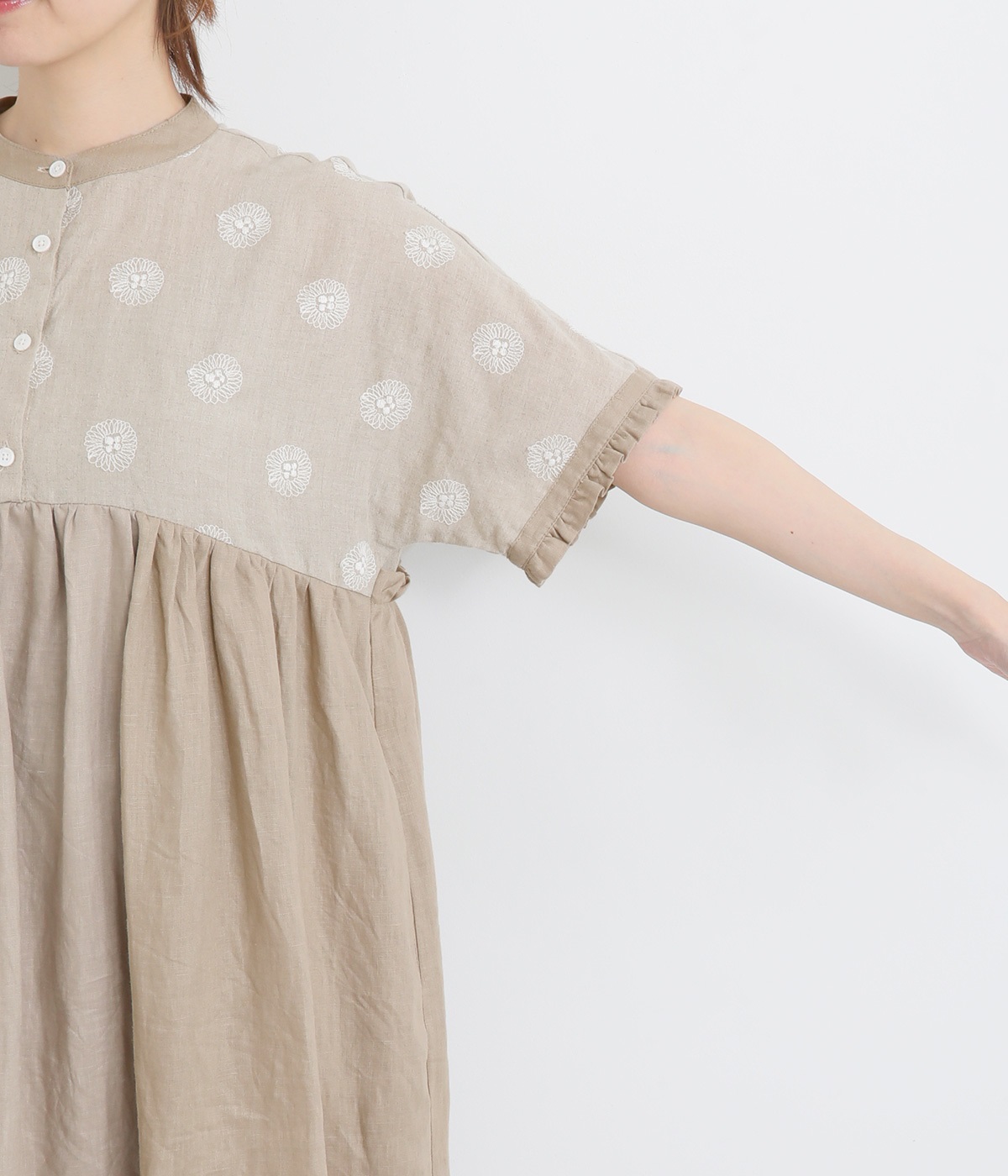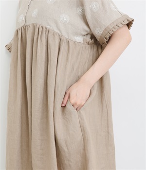リネンガーベラ刺繍バンドカラーウエストギャザーかぶり袖フリル半袖ワンピース
