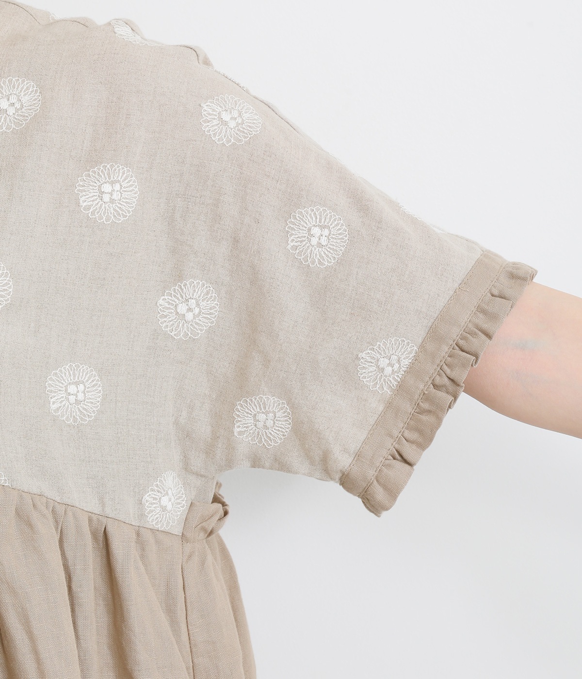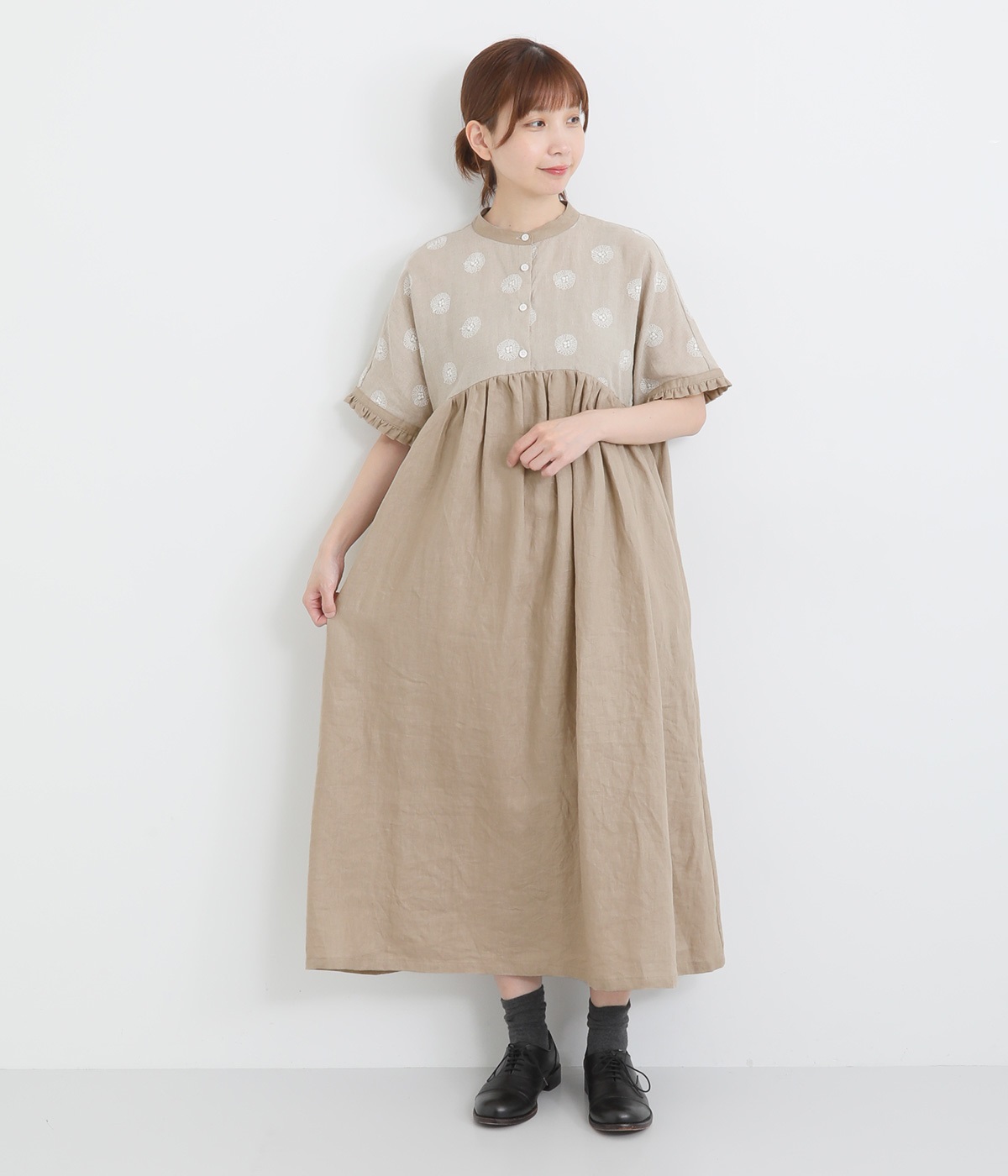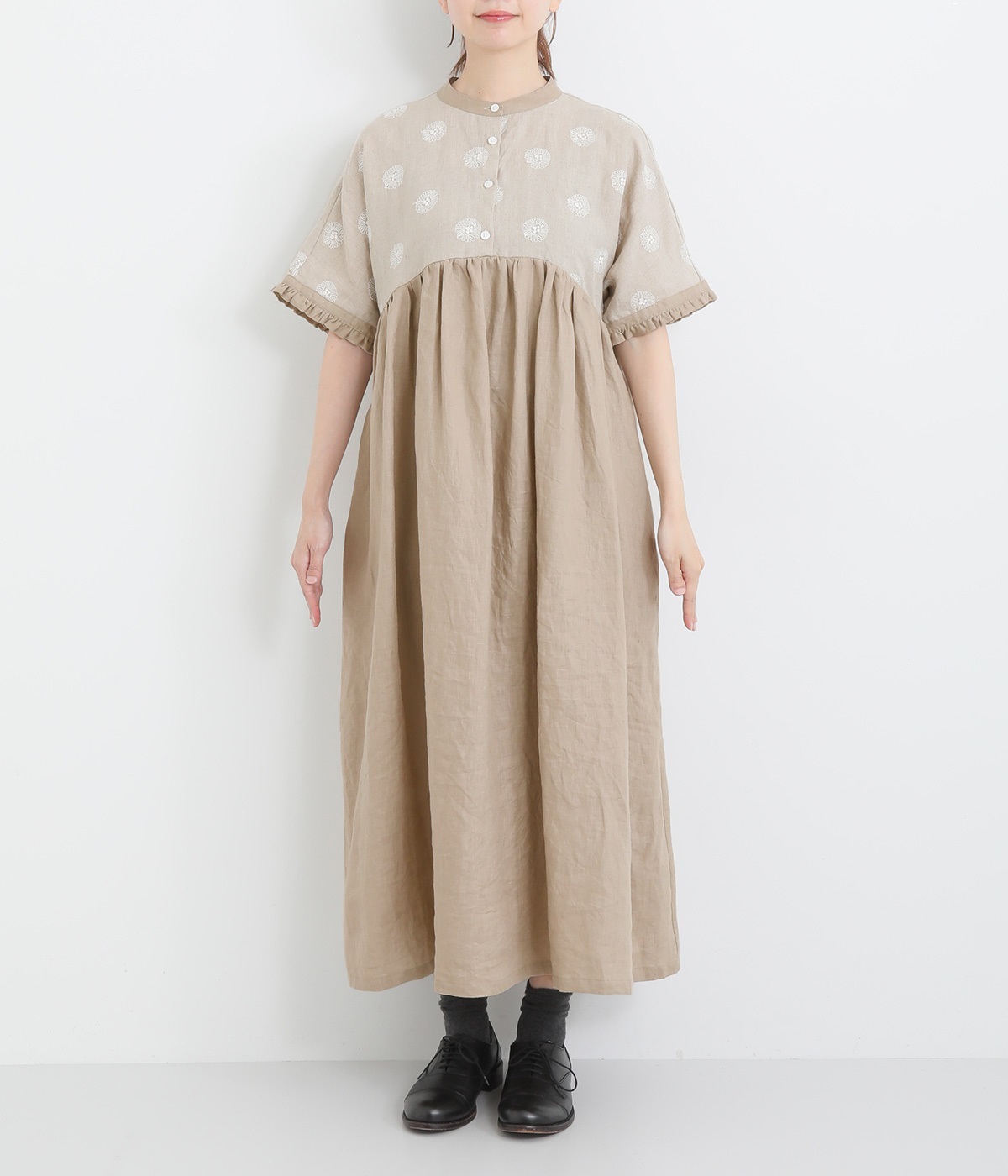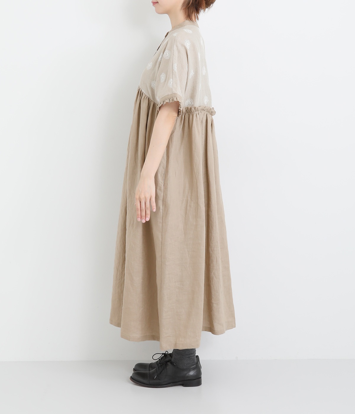 リネンガーベラ刺繍バンドカラーウエストギャザーかぶり袖フリル半袖ワンピース