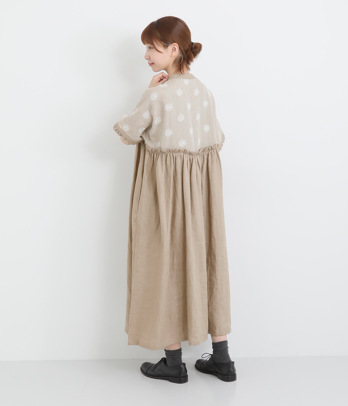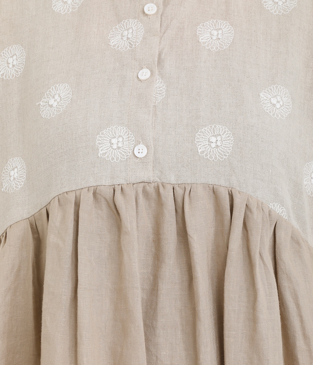リネンガーベラ刺繍バンドカラーウエストギャザーかぶり袖フリル半袖ワンピース(ナチュラル-ONESIZE)