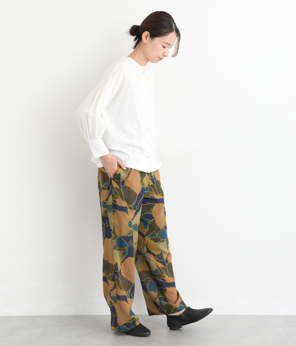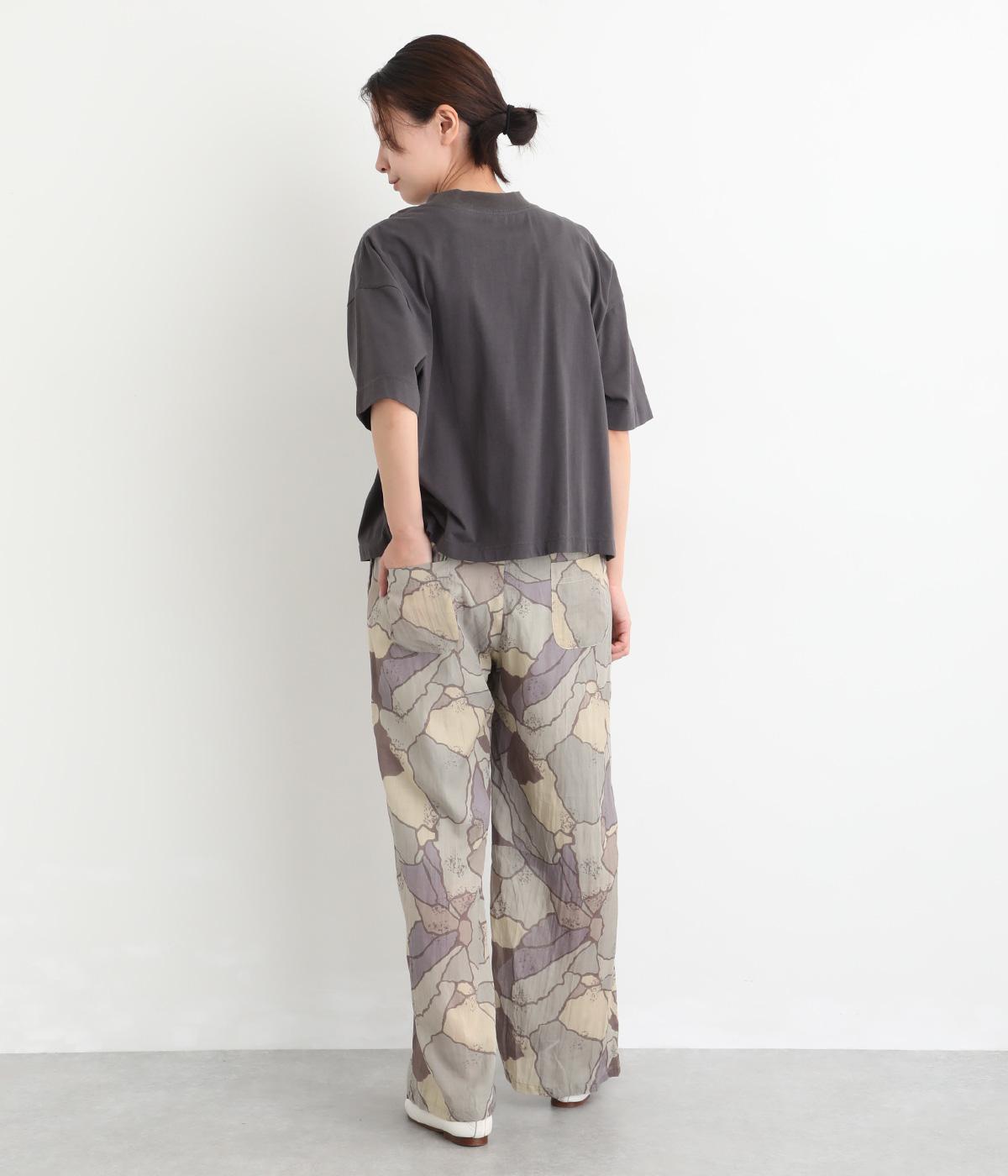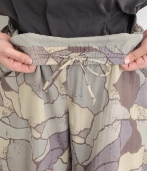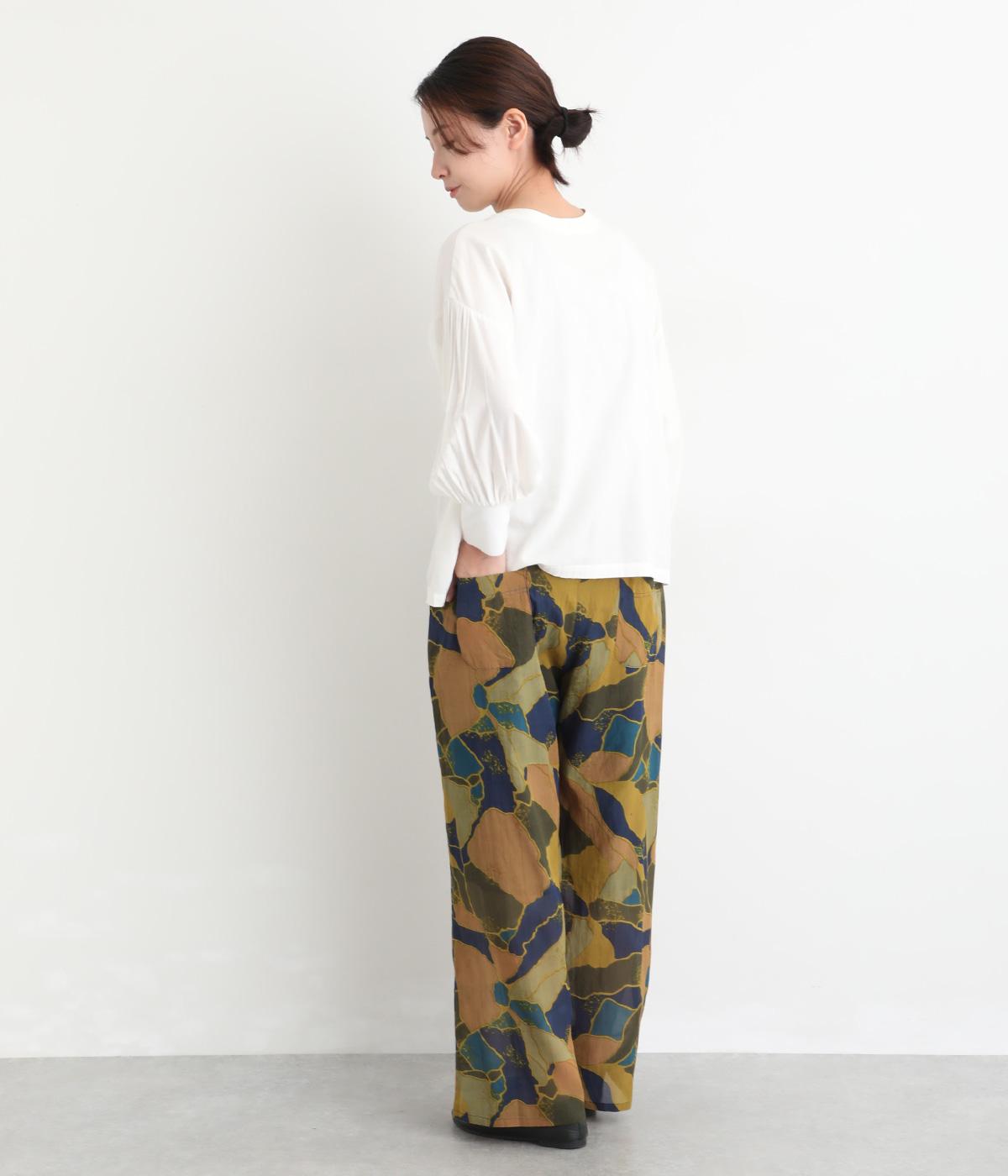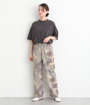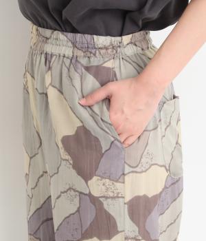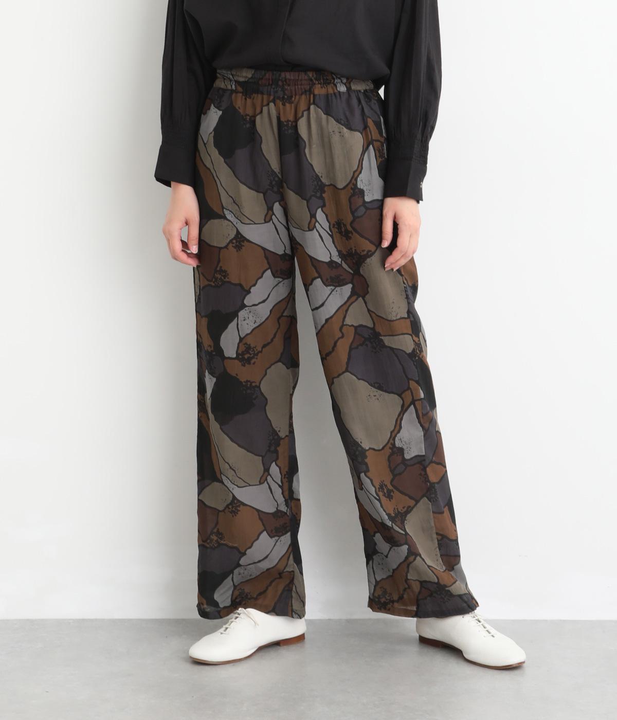 やわらかな色の重なりが印象的な抽象柄のパンツ。アート感のある佇まいで、シンプルなトップスと合わせるだけで洒落感のあるスタイリングに。内紐を配した総ゴム仕様のウエストと裏地付きで、安心感のある穿き心地に仕上げました。