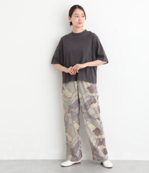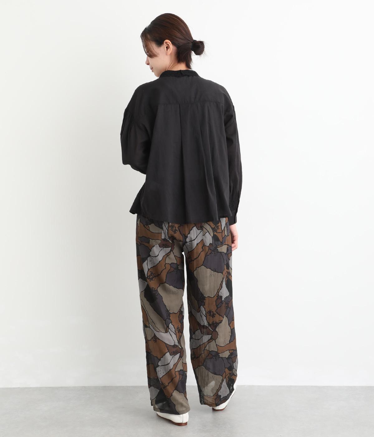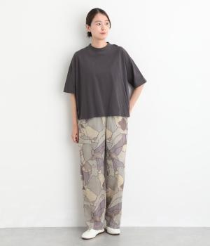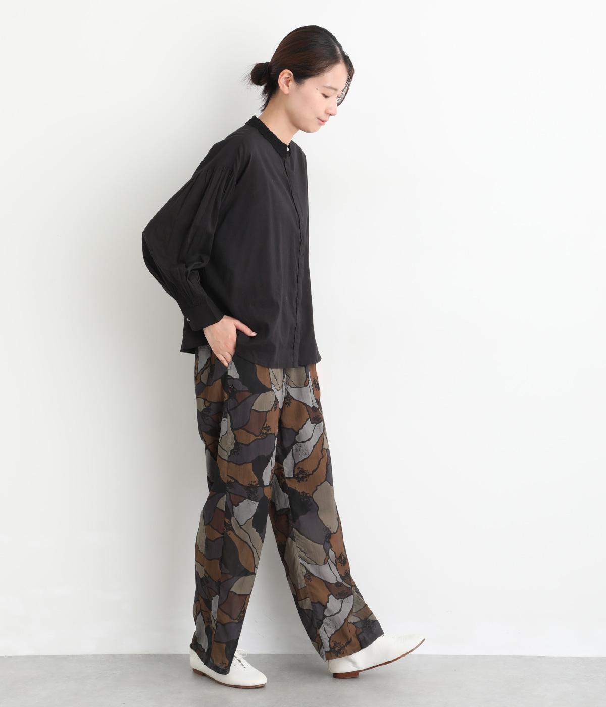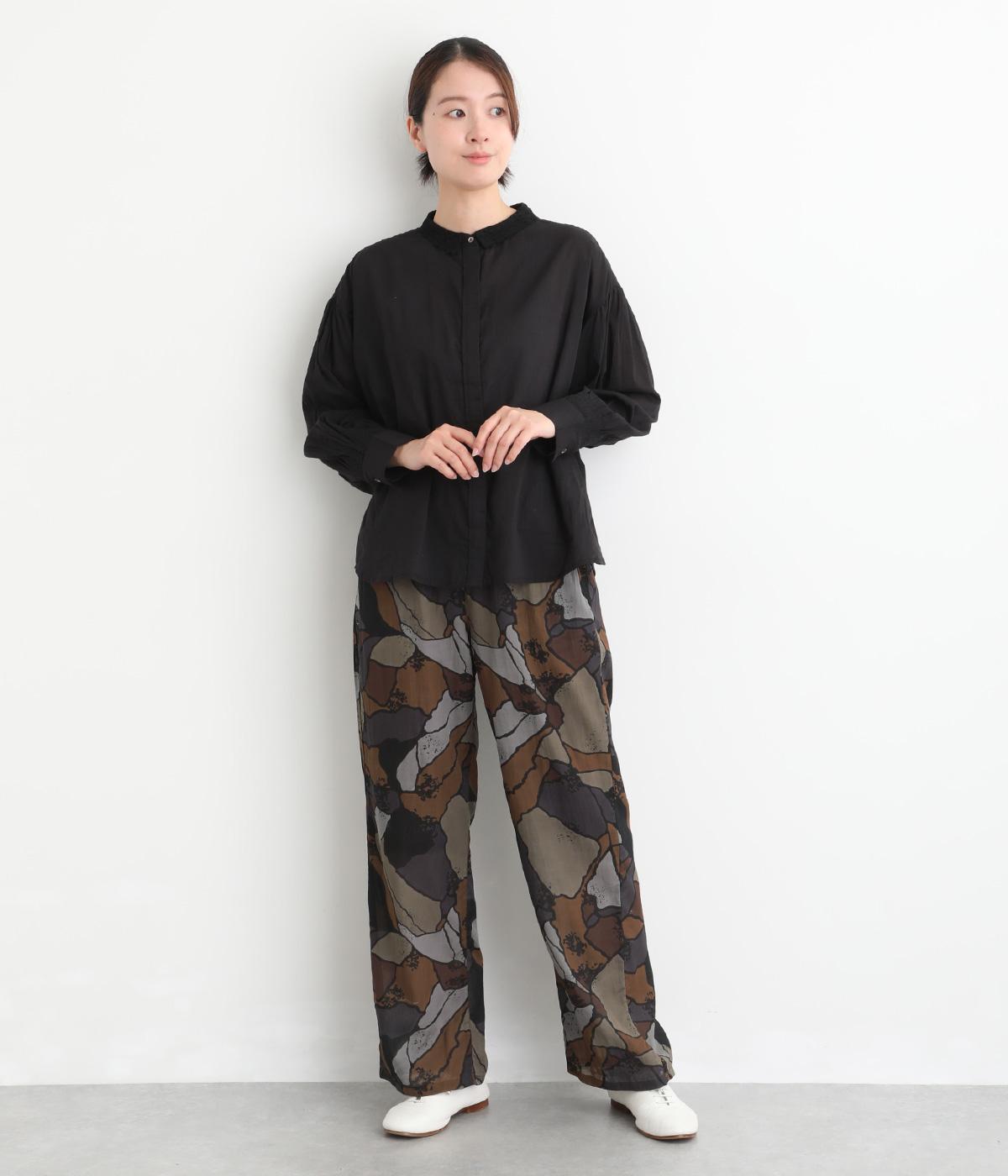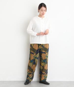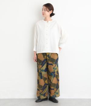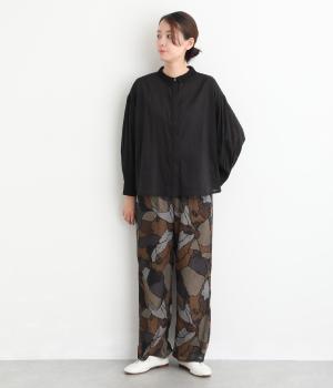 レーヨンとコットンをミックスした、薄手で軽やかな生地です。自然なシワ感のある表情で、しっとりと肌になじみます。しなやかで軽やかな素材感です。