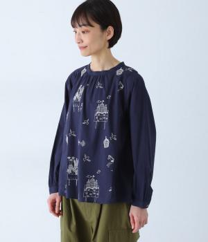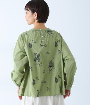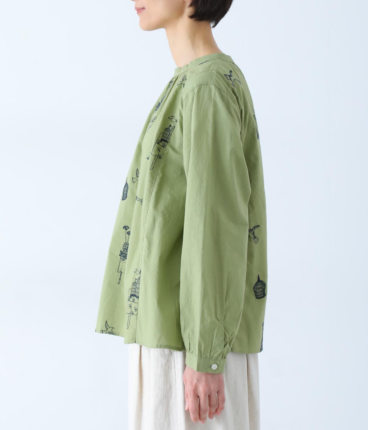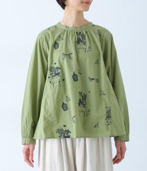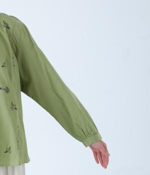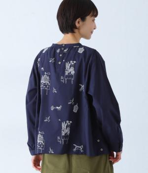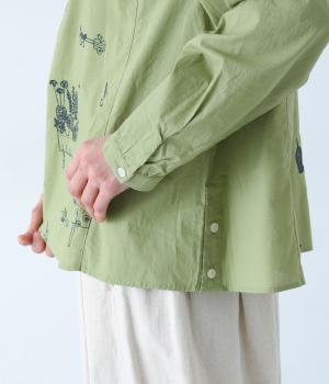 画家・イラストレーター マツモトヨーコさんとのコラボシリーズです。前後の身頃に刺しゅう生地を使用し、縦のラインを強調したすっきり見えするデザインです。スタンドカラーや細めのカフスがキレイめ見えするポイントです。