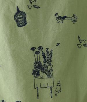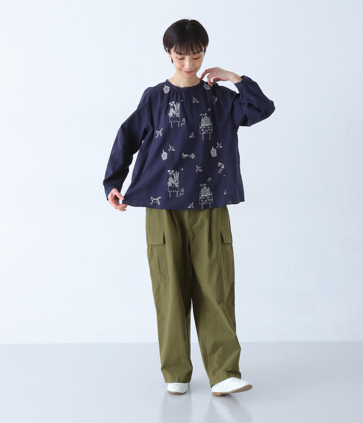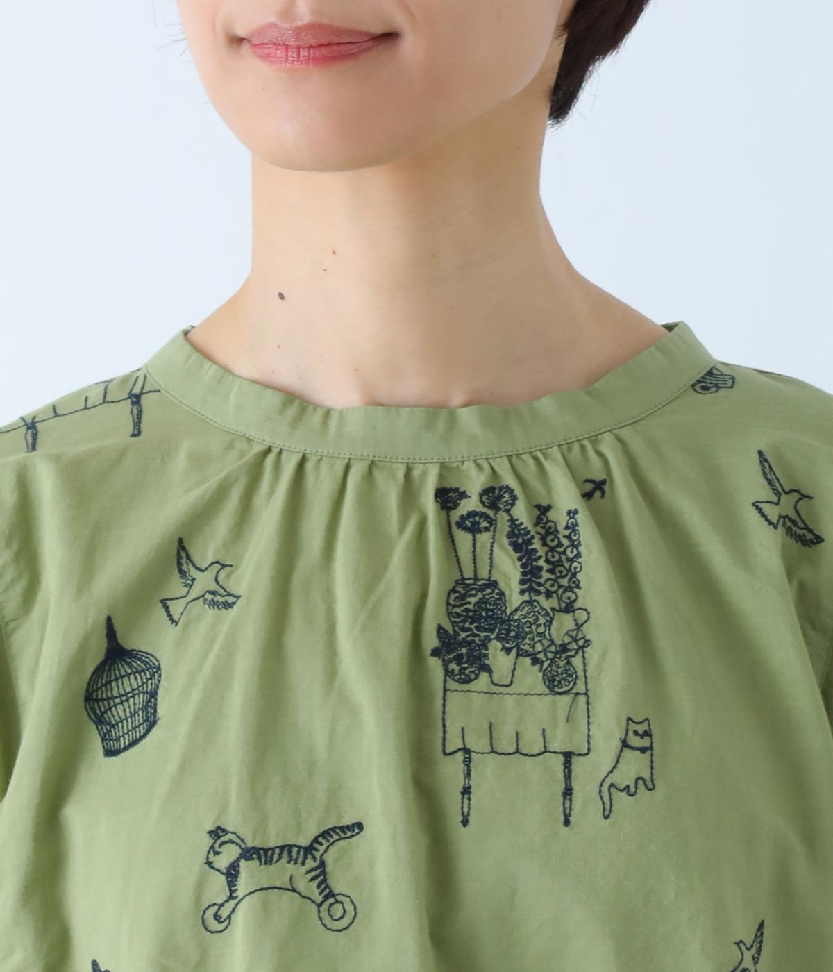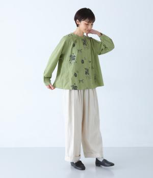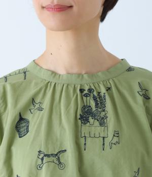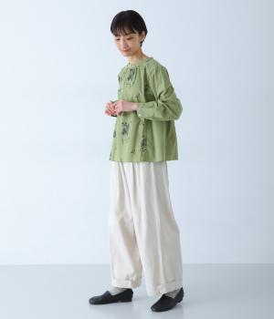 しなやかな手ざわりのコットン生地を使用しています。やさしい肌なじみで軽やかに着ていただけます。単色でステッチのような振り方の総柄刺しゅうを施しました。