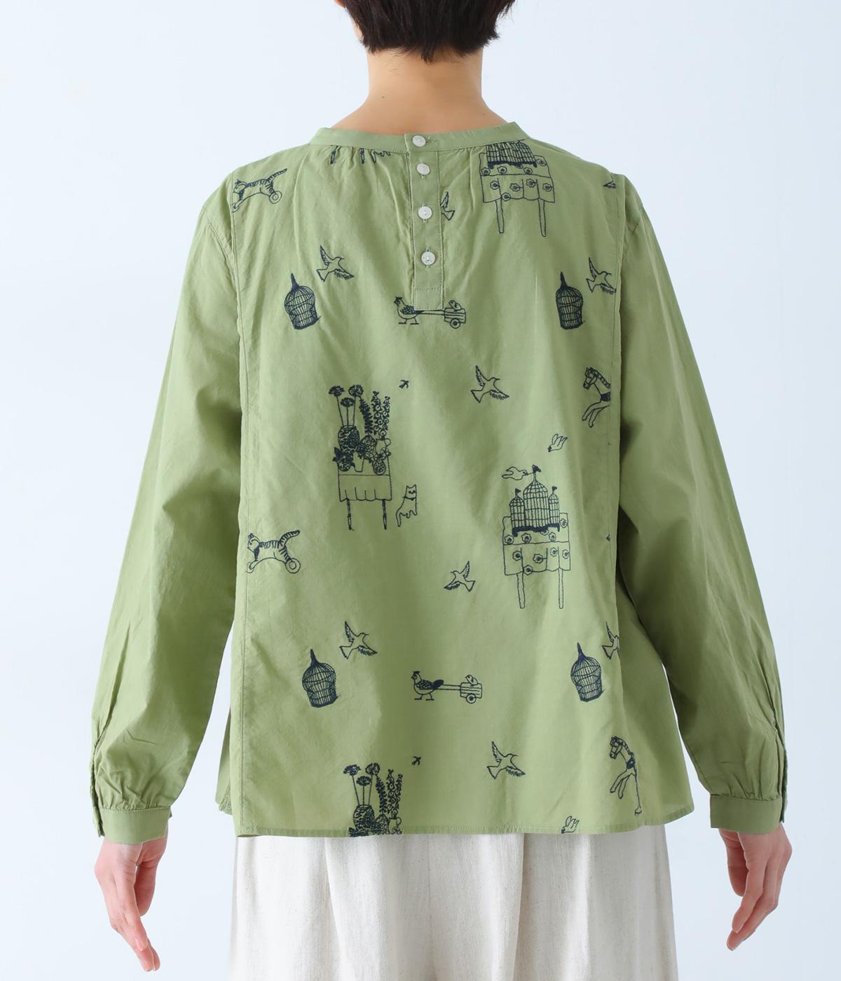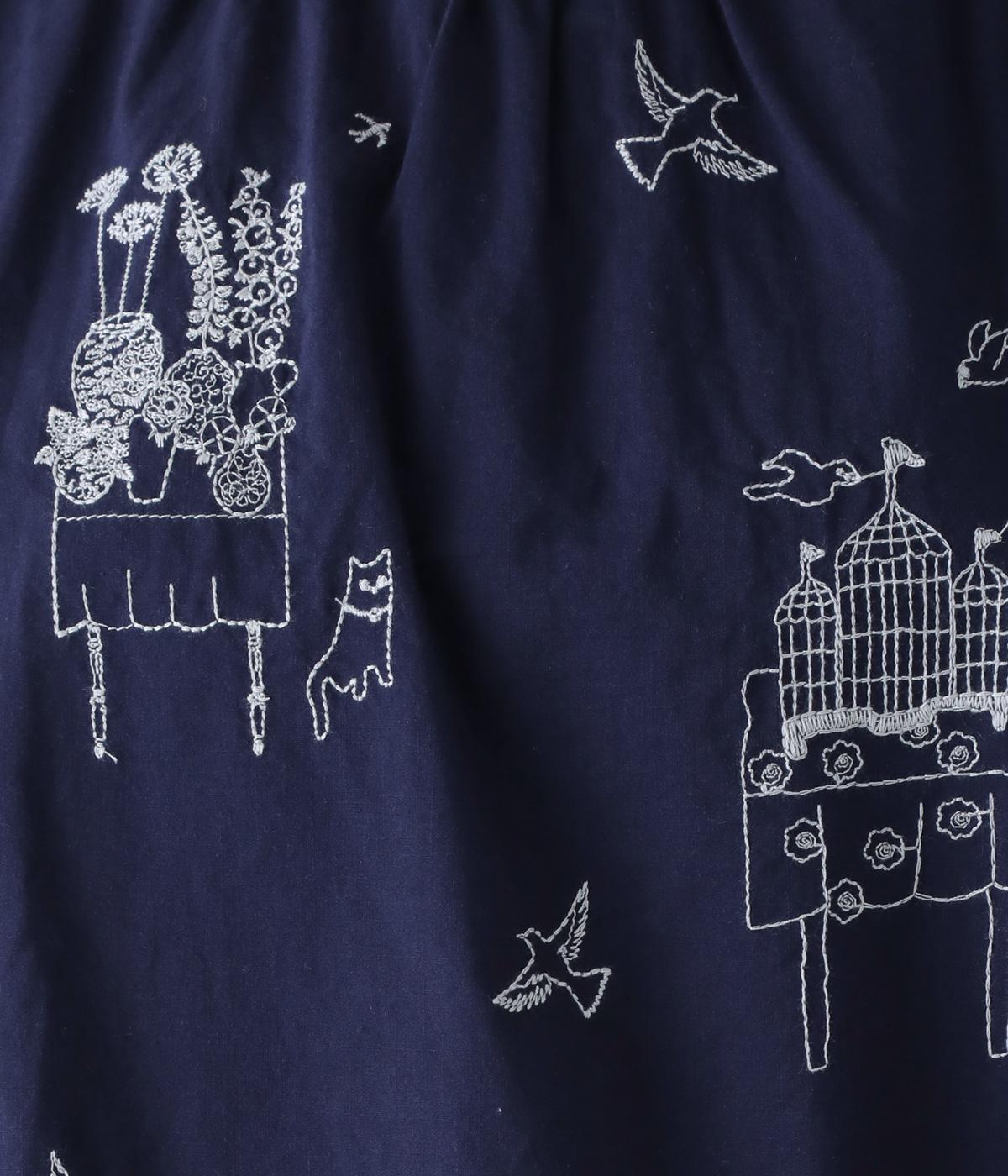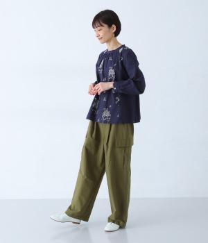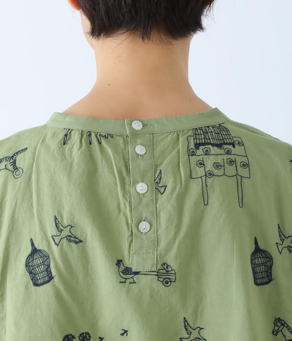 しなやかな手ざわりのコットン生地を使用しています。やさしい肌なじみで軽やかに着ていただけます。単色でステッチのような振り方の総柄刺しゅうを施しました。
