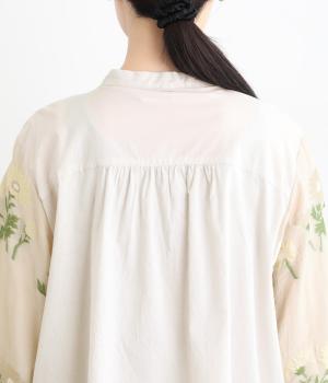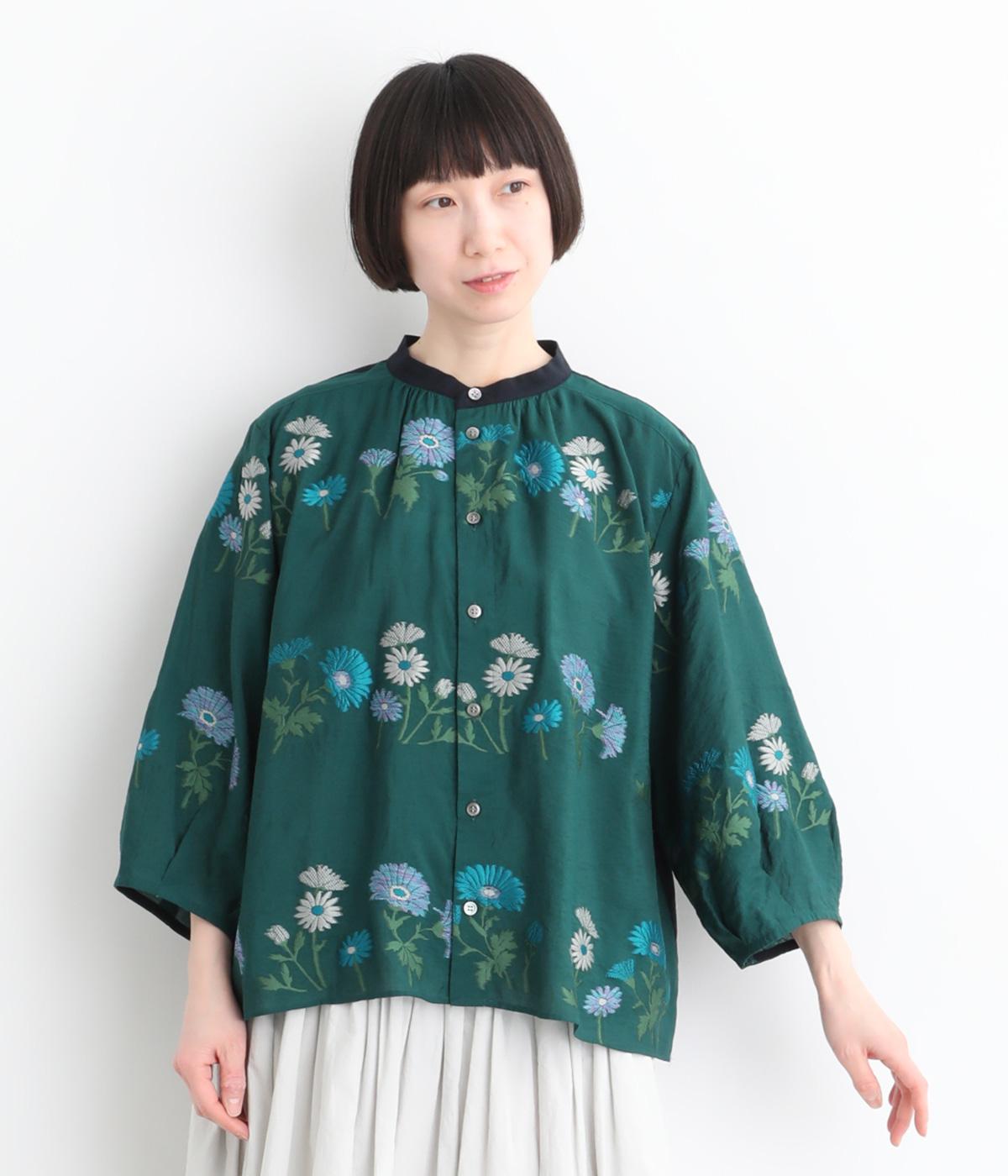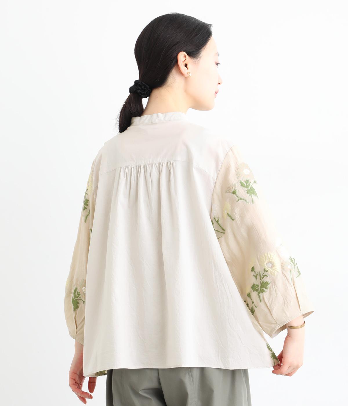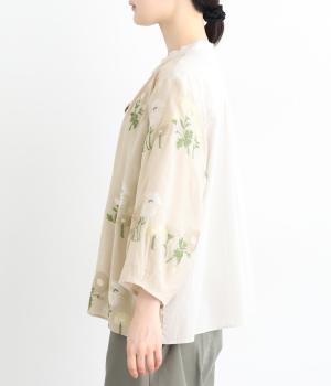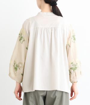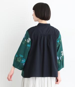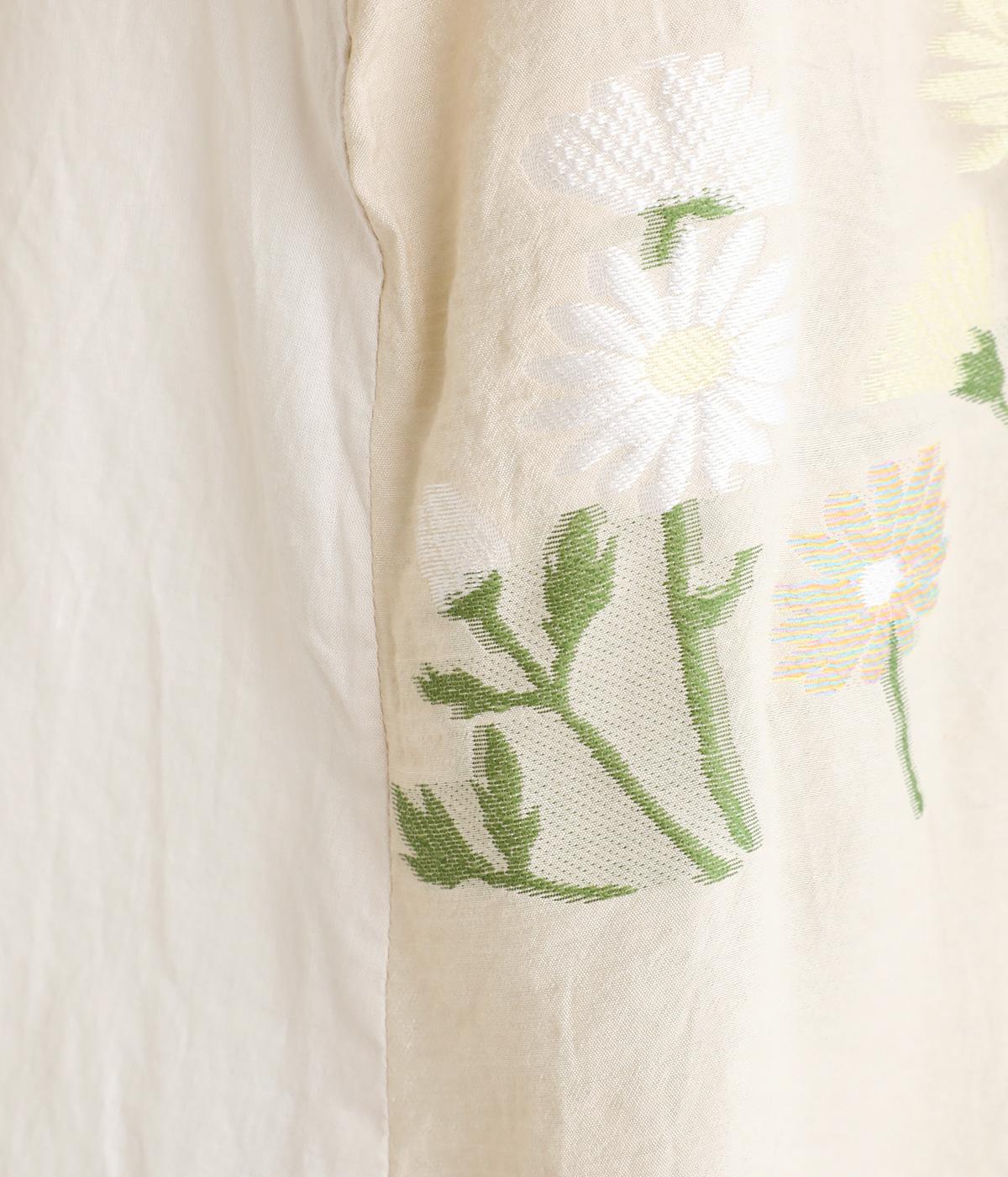 丸みのあるコクーンスリーブのブラウスです。フロントと袖には立体感のあるジャカード素材を使用し、マーガレットのモチーフを繊細に表現しました。6色の糸が重なり合い、レインボーのような奥行きを生み出しています。襟とうしろ身頃を無地で大胆に切り替え、着心地とデザイン性を両立した一枚です。