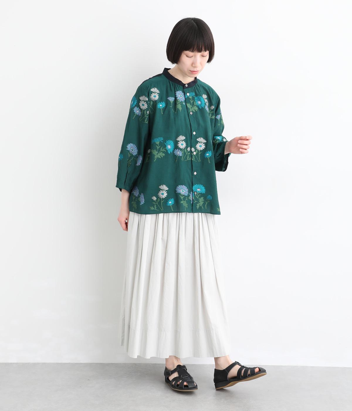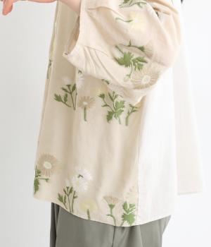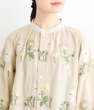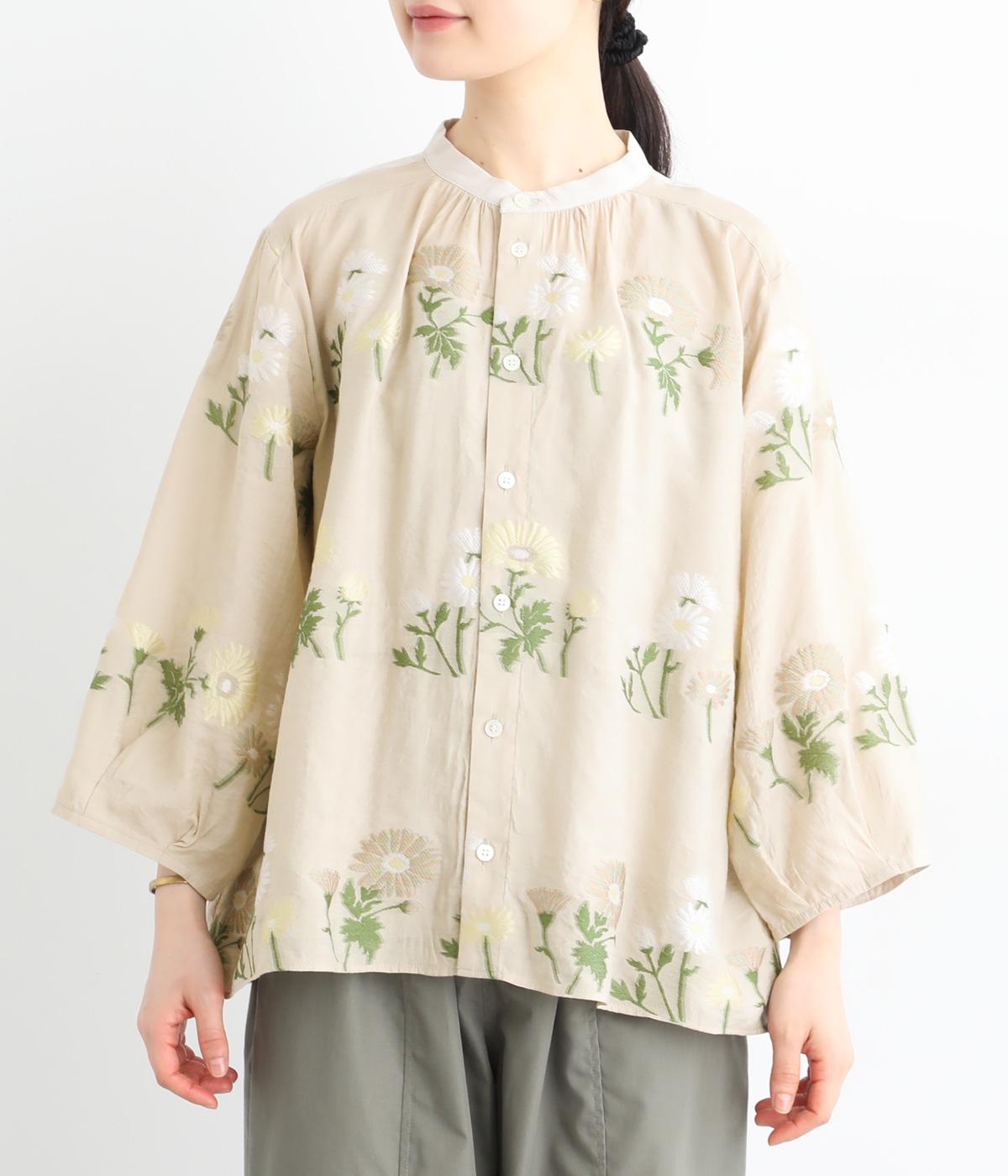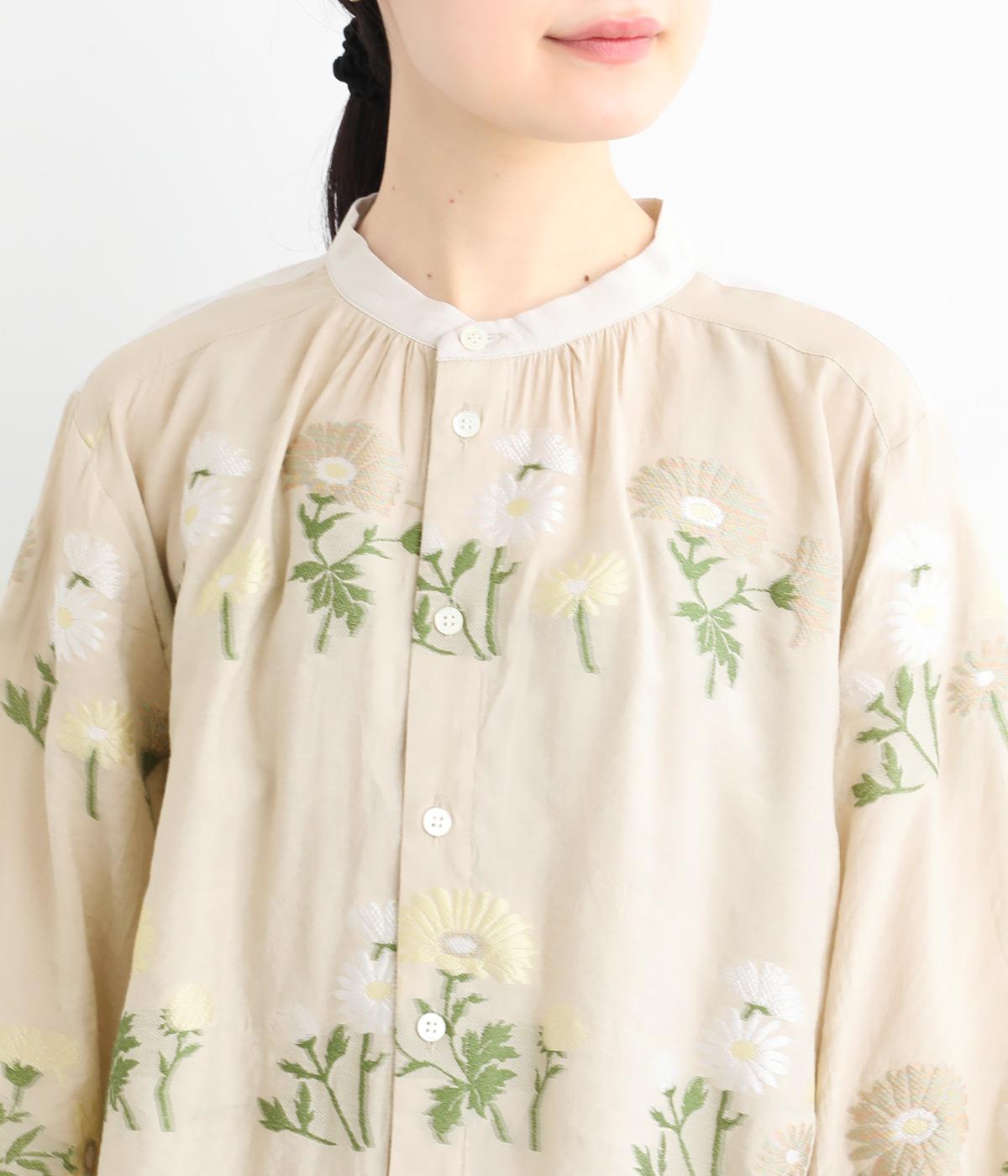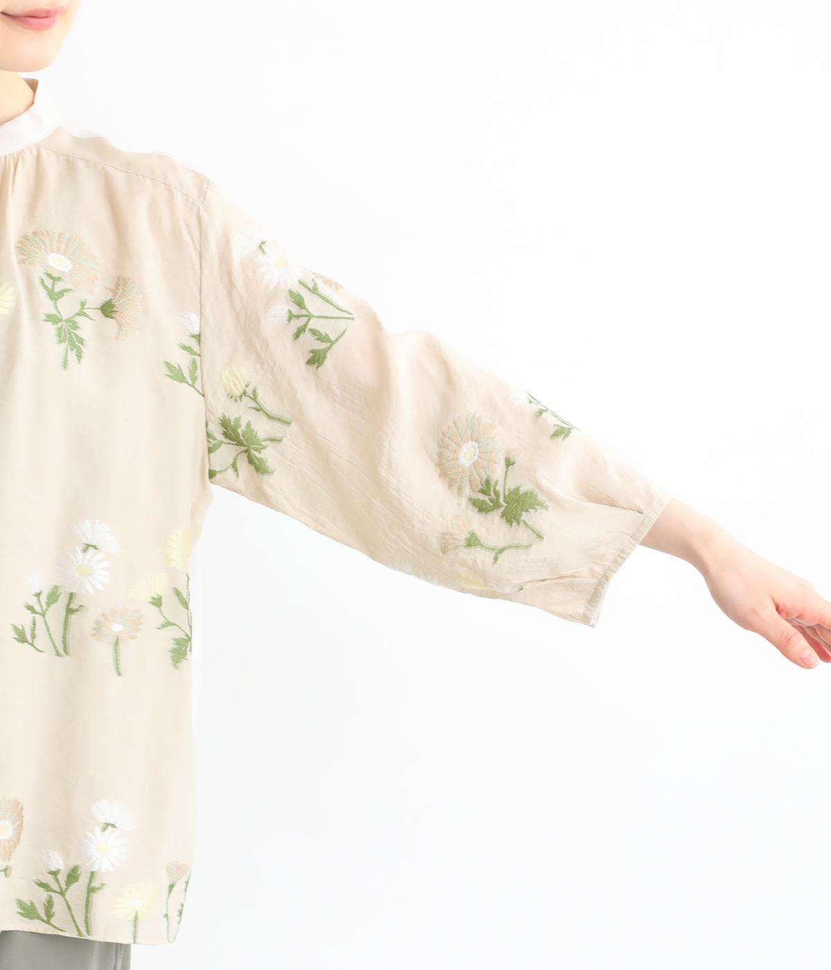 丸みのあるコクーンスリーブのブラウスです。フロントと袖には立体感のあるジャカード素材を使用し、マーガレットのモチーフを繊細に表現しました。6色の糸が重なり合い、レインボーのような奥行きを生み出しています。襟とうしろ身頃を無地で大胆に切り替え、着心地とデザイン性を両立した一枚です。