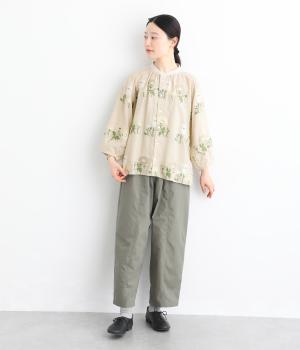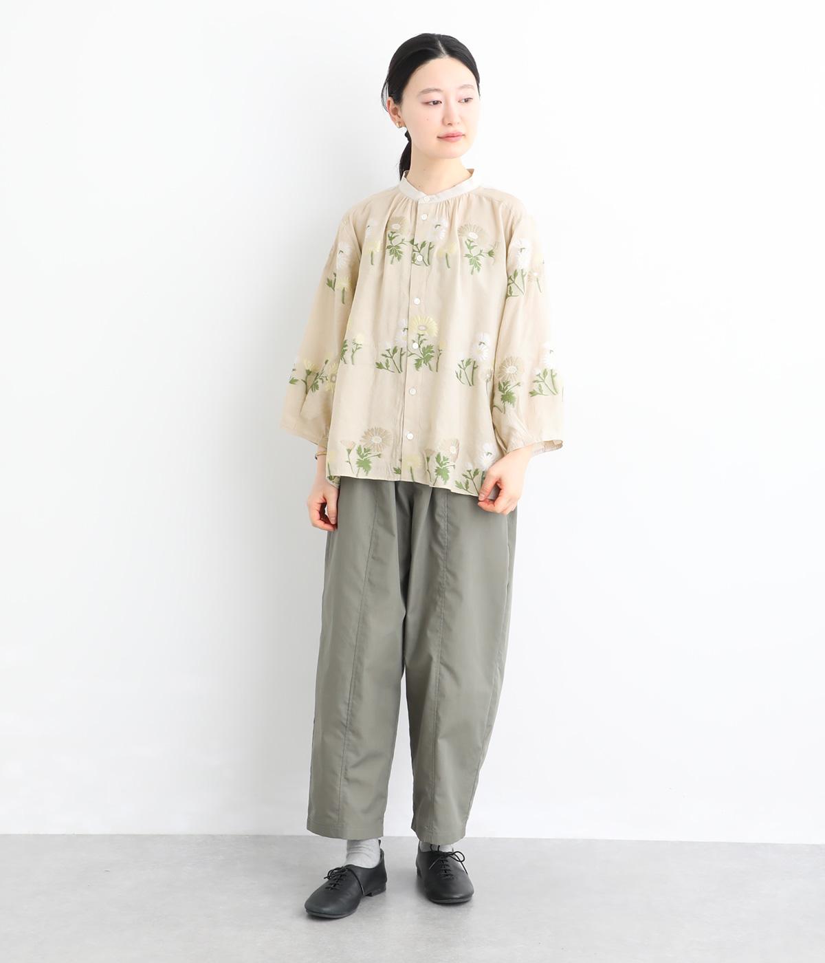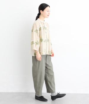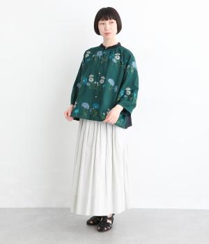 国内でつくられた、ふわりとしたやさしい肌ざわりが魅力の生地です。ほのかなツヤと自然なシワが重なり、奥行きのある表情に。無地の別布には軽やかなコットンローンを使用し、軽やかな着心地に整えました。
