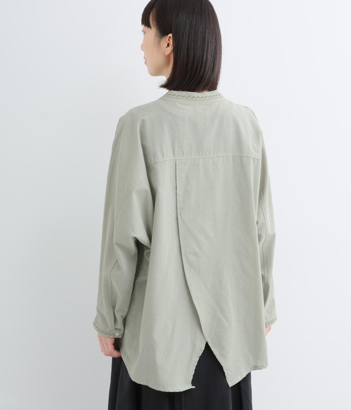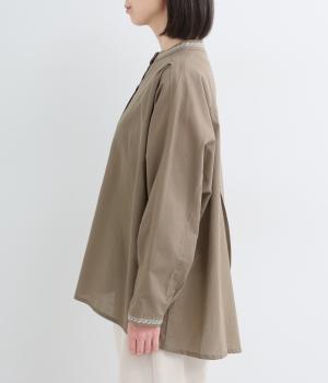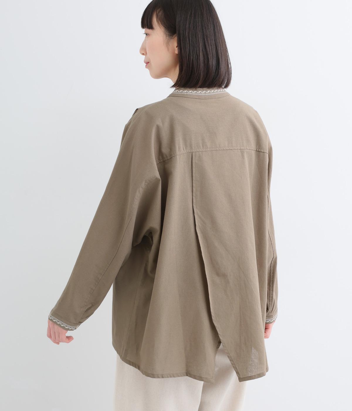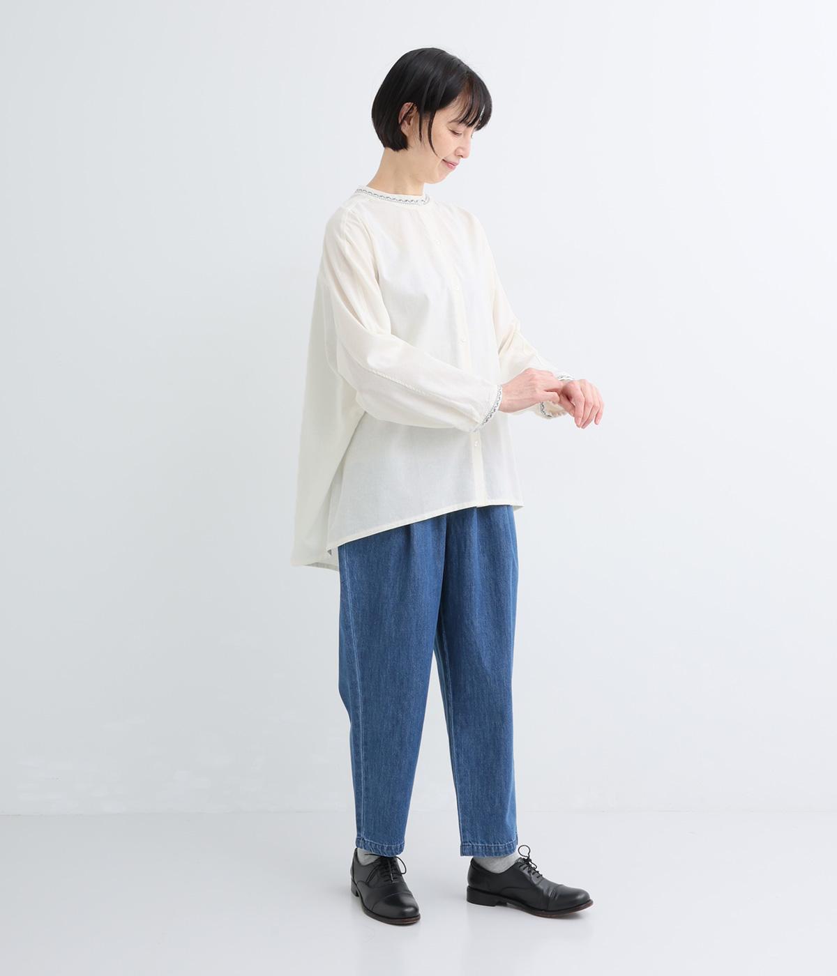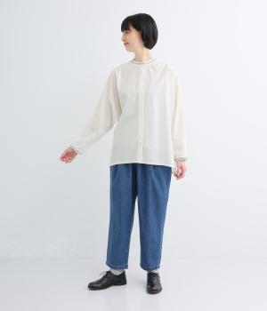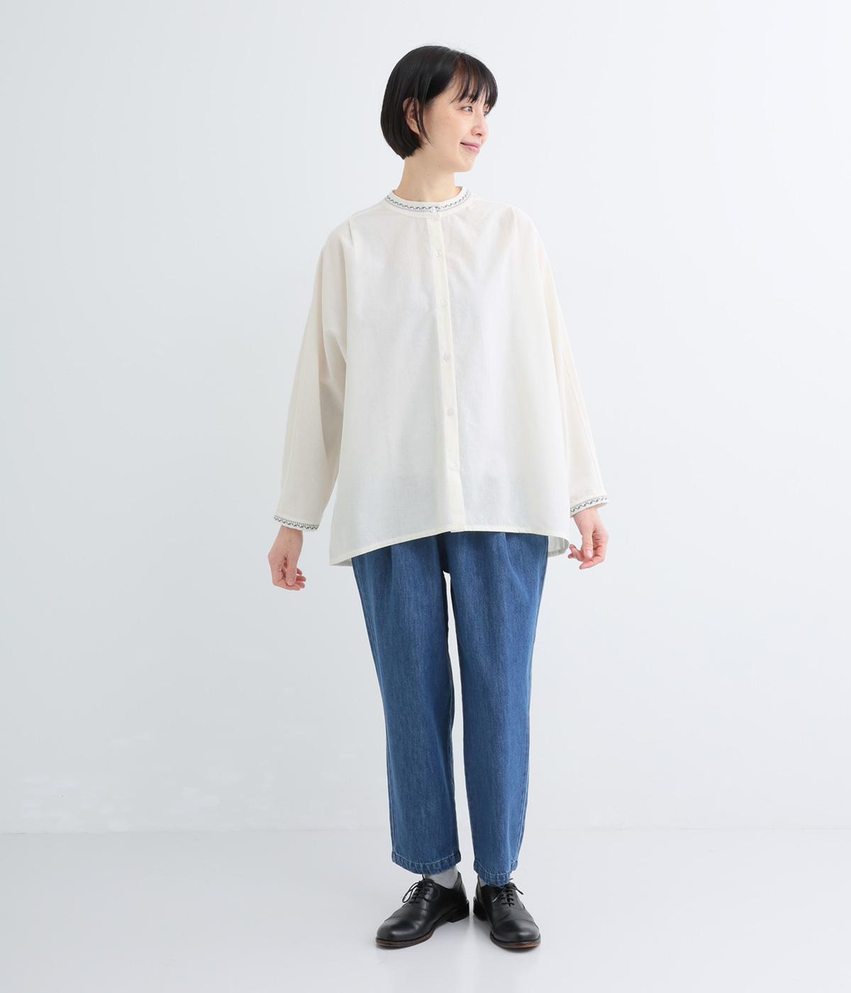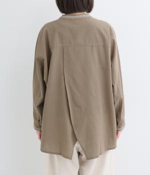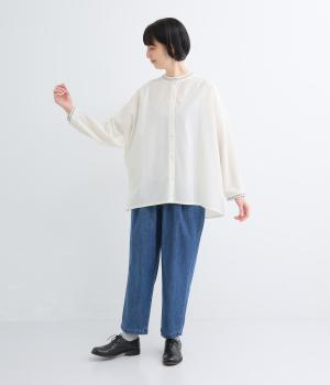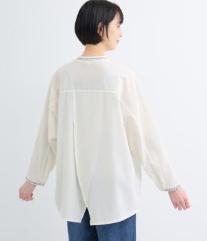 背中に大胆な切り替えをほどこした、デザイン性のあるブラウスです。襟ぐりと袖口にほどこした刺しゅうがさりげなく華やぎを添えます。ゆとりのあるシルエットで腰まわりをカバーし、リラックス感のある着心地です。