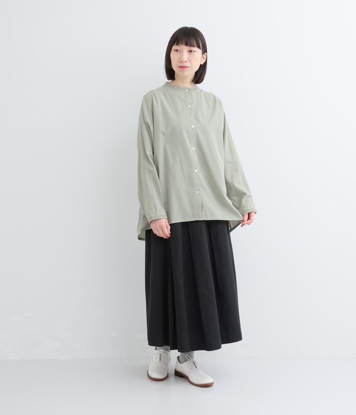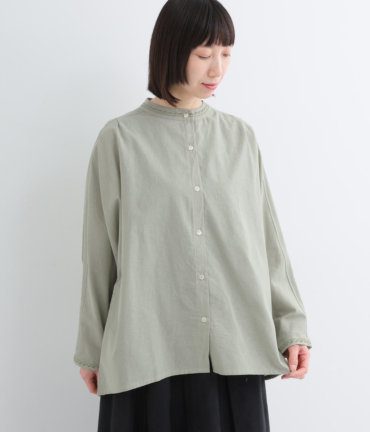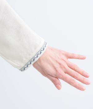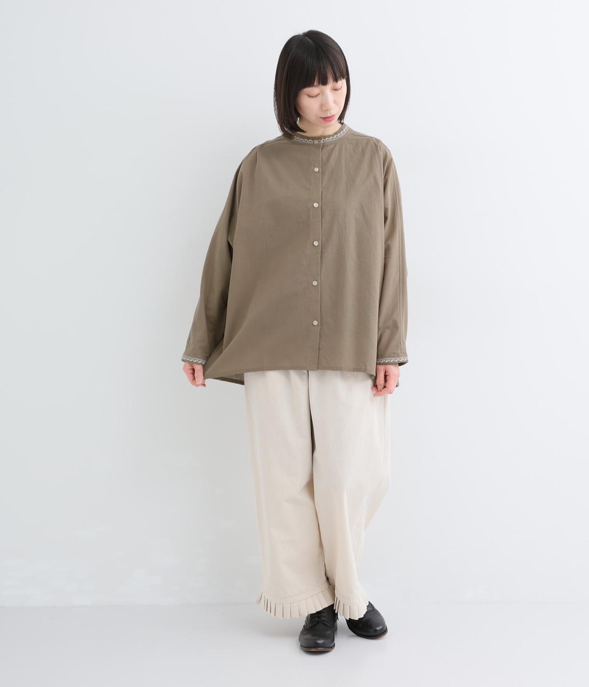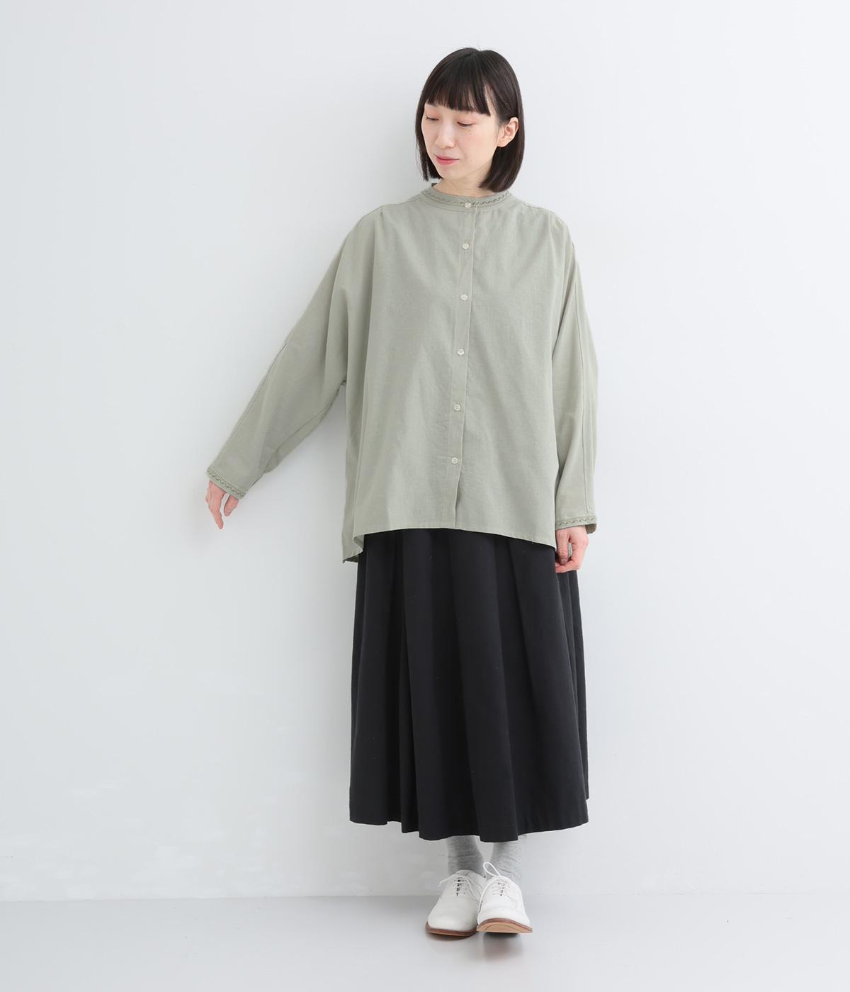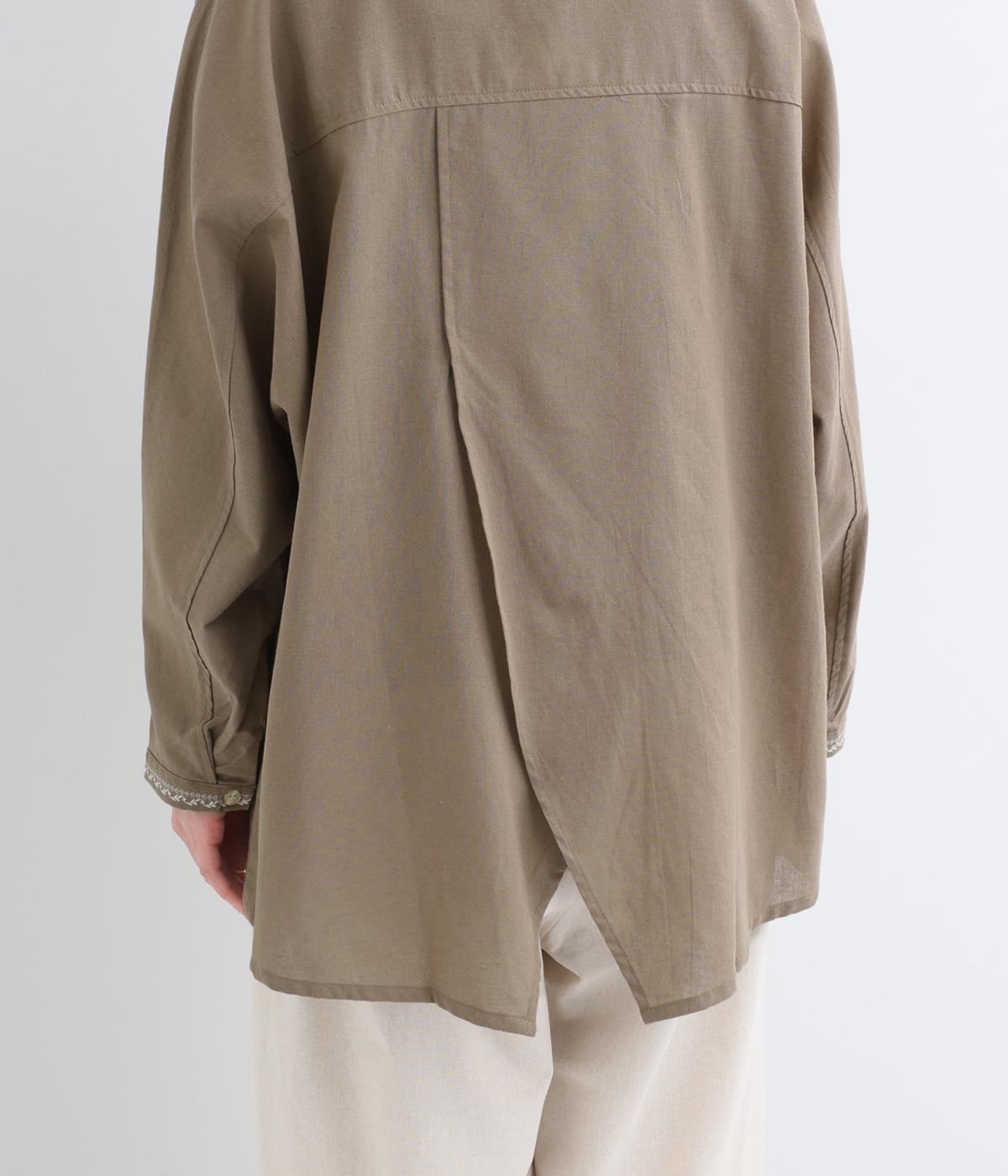 背中に大胆な切り替えをほどこした、デザイン性のあるブラウスです。襟ぐりと袖口にほどこした刺しゅうがさりげなく華やぎを添えます。ゆとりのあるシルエットで腰まわりをカバーし、リラックス感のある着心地です。