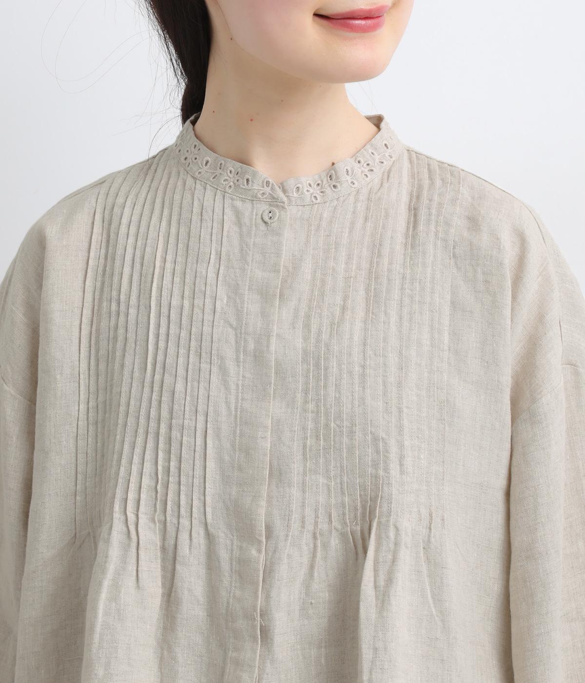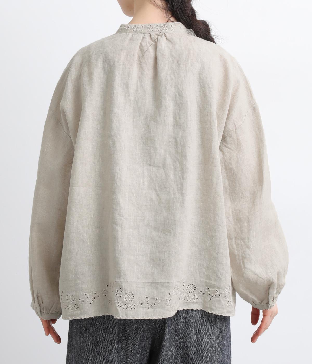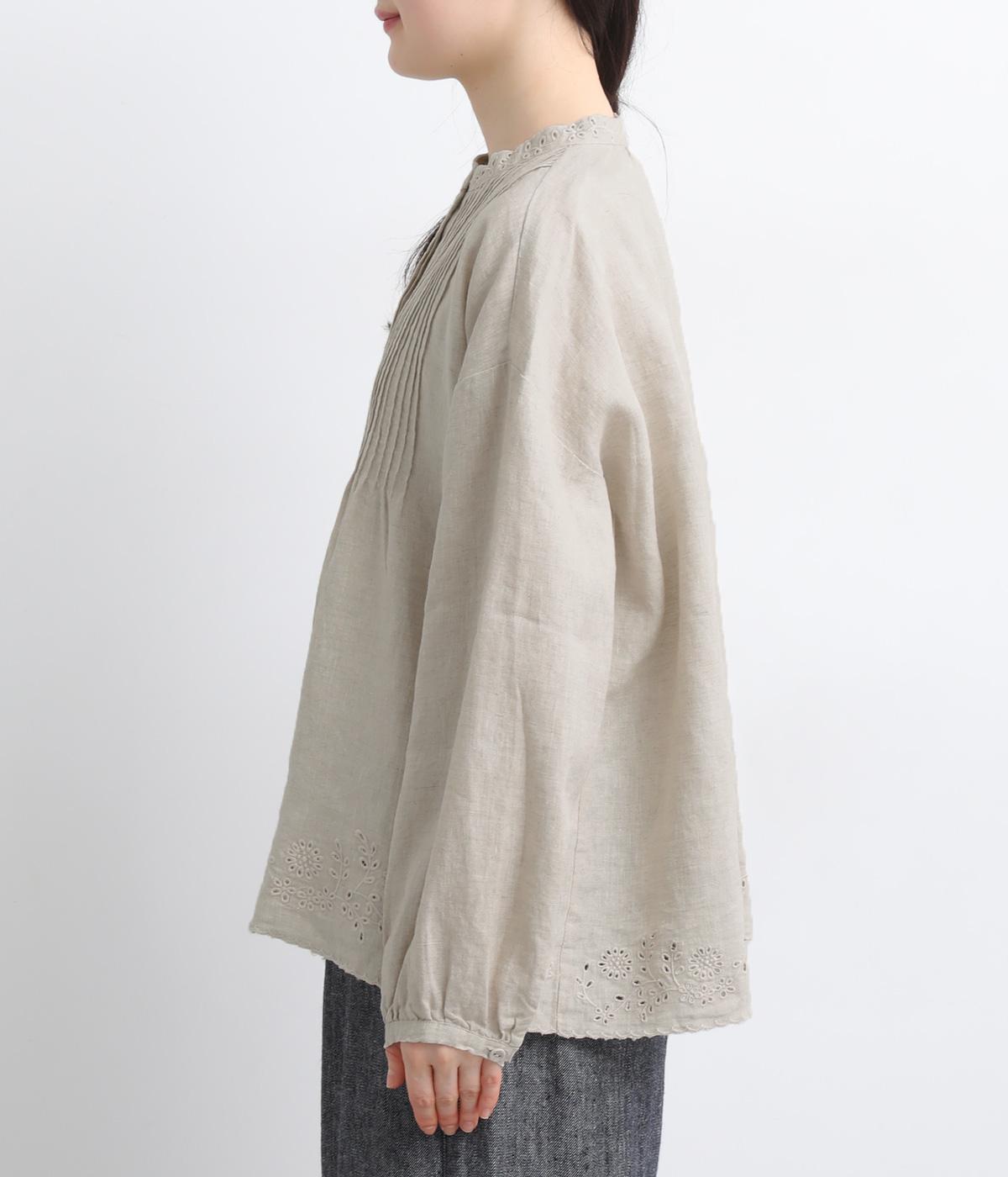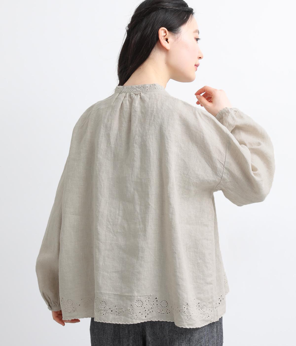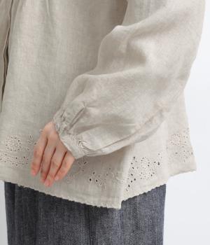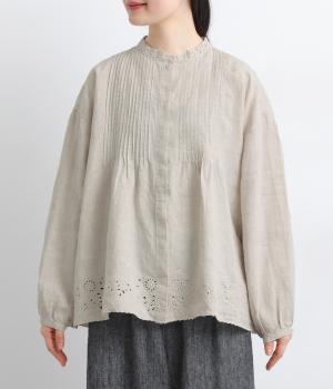 スタンドカラーのすっきりとした表情に、さりげなく施されたカットワーク刺しゅうがやさしい華やぎを添えます。裾まわりにはスカラ刺しゅうをあしらい、軽やかでかわいらしい印象に。身頃にたっぷり入れたピンタックが立体感を生み、可憐で上品な着こなしに仕上がります。