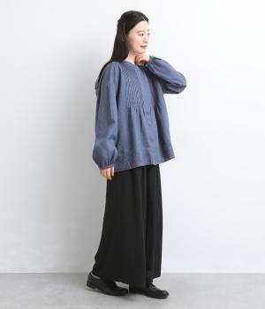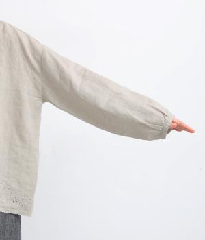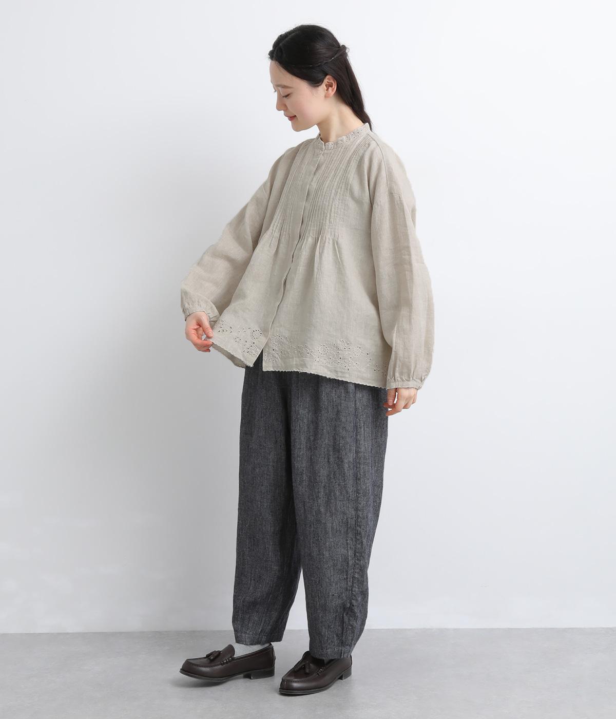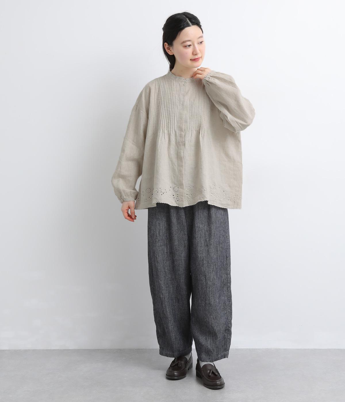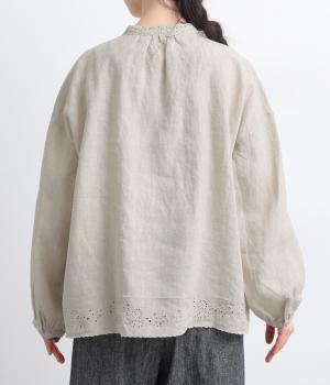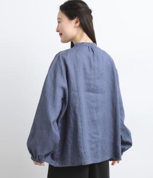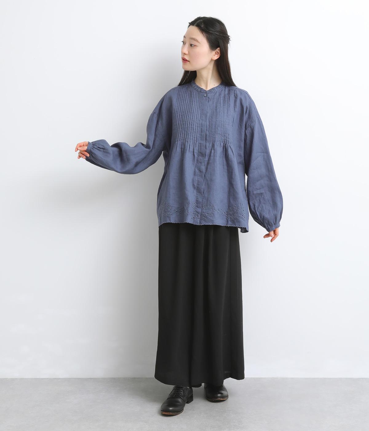 スタンドカラーのすっきりとした表情に、さりげなく施されたカットワーク刺しゅうがやさしい華やぎを添えます。裾まわりにはスカラ刺しゅうをあしらい、軽やかでかわいらしい印象に。身頃にたっぷり入れたピンタックが立体感を生み、可憐で上品な着こなしに仕上がります。