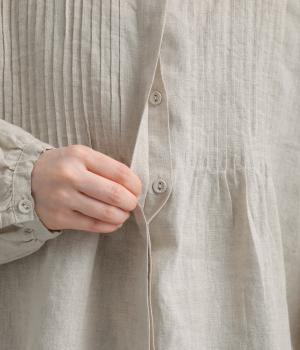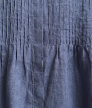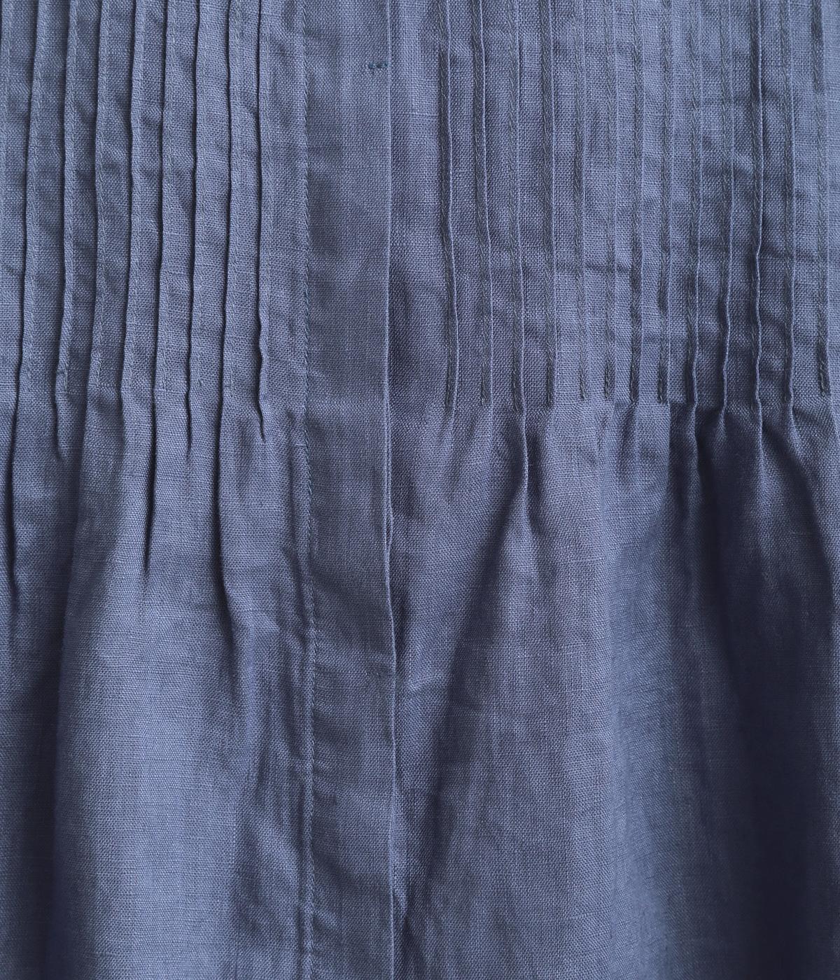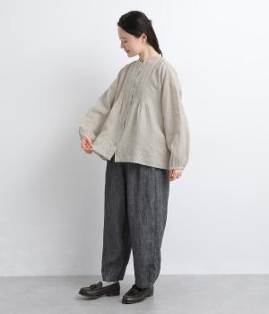 ほどよい厚みとハリのある、リネンの平織り生地を使用しました。さらりとした肌ざわりで通気性がよく、快適な着心地が魅力です。ほんのりとした光沢が上品さを添え、着るほどにやわらかくなじんでいく風合いの変化もたのしめます。