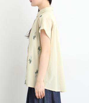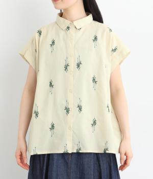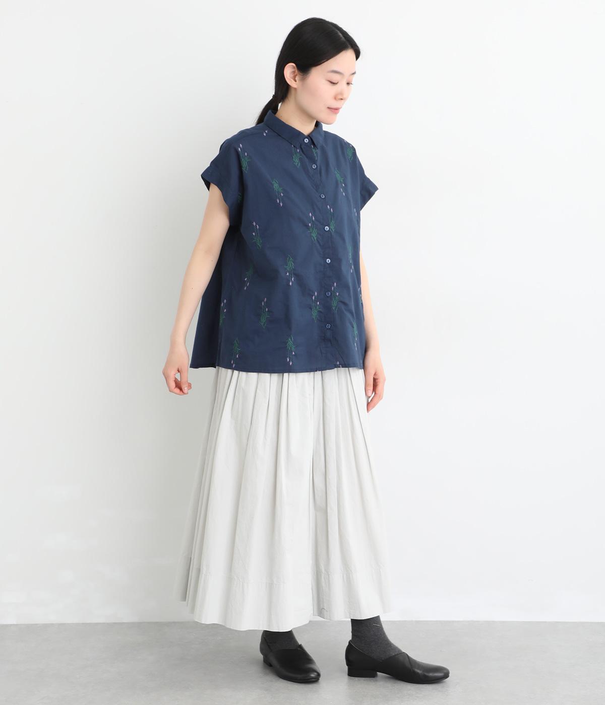 初夏のさわやかさを感じるラベンダー柄の刺しゅうをあしらったブラウス。さりげなく肩先や二の腕をカバーするフレンチスリーブで仕立てました。落ち着きのある華やかさで、日々のコーディネートになじみます。
