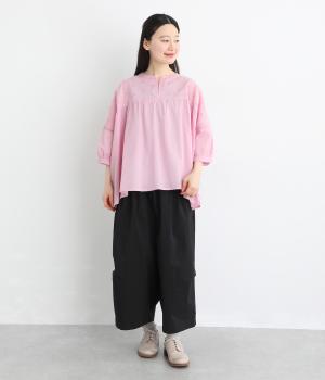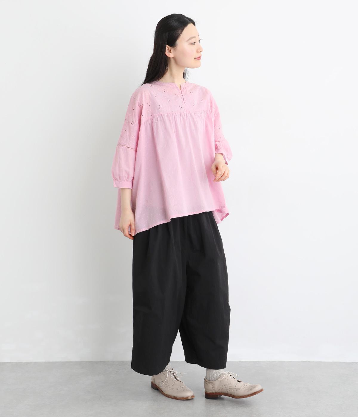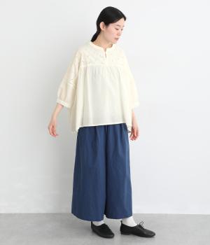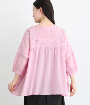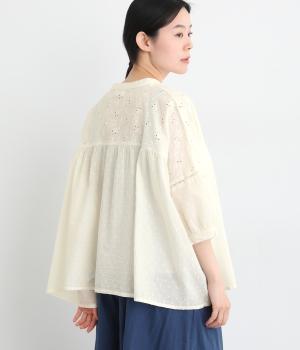 ナチュラルな素材の風合いと軽やかさを生かしたプルオーバー。ドット織りが生地に奥行きをもたらし、透け感のある刺しゅうがさりげなく上品さを添えます。袖付けにははしごレースをあしらって控えめなアクセントに。