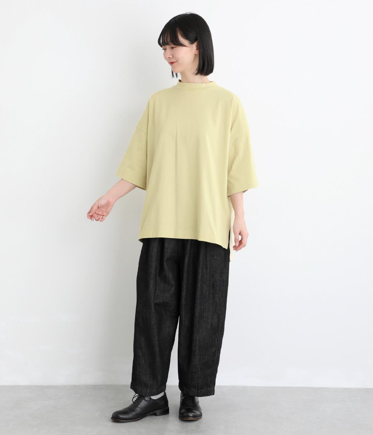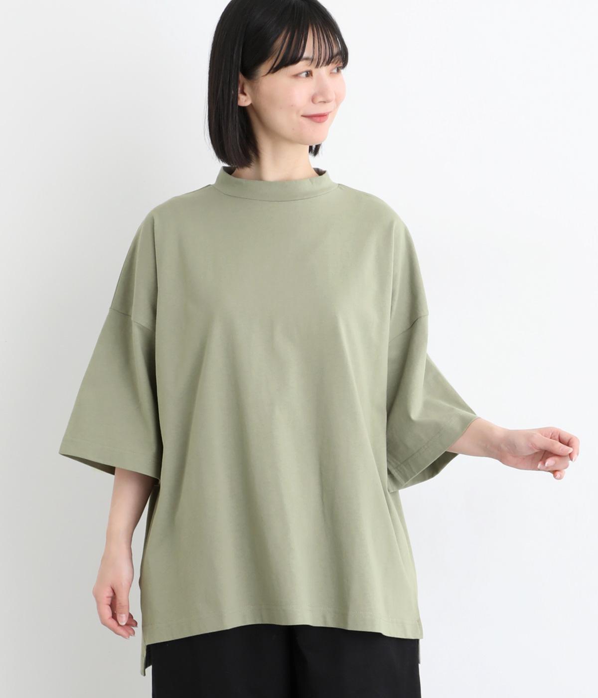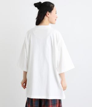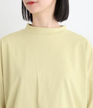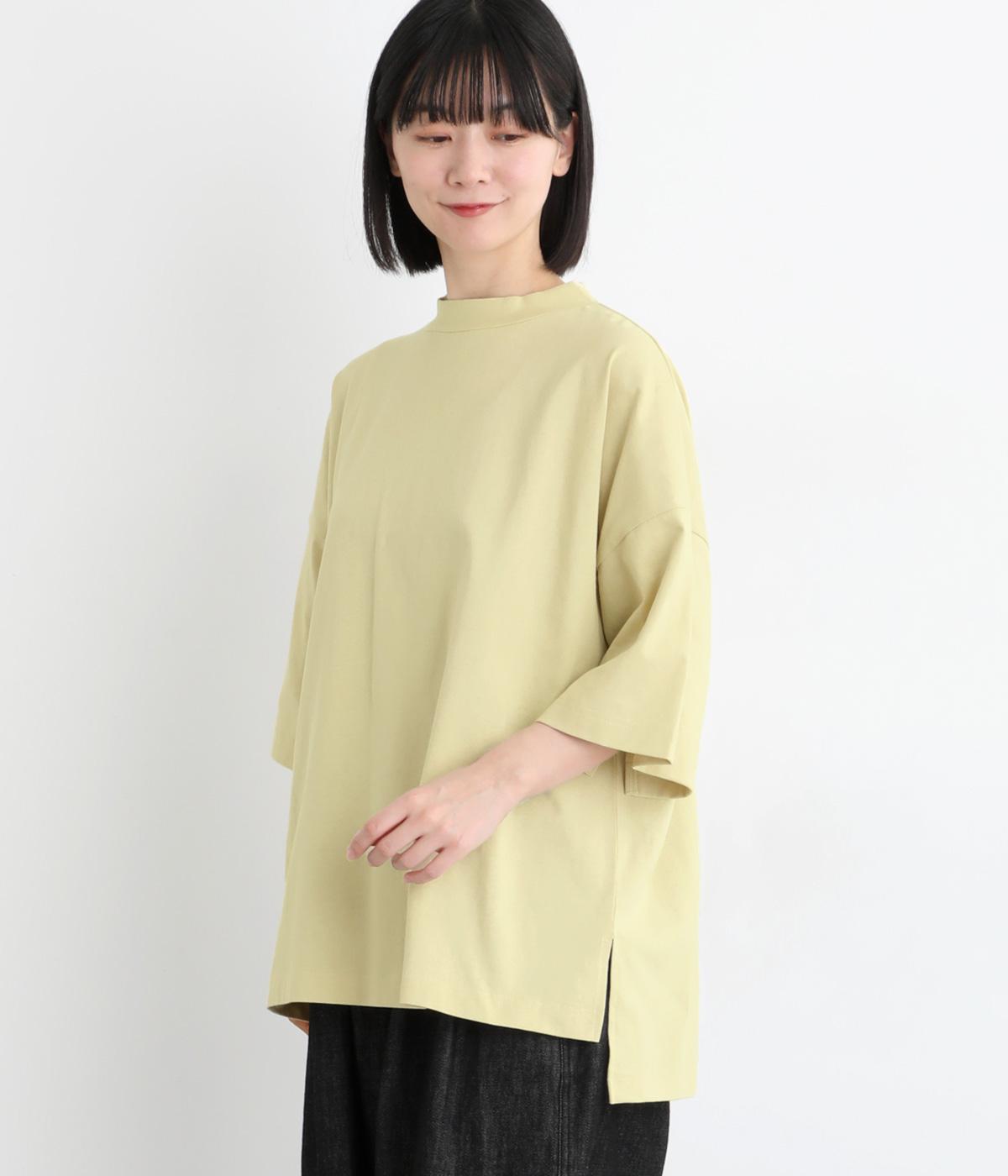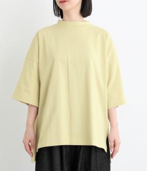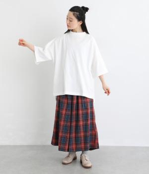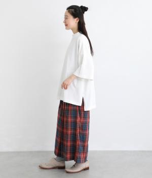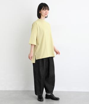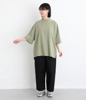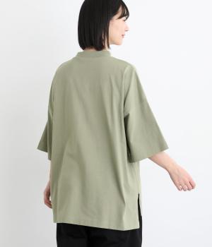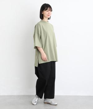 ドロップショルダーと、裾に向かってすとんと落ちるワイドシルエットが魅力です。袖は短すぎない七分袖。大きく前後差をつけた裾にはスリットを入れて、着こなしに抜け感をプラスしました。ヒップが隠れるチュニック丈と、ほんのり立ち上がる首元のモックネックで、カジュアルになりすぎないのも◎