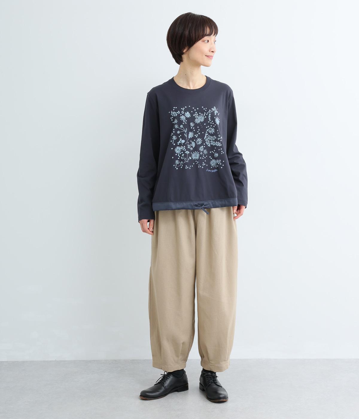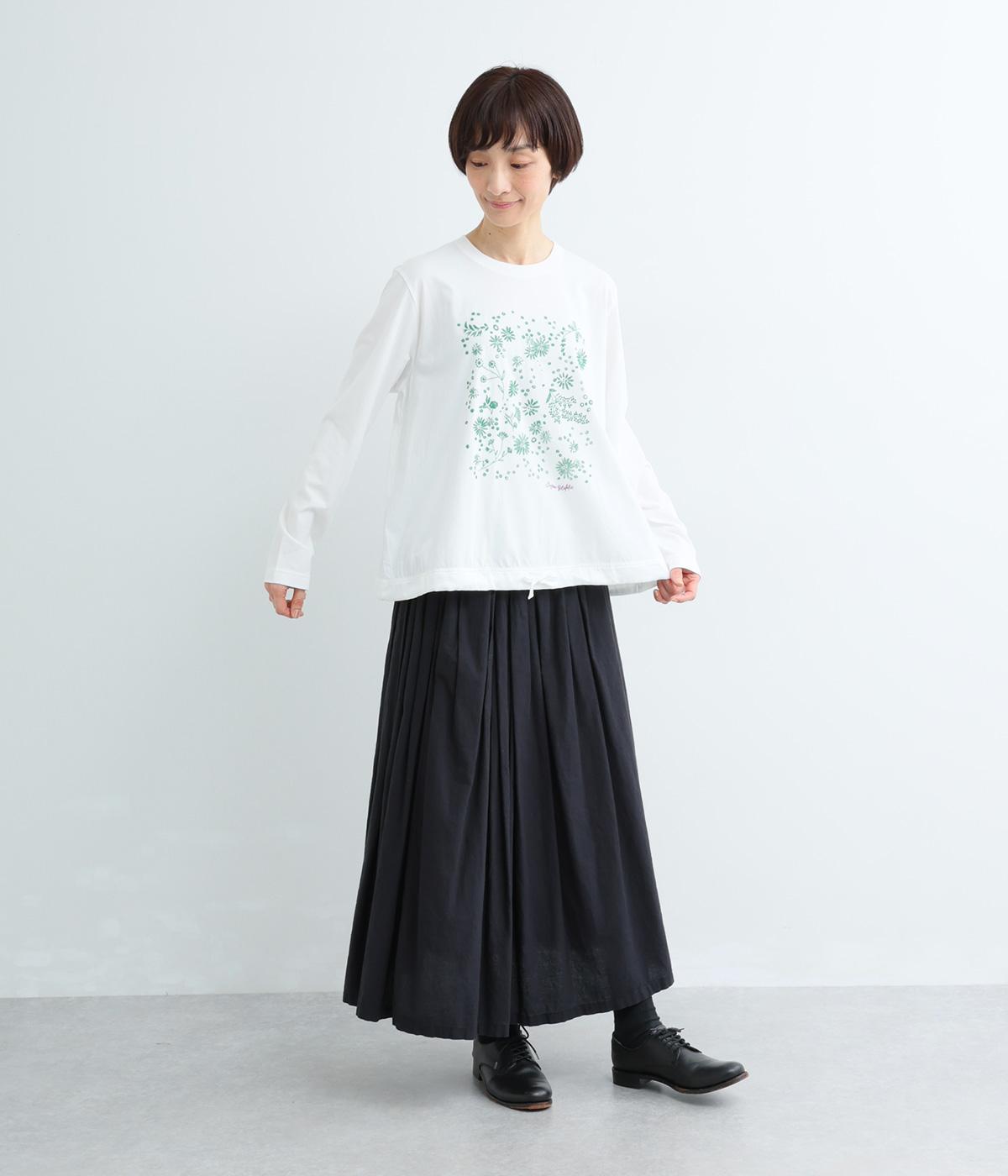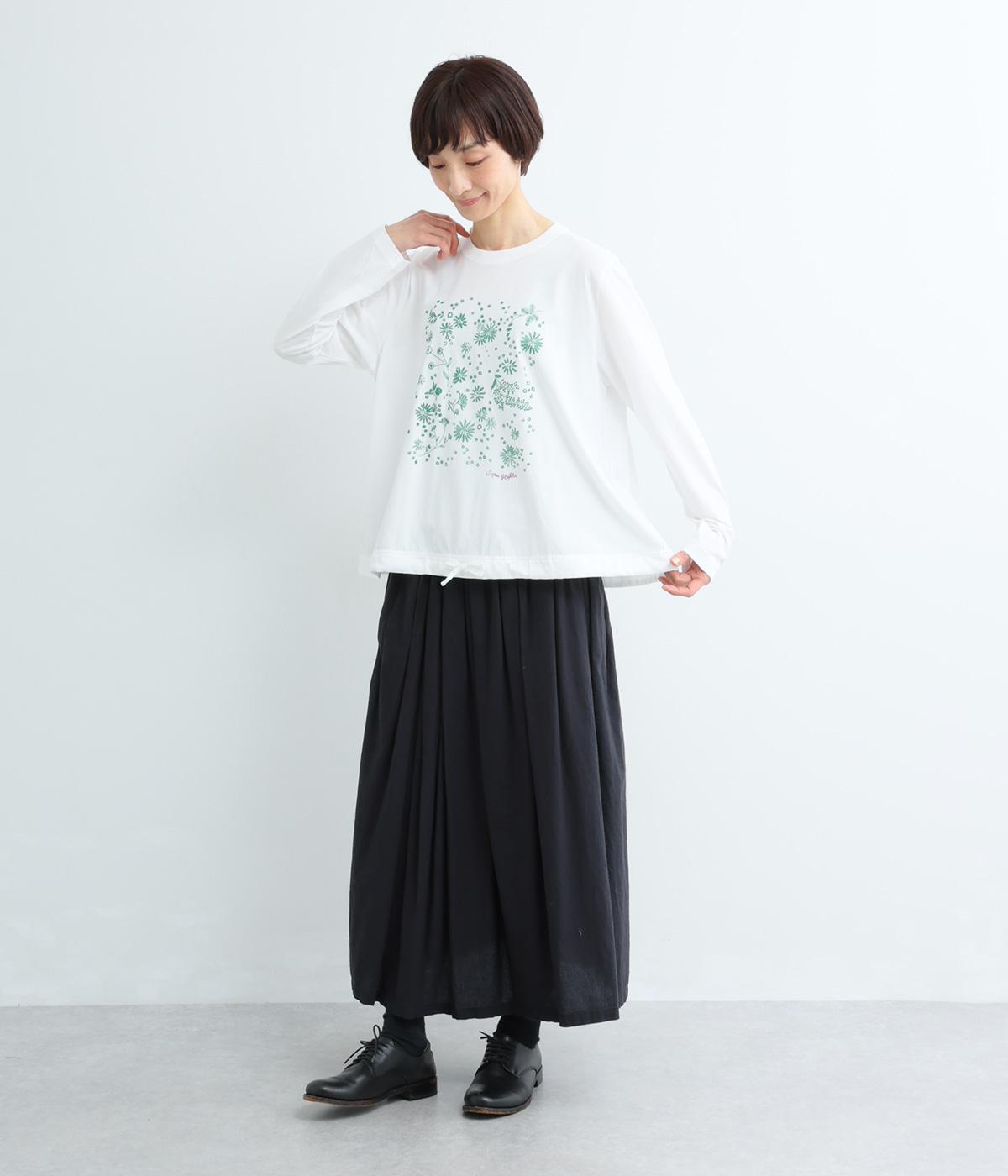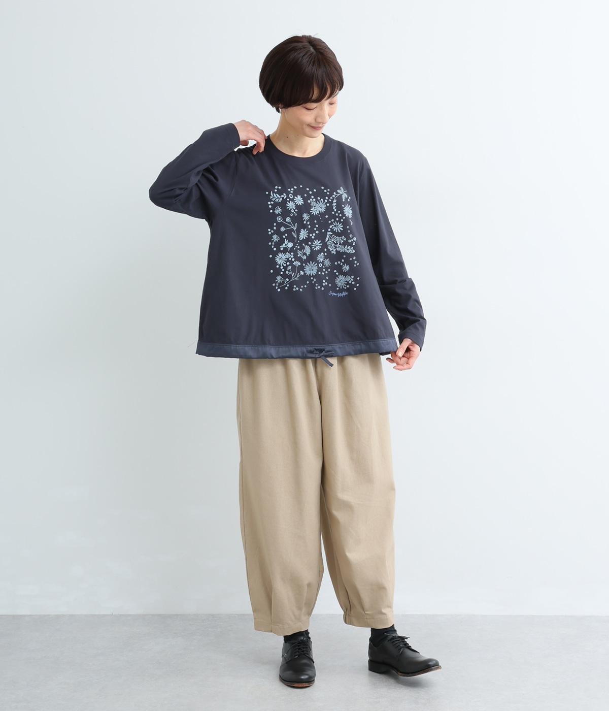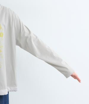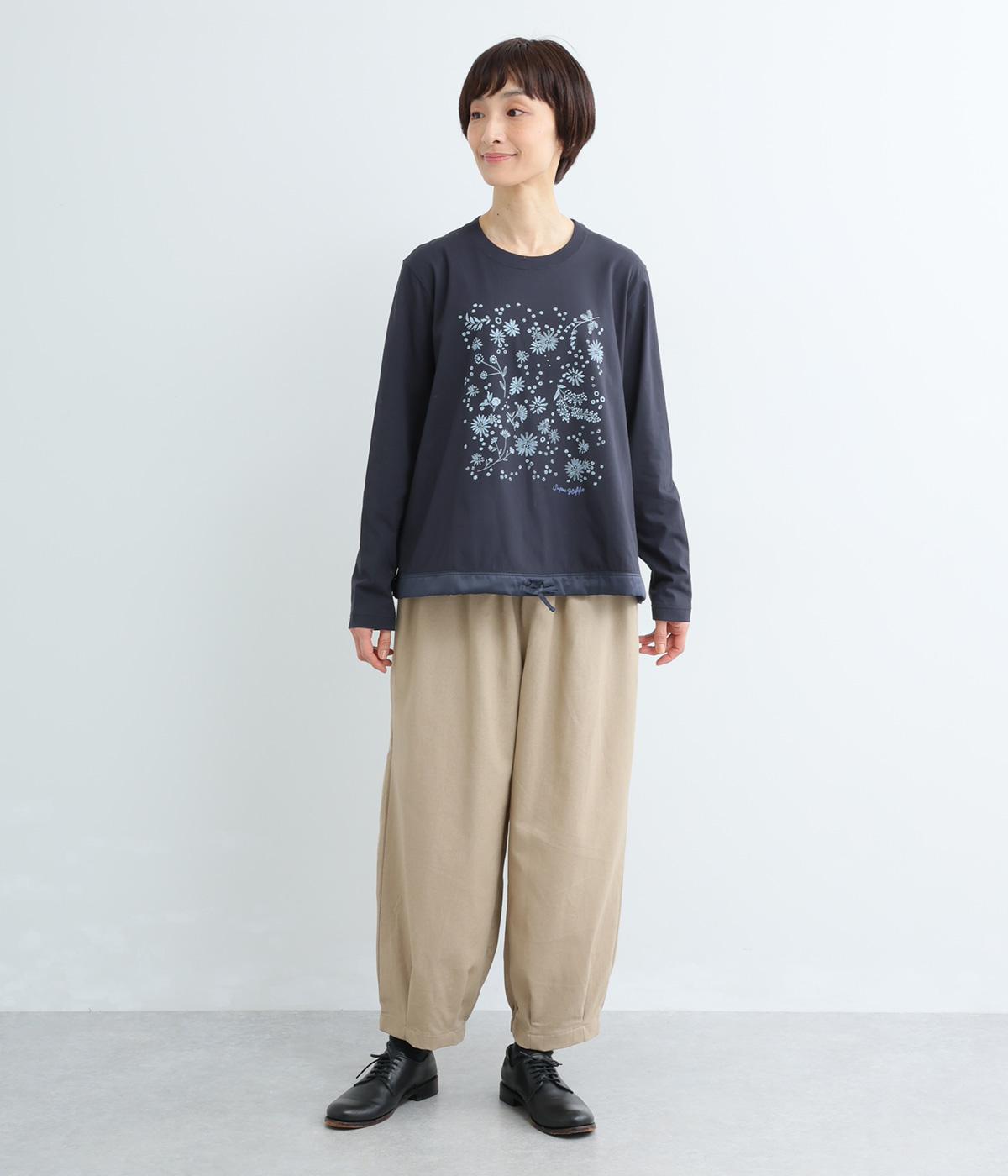 花びらが舞い散るような、フラワーシャワー柄が目をひくデザインです。発泡プリントならではの立体感のある表情が、刺しゅうのような上品さを引き立てます。裾には布帛素材をあしらい、ドローストリングでシルエットの調節も可能。幅広い着こなしがたのしめる一枚です。