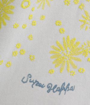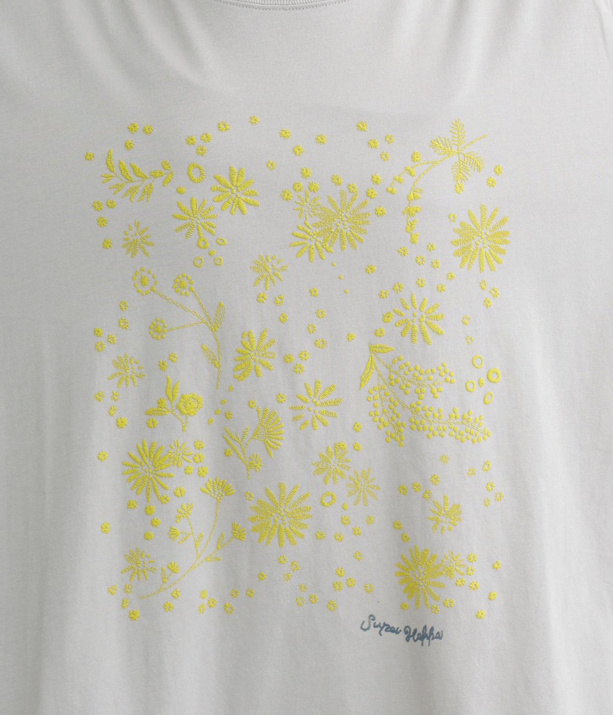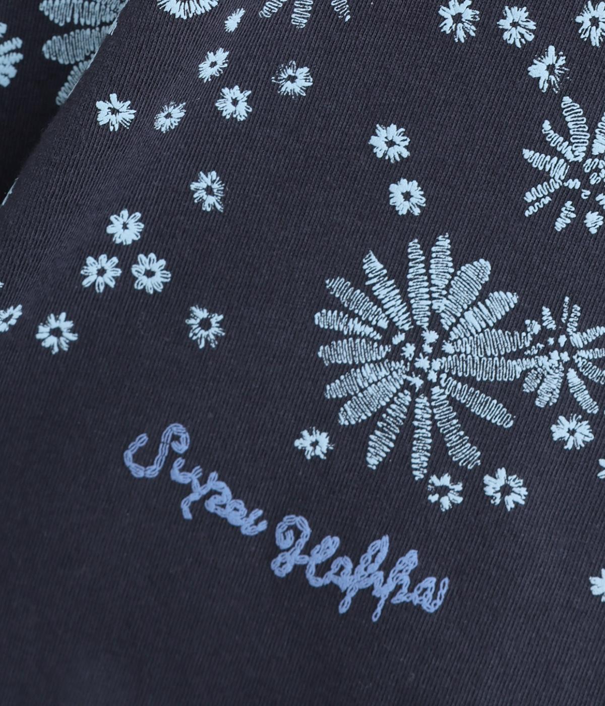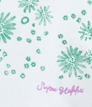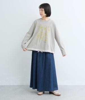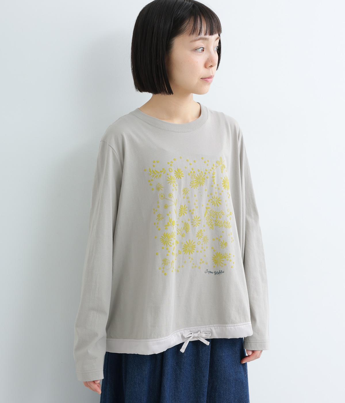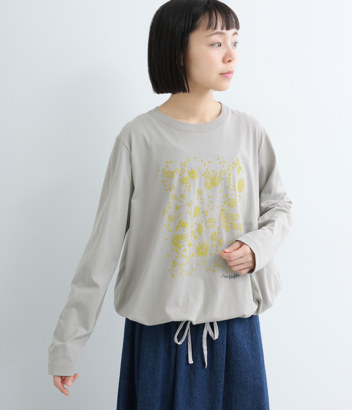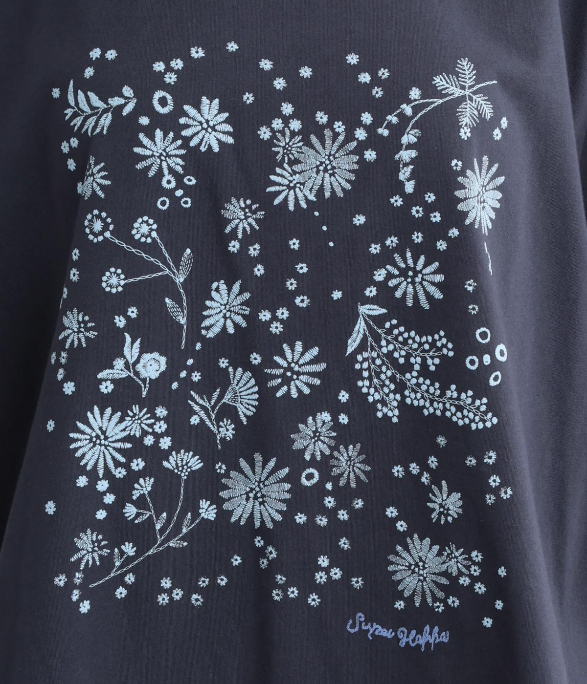 花びらが舞い散るような、フラワーシャワー柄が目をひくデザインです。発泡プリントならではの立体感のある表情が、刺しゅうのような上品さを引き立てます。裾には布帛素材をあしらい、ドローストリングでシルエットの調節も可能。幅広い着こなしがたのしめる一枚です。