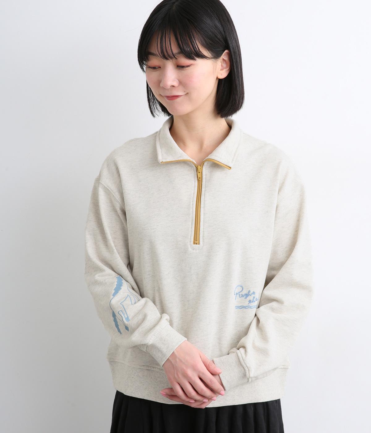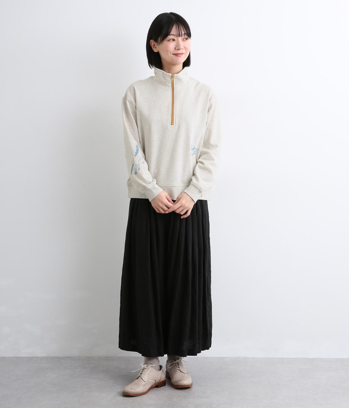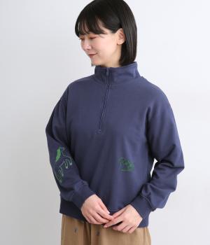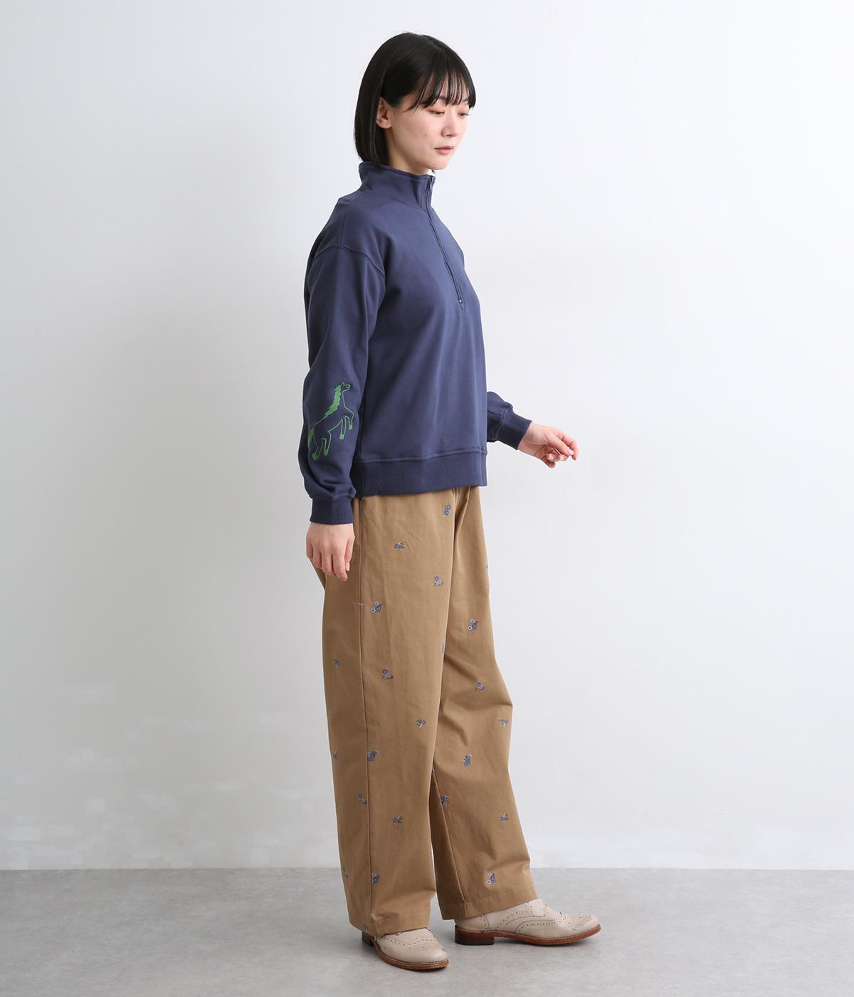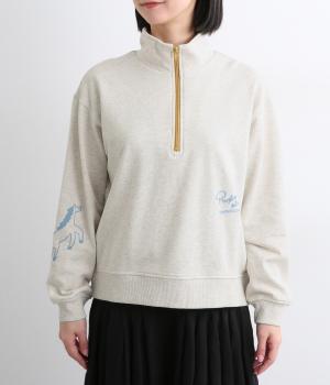 定番のハーフジップに個性的なアクセントを添え、トレンド感のある仕上がりに。ジップを上まで上げてハイネックにしたり、開けて襟を折り返したりと、さまざまな着方を楽しめます。味わい深いHORSE刺しゅうがポイントです。