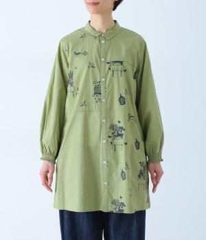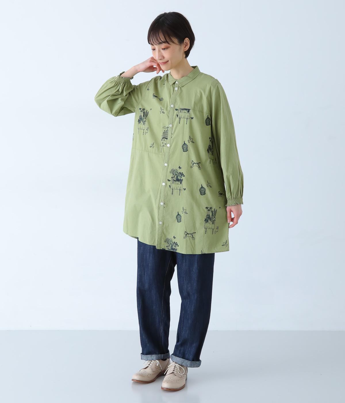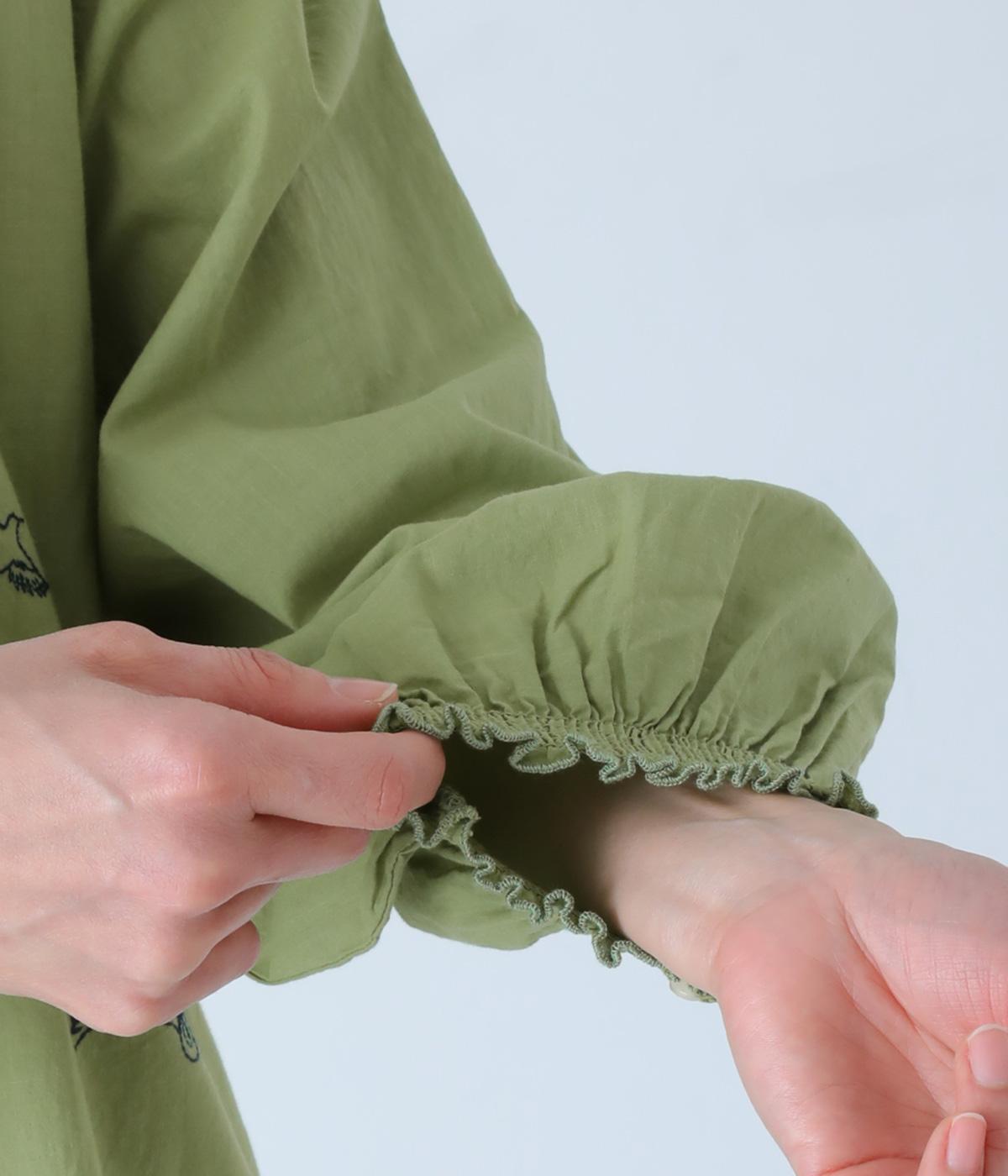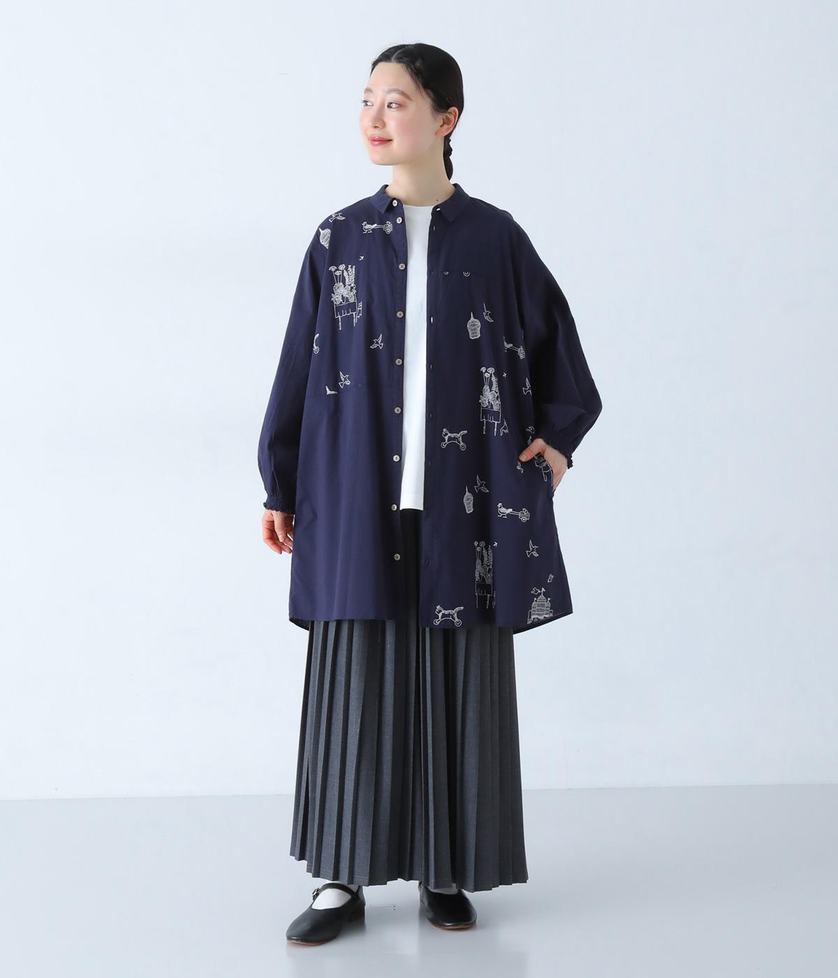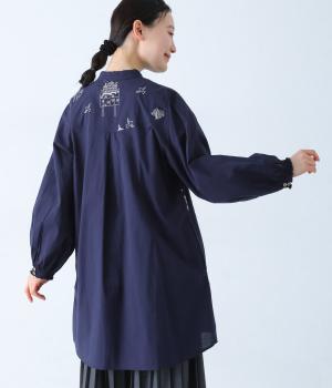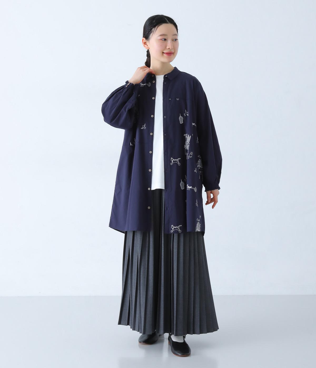 しなやかな手ざわりのコットン生地を使用しています。やさしい肌なじみで軽やかに着ていただけます。単色でステッチのような振り方の総柄刺しゅうを施しました。