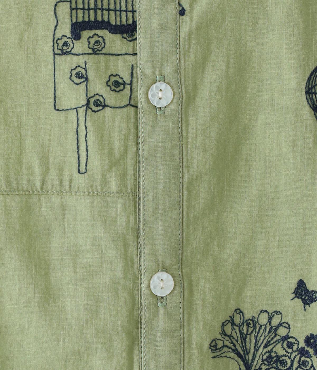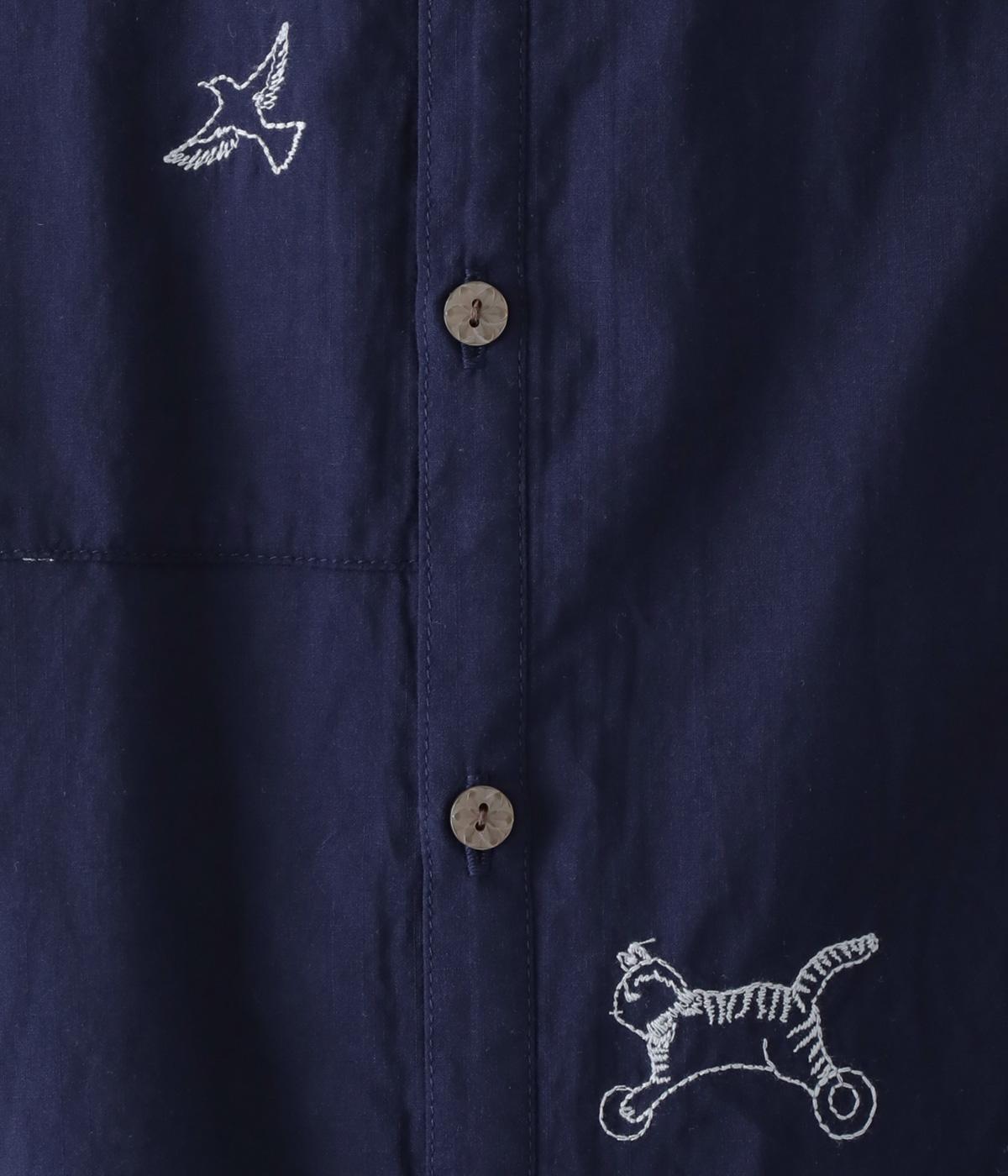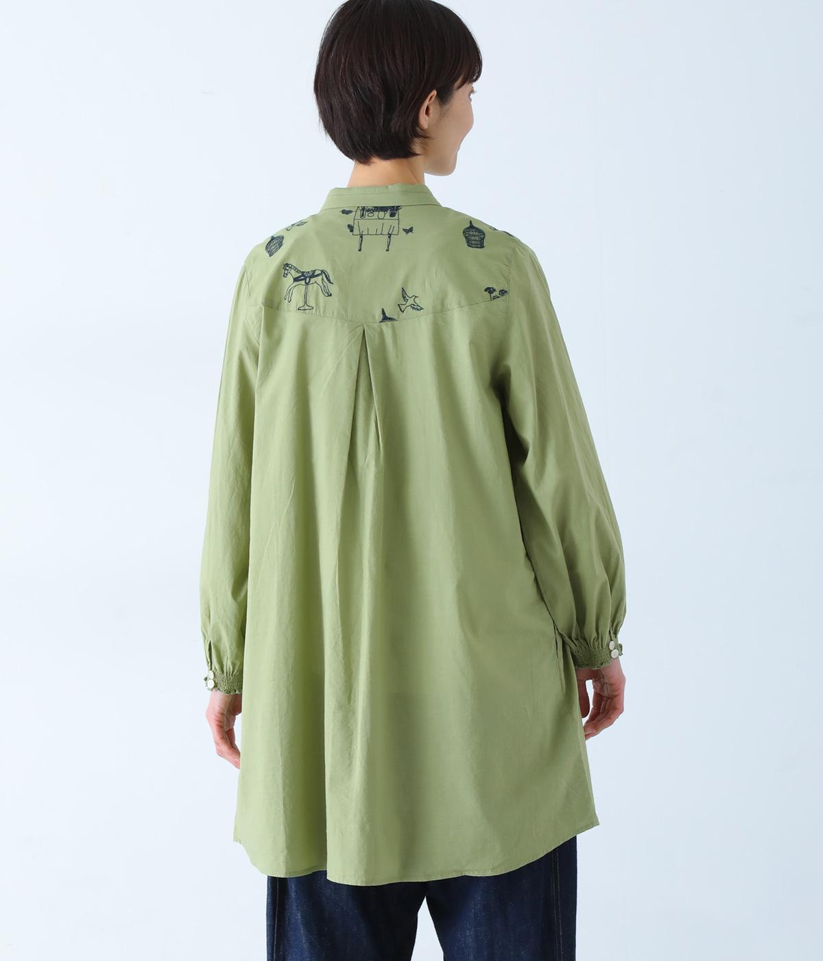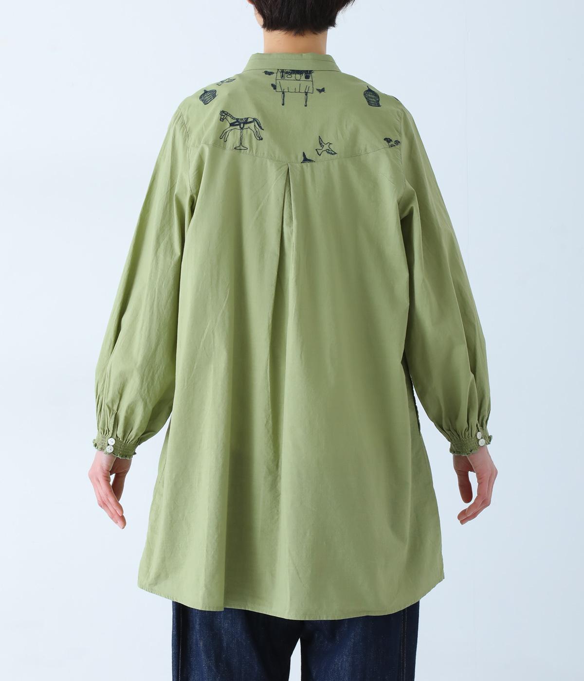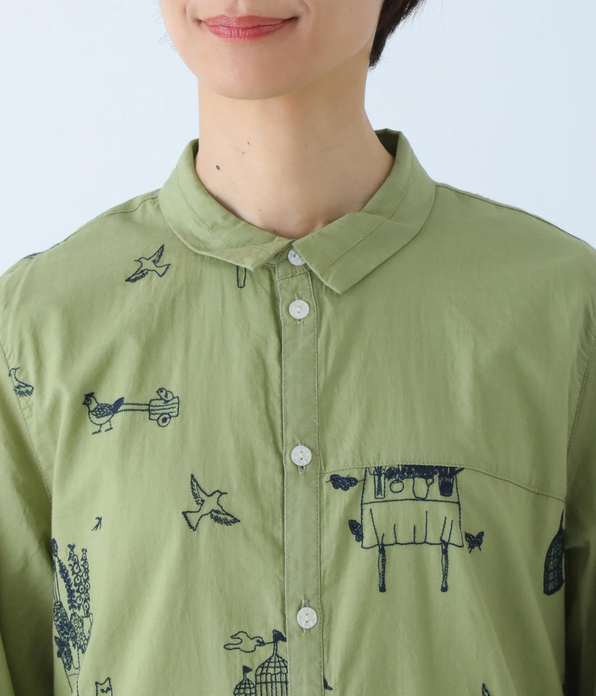 しなやかな手ざわりのコットン生地を使用しています。やさしい肌なじみで軽やかに着ていただけます。単色でステッチのような振り方の総柄刺しゅうを施しました。